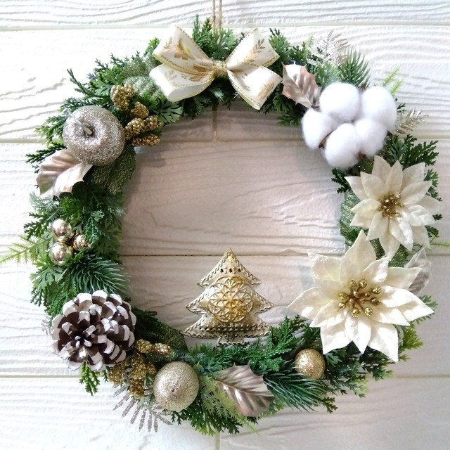 造花(アーティフィシャルフラワー)でできた大きめなクリスマスリースです! ポインセチア、コットン、リンゴ、松ぼっくりと葉っぱをギュッと詰ったエレガントなリースです(*^^*) ゴールドが所々に入っていますので華やかさもあります♪ クリスマスツリーがポイントになっています! 軽いので画ビョウ1個で飾ることができます。 プレゼント、引っ越し祝いにもオススメです! サイズ 直径 約29㎝ 材質 造花 木 松ぼっくり コットン ブリキ クリスマス クリスマスリース クリスマスギフト xmas パーティー クリスマスパーティー フラワーリース インテリア 開店祝い 新築祝い 冬 ギフト プレゼント クリスマスツリー ツリー