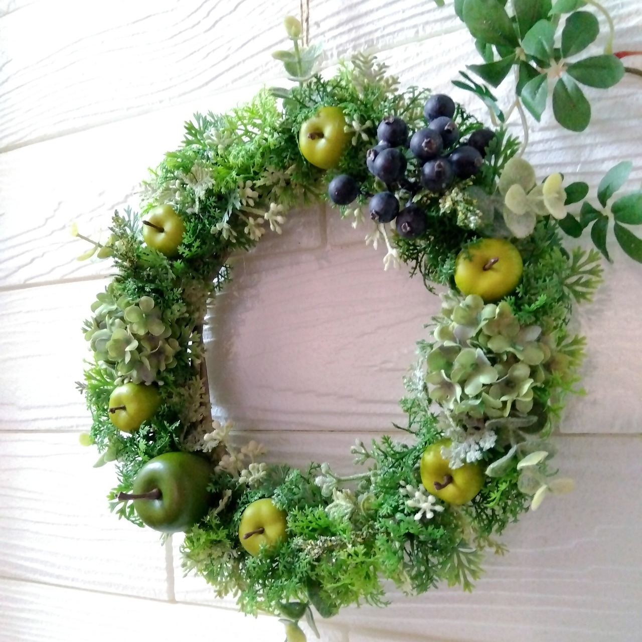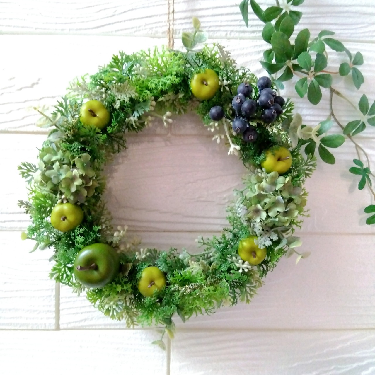 グリーンを基調にグリーンアップルやスノーボール、ユーカリ、ブルーベリーなどがギュッと詰まった爽やかなリースです。