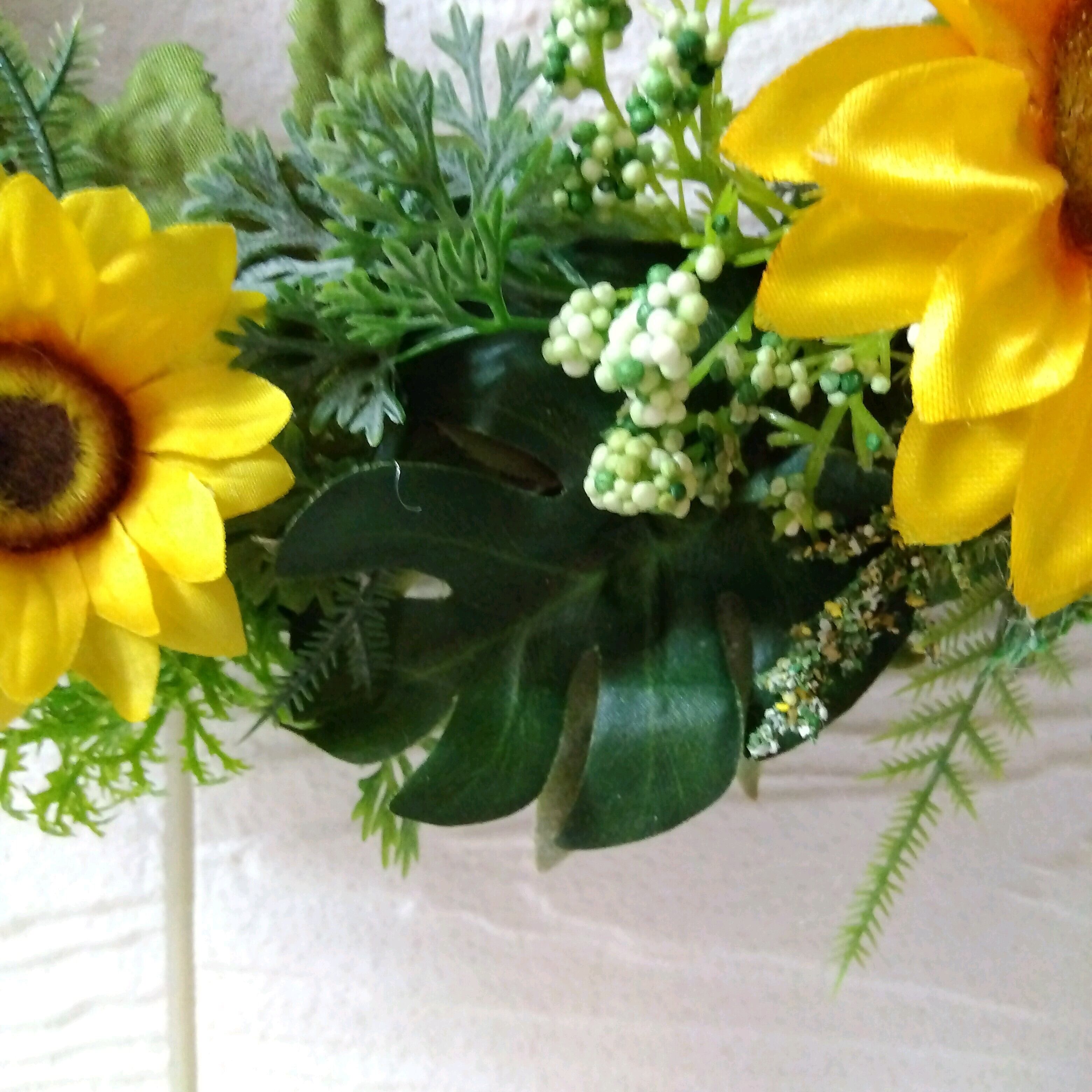 大小のひまわりを仕様し、モンステラやベリー、小花、沢山のグリーンを入った、可愛らしく爽やかに仕上りのリースです!