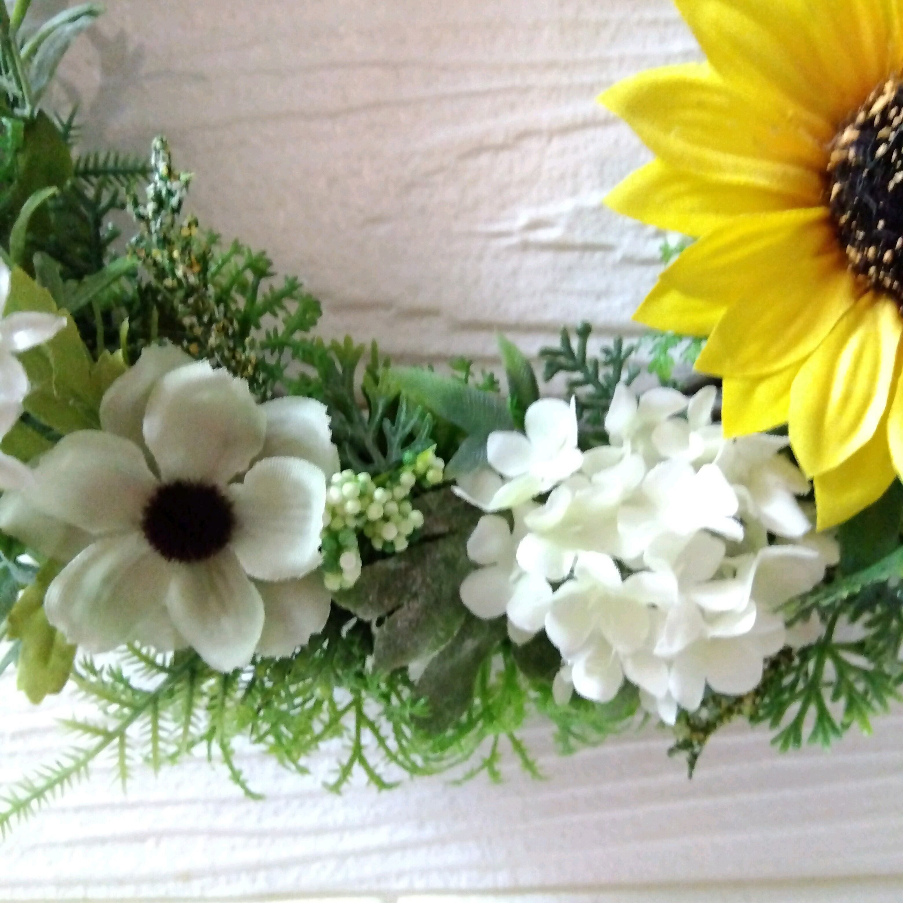 大小のひまわりをポイントにラベンダーや小花、グリーン、スノーボールなどがギュッと詰まった爽やかな仕上がりのリースです(*^^*)