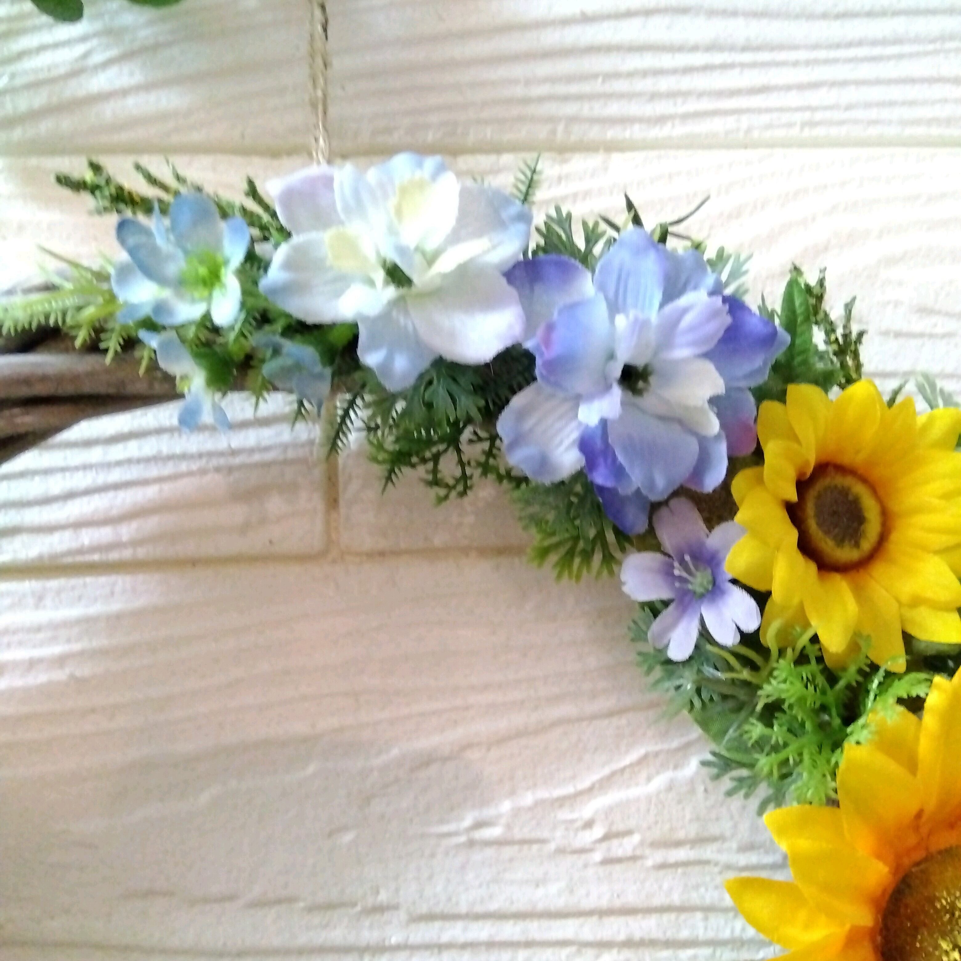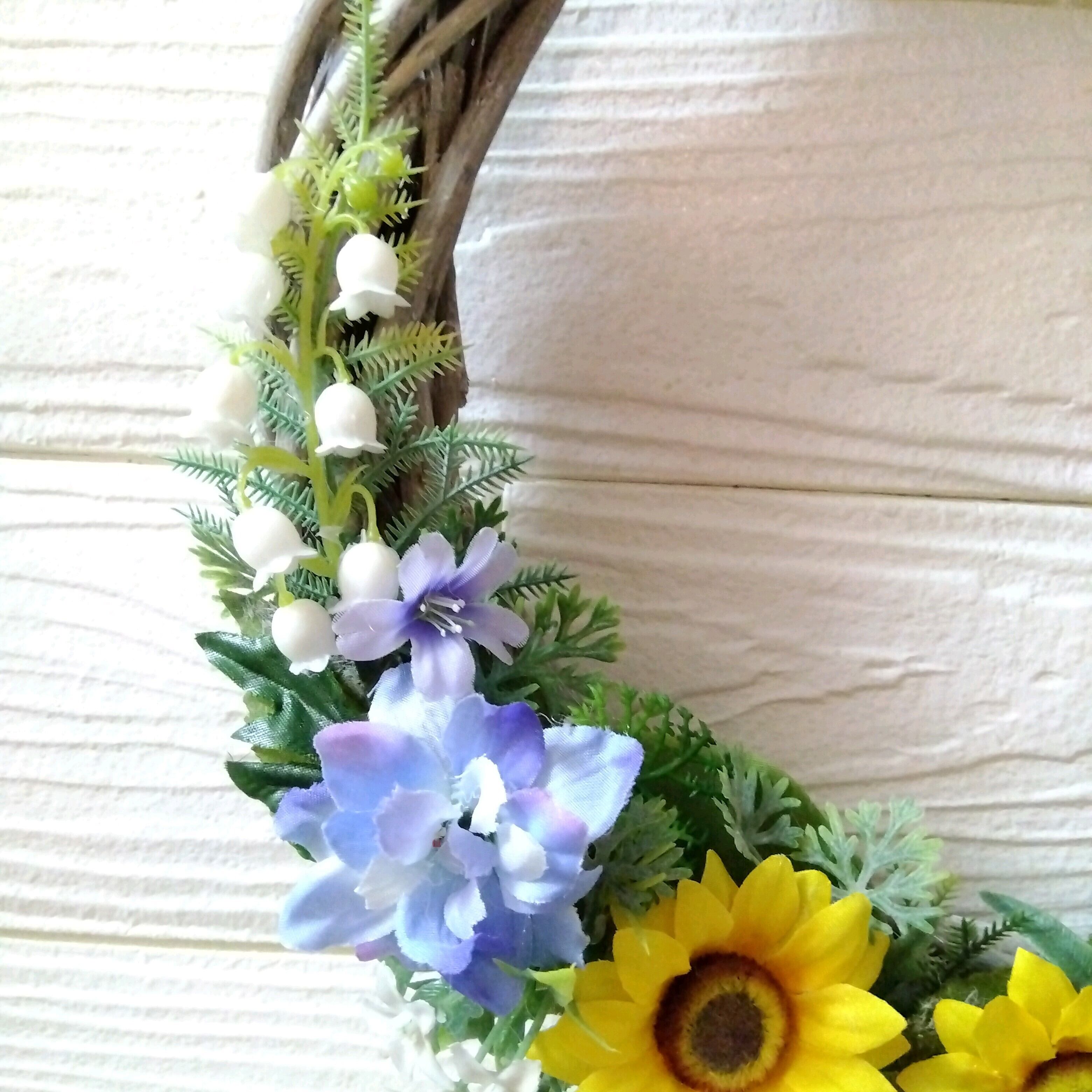 大きめ ひまわり と デルフィニューム スズラン の サマーリース クレッセント 30cm