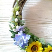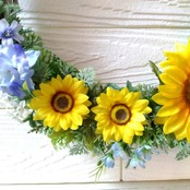 大小のひまわりを仕様し、デルフィニュームやスズラン、小花、沢山のグリーンが入った、可愛らしく爽やかなリースです。