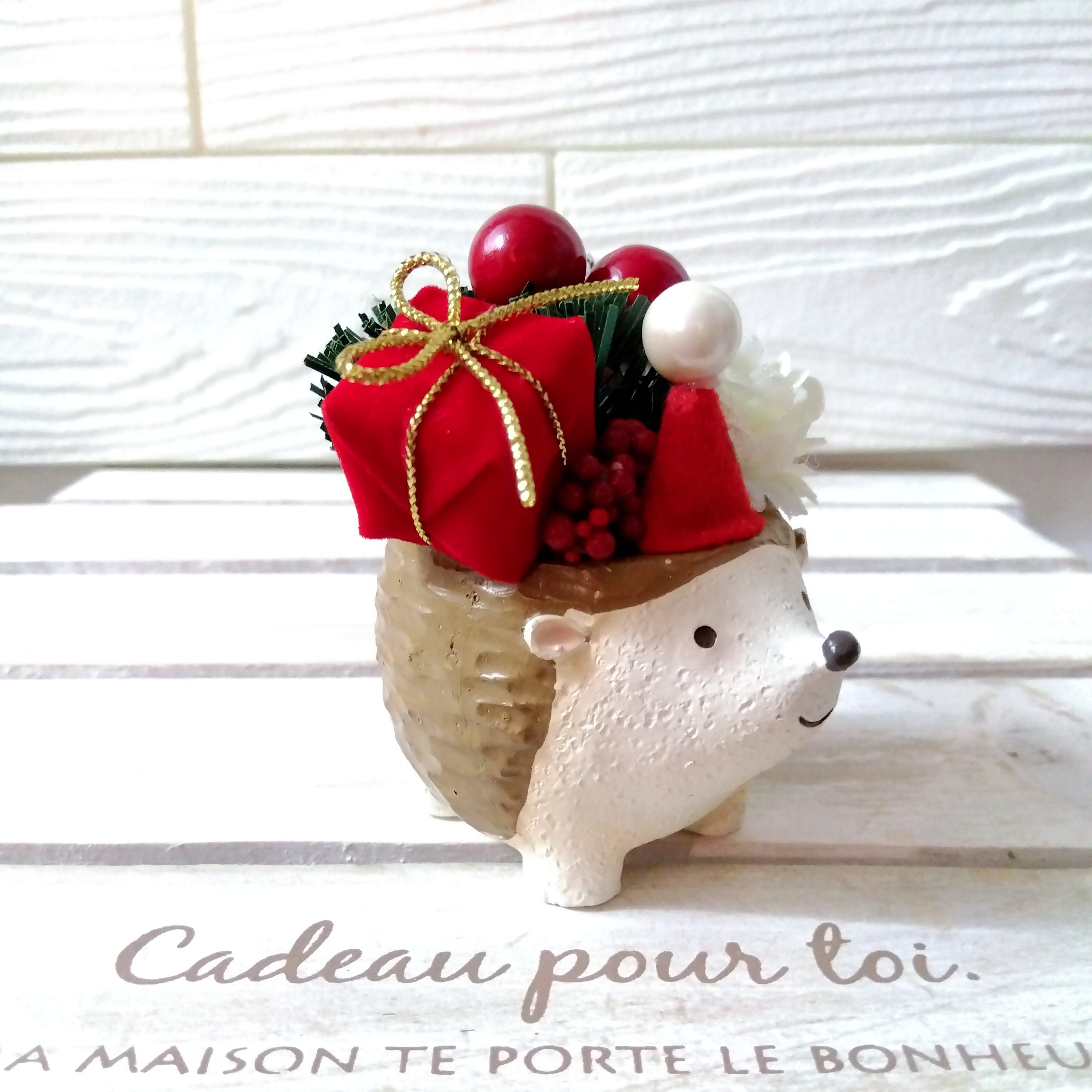 アニマル の背中にプレゼントや松ぼっくり、小さなお花がギュッと詰まった商品です。