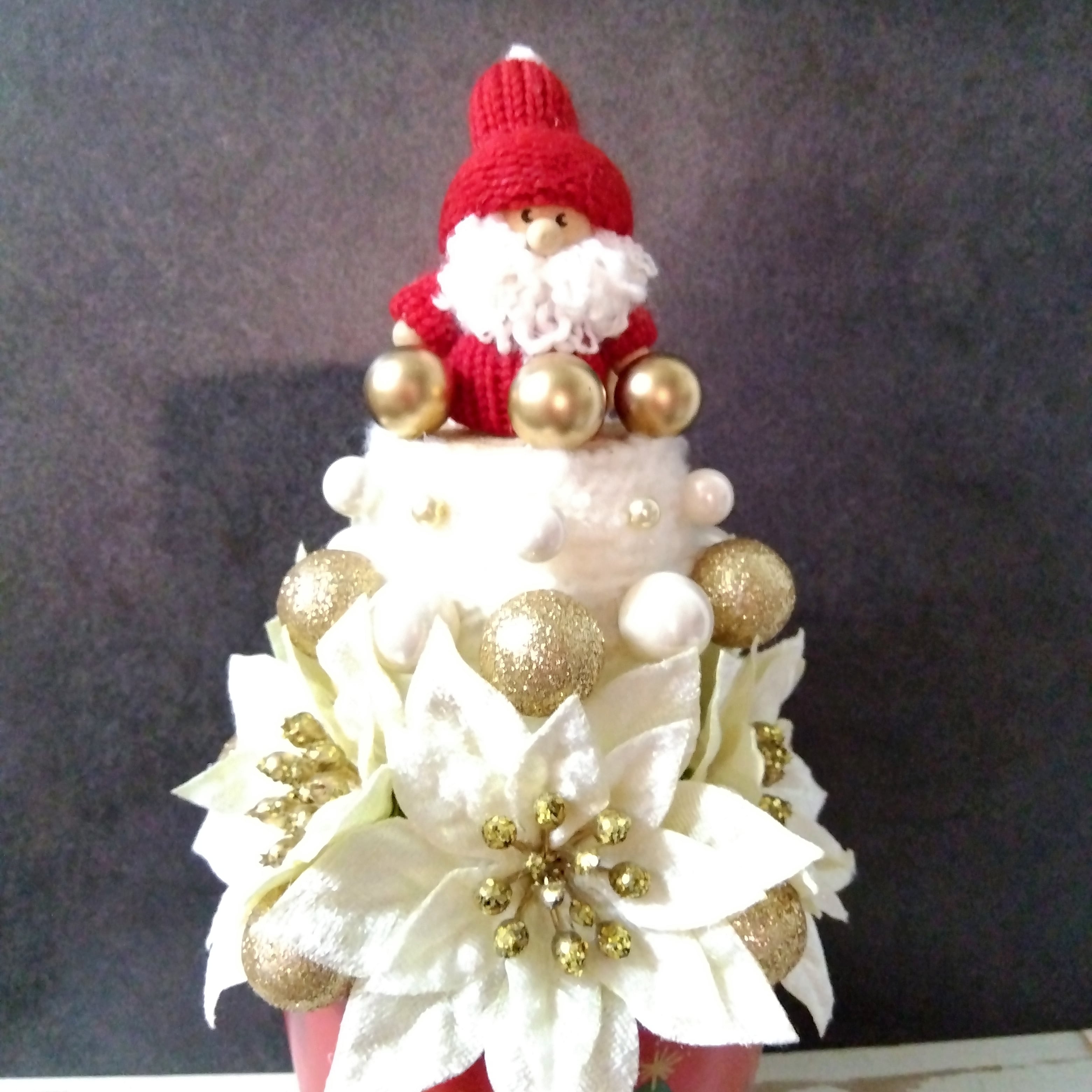 赤と白を基調とし、ポインセチアをあしらったツリーの上にかわいいサンタを乗せて可愛らしく仕上げました(^-^)。