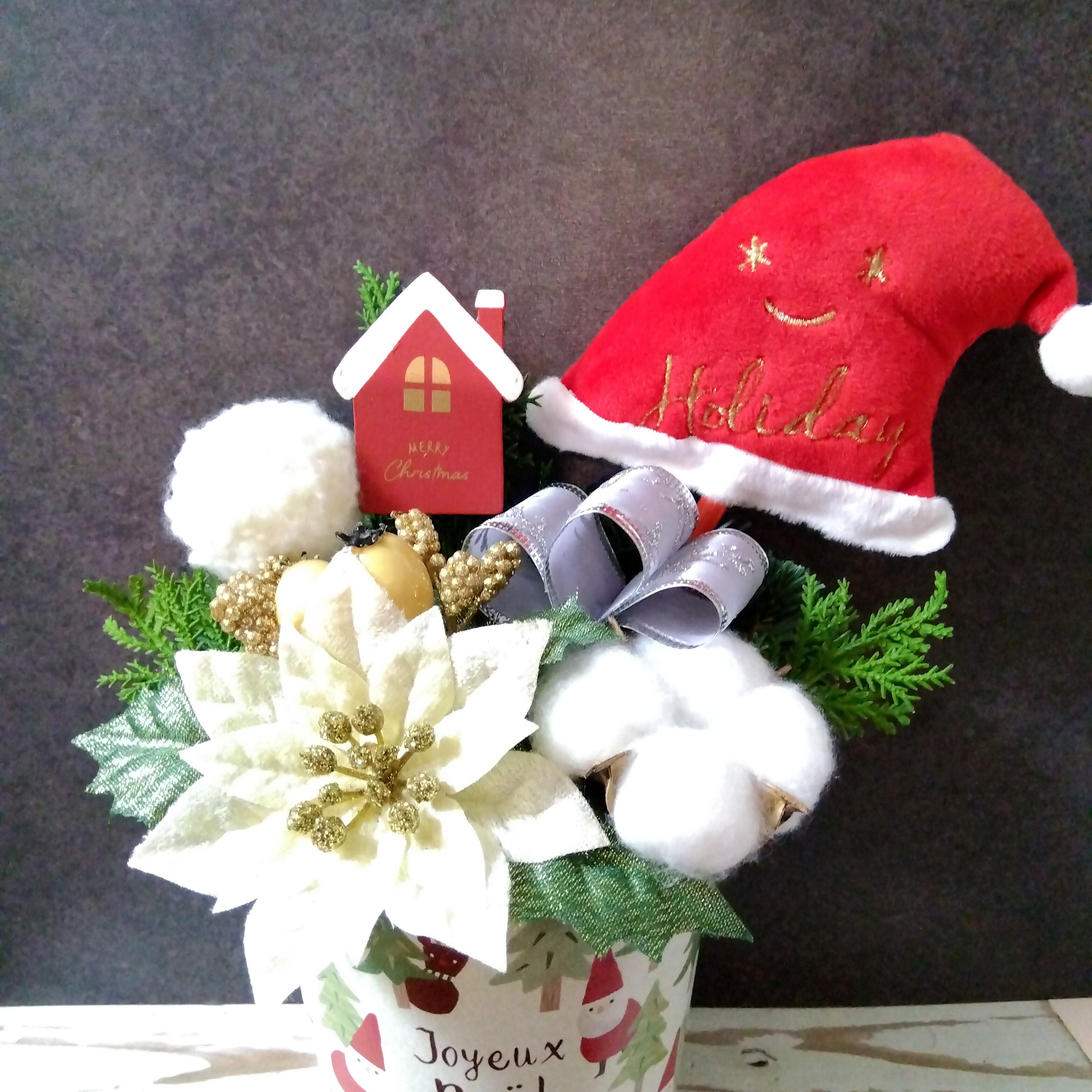 xmas クリスマスフラワーアレンジ 北欧 ポインセチアとサンタの帽子