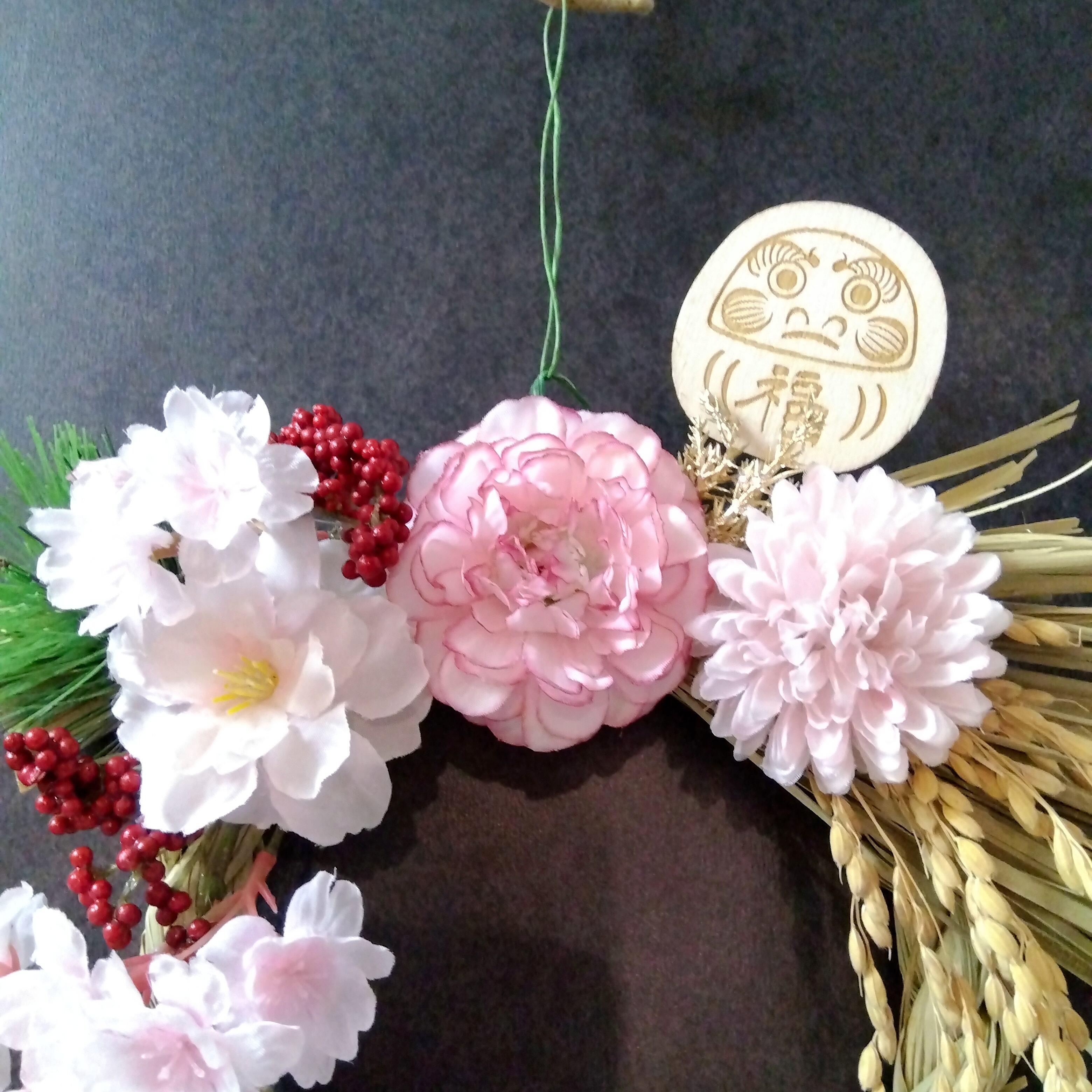 ピンクを基調に、ダリアや桜、松、マムを使用した、柔らかな色あいのかわいらしく華やかなお正月飾りです(*^^*)