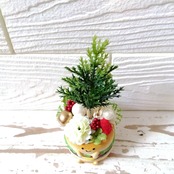 かわいいハンバーガーの器にプレゼントや松ぼっくり、小さなお花がギュッと詰まった商品とクリスマスツリーアレンジの2種類です。