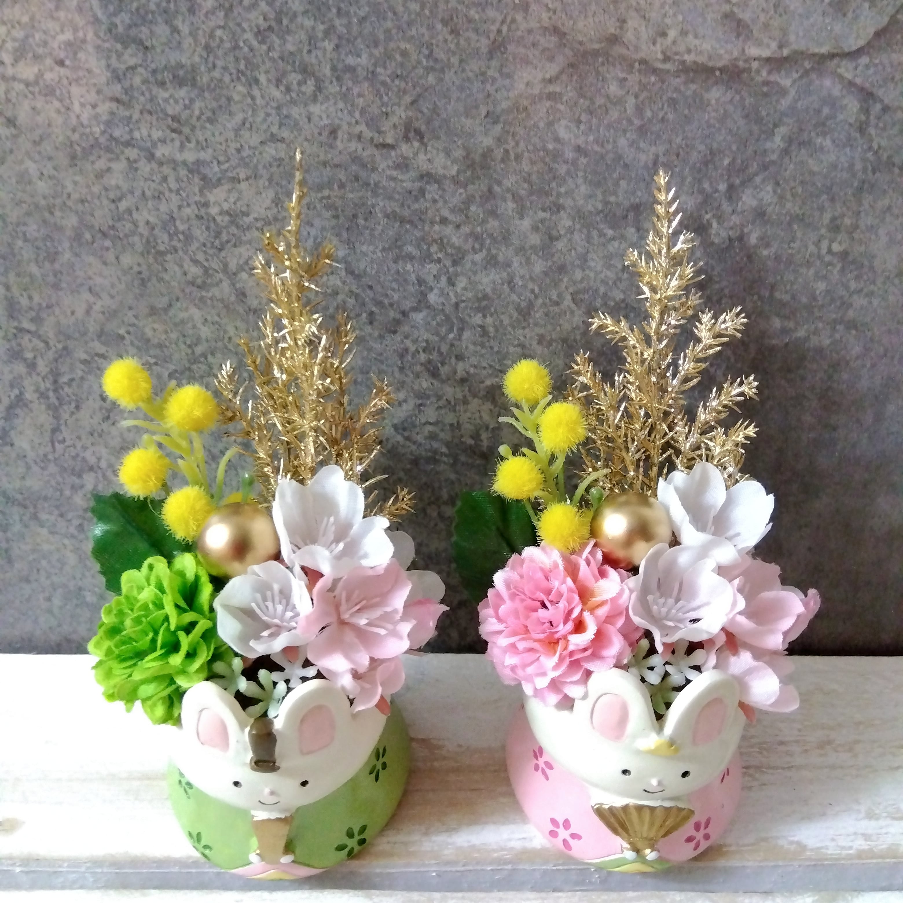 かわいいウサギの器に桜、ミモザや小花をギュッと詰まった可愛らしい仕上りの商品です。