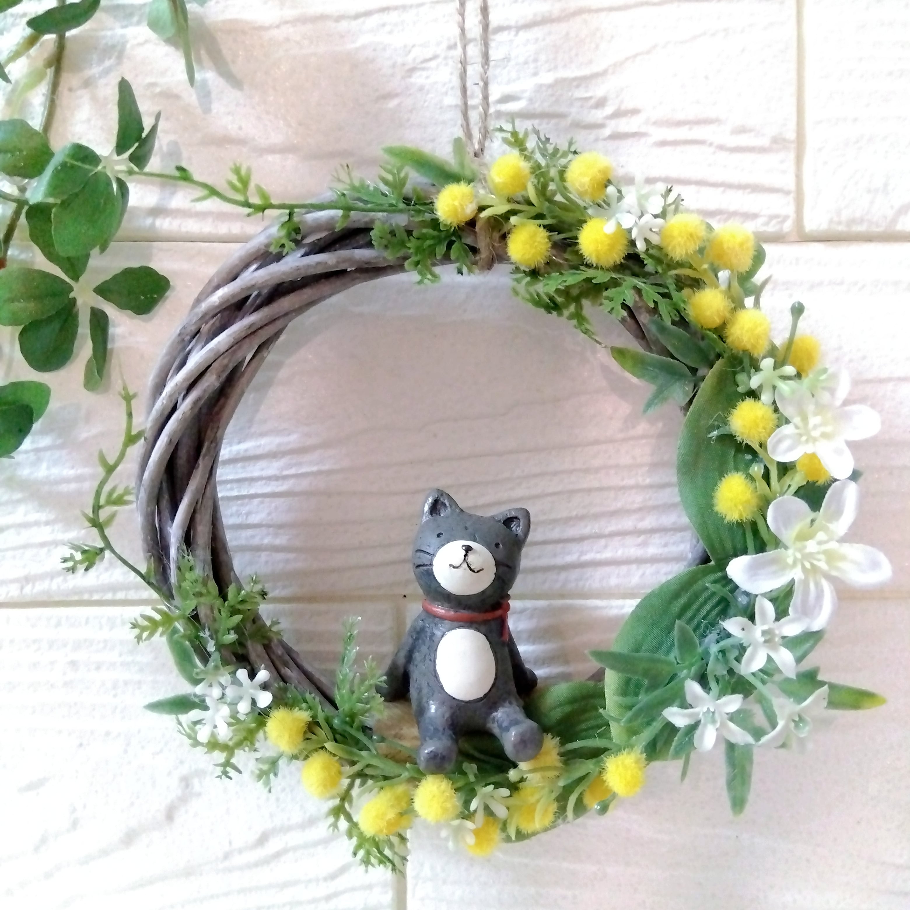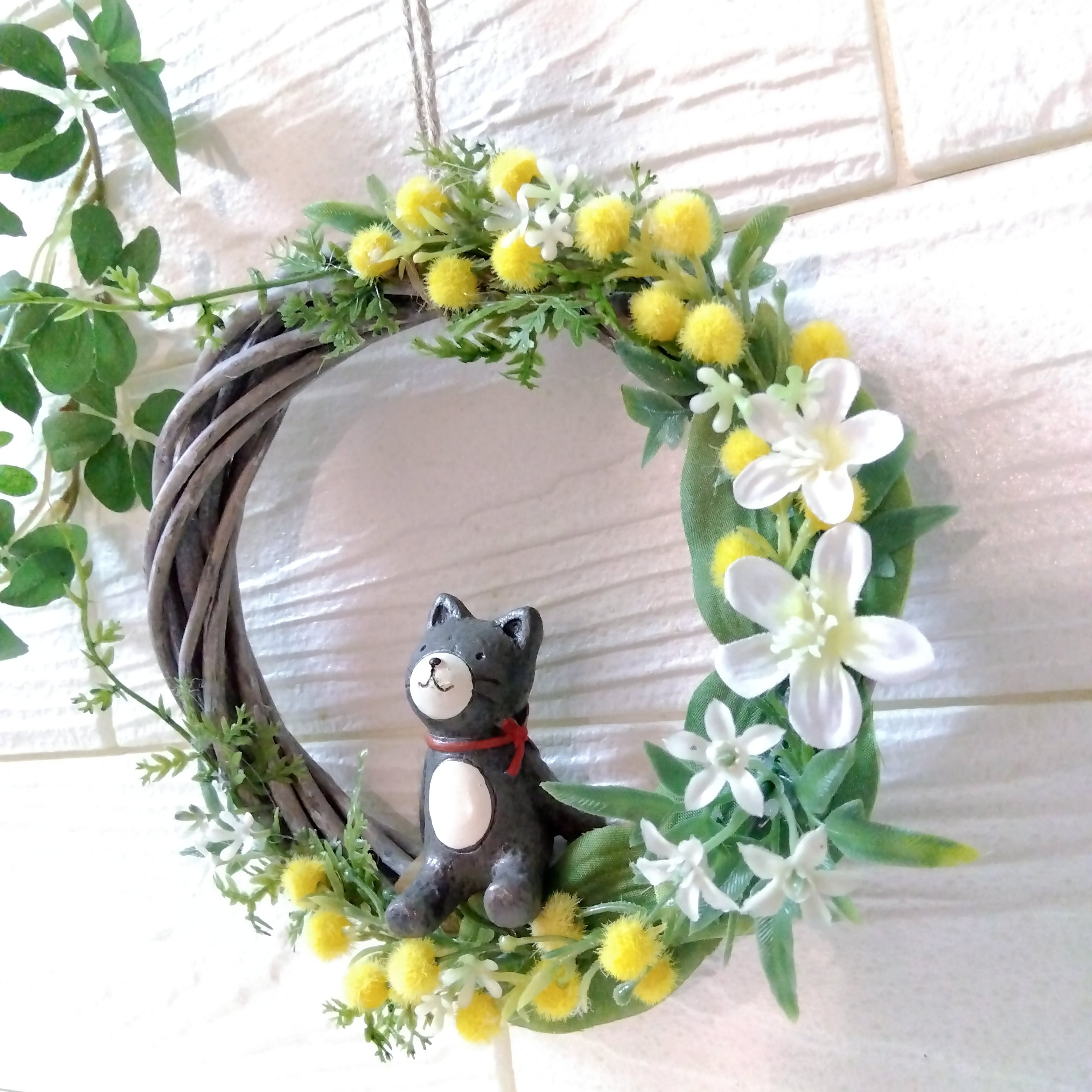 マスコット付きリース ミモザ クレッセント ネコ