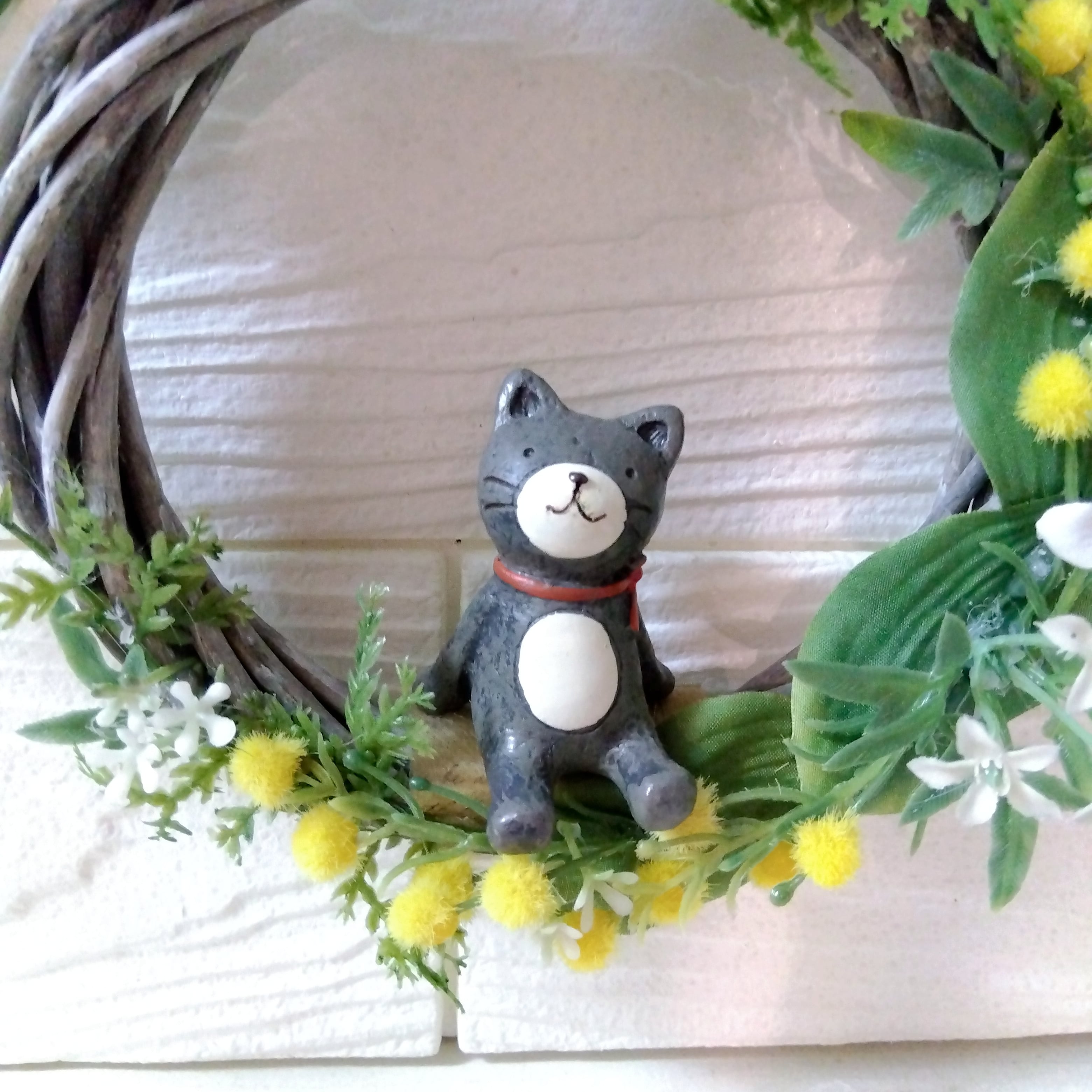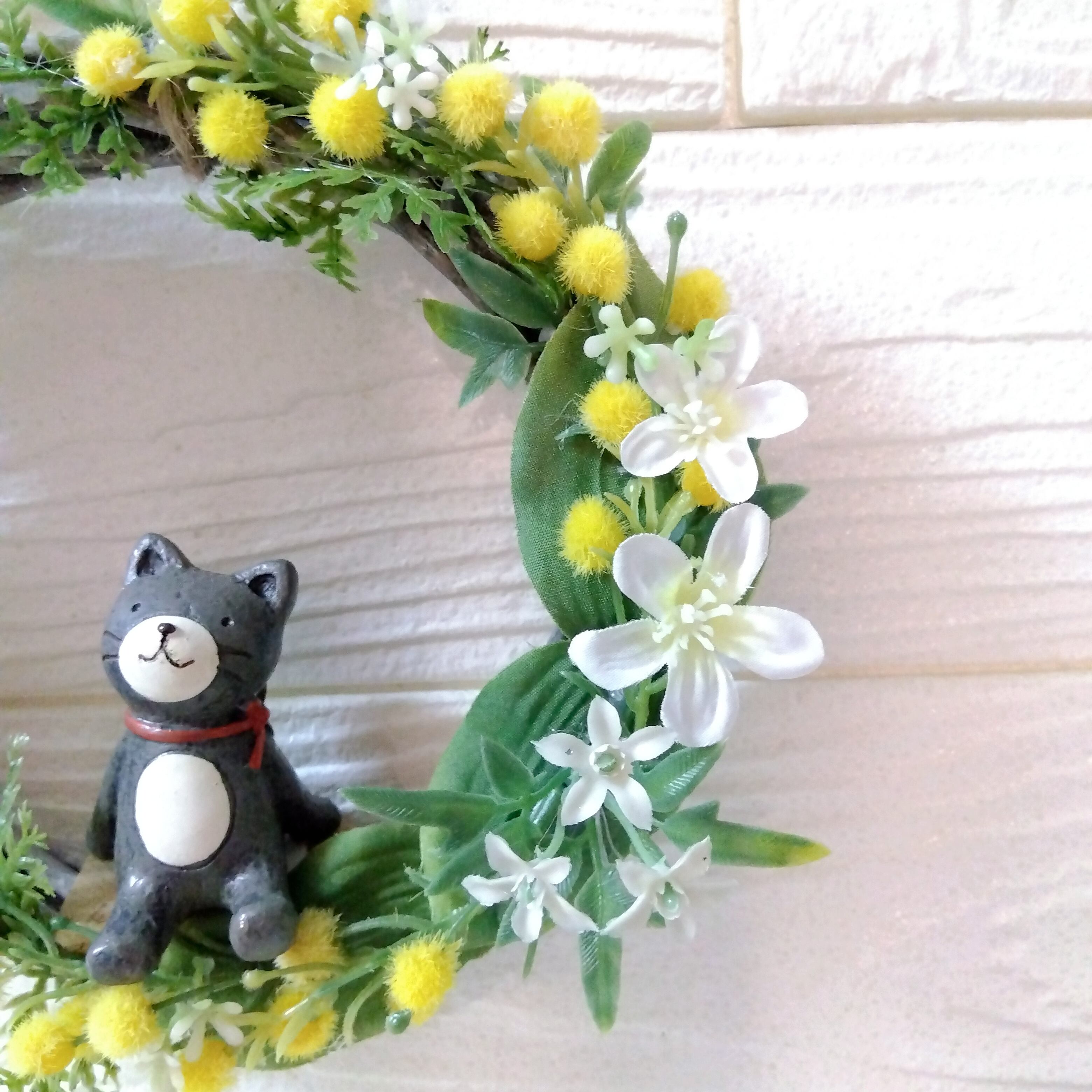 リース アーティフィシャルフラワー 壁かけ インテリア ギフト プレゼント 母の日 誕生日 送別品 結婚式 結婚祝い 出産祝い 開店祝い 祝い 敬老の日 ミモザ 春 ネコ ねこ 猫 黒ネコ 黒猫
