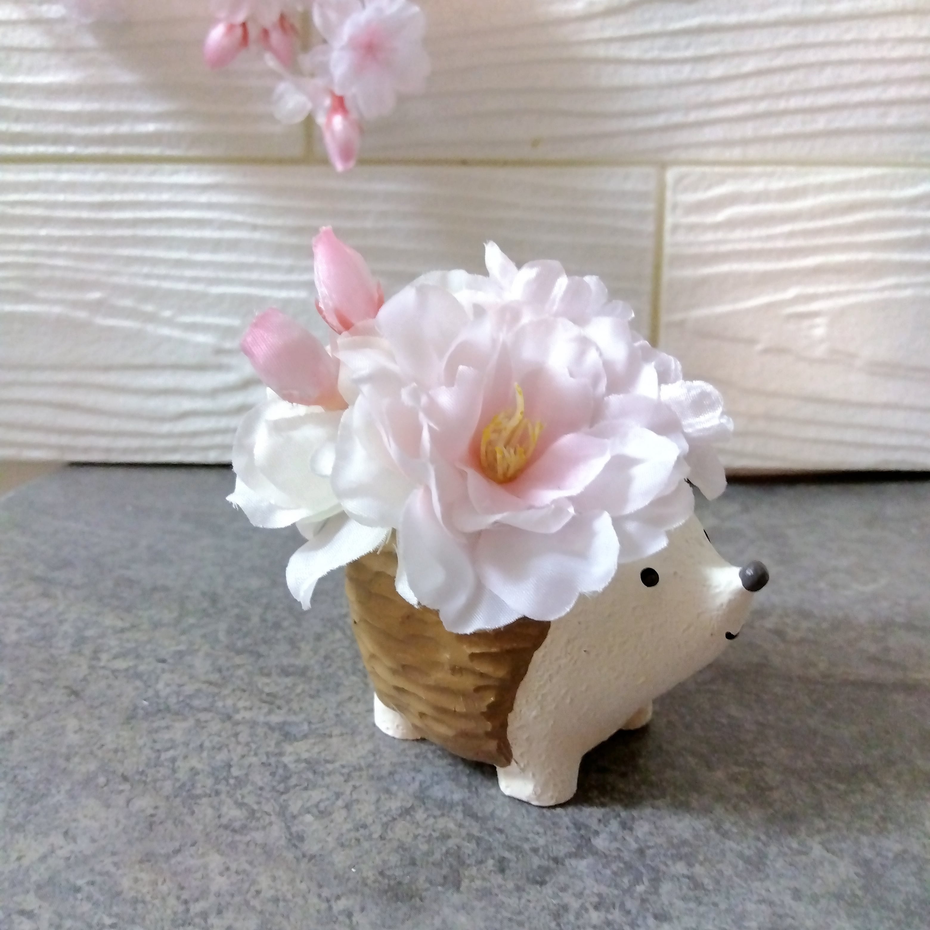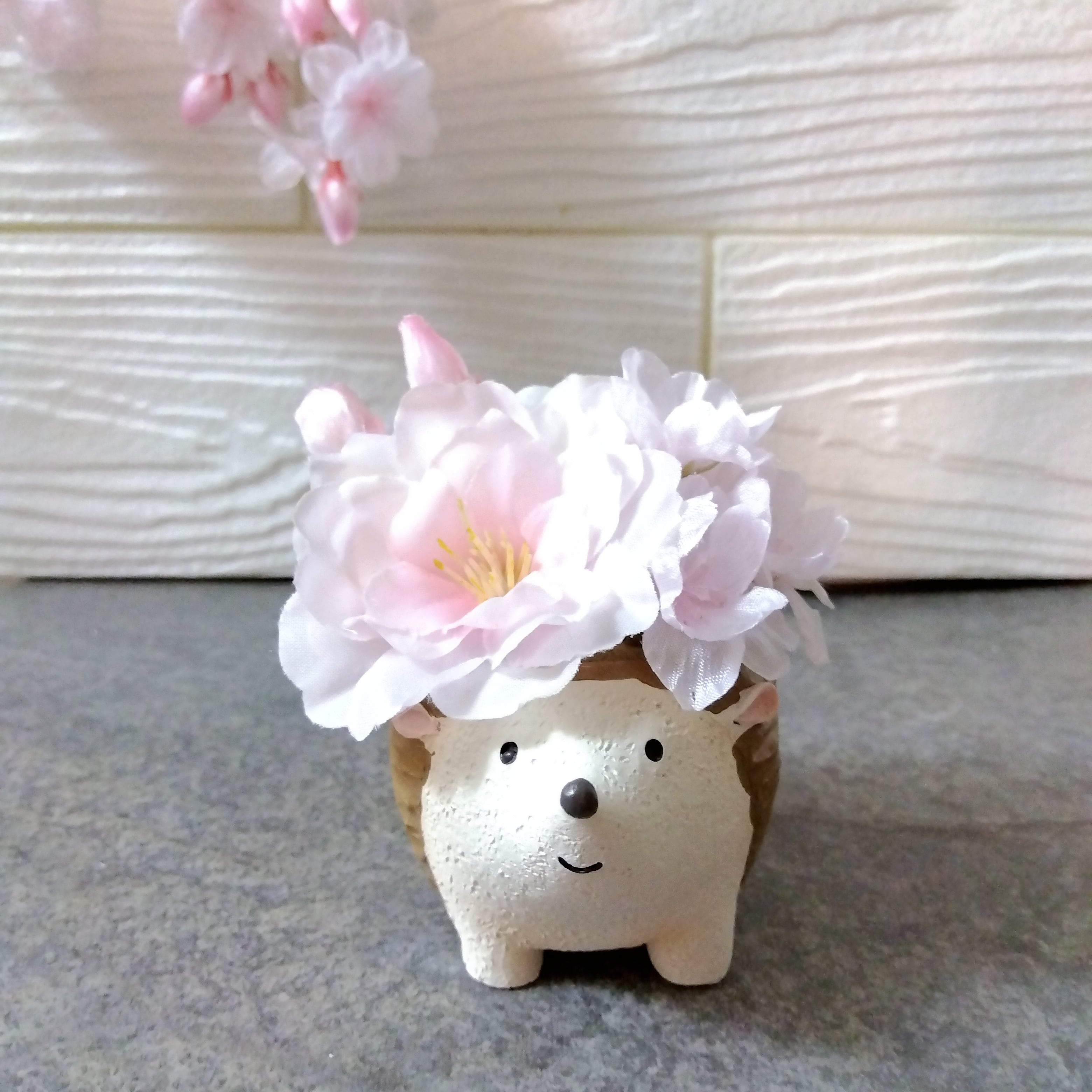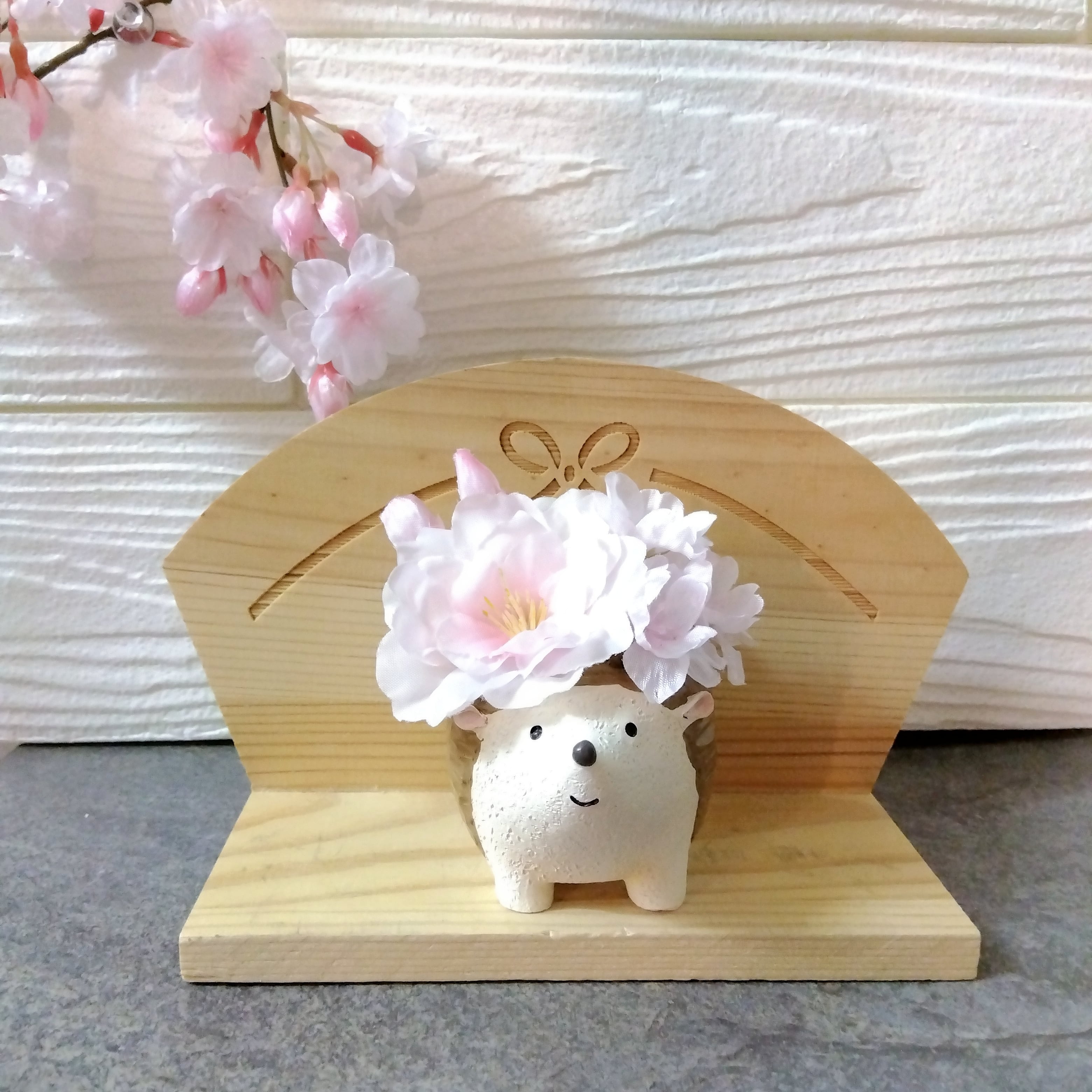 可愛らしいアニマルの背中に大小のサクラ、アジサイをアレンジしたお花がギュッと詰まった商品です。