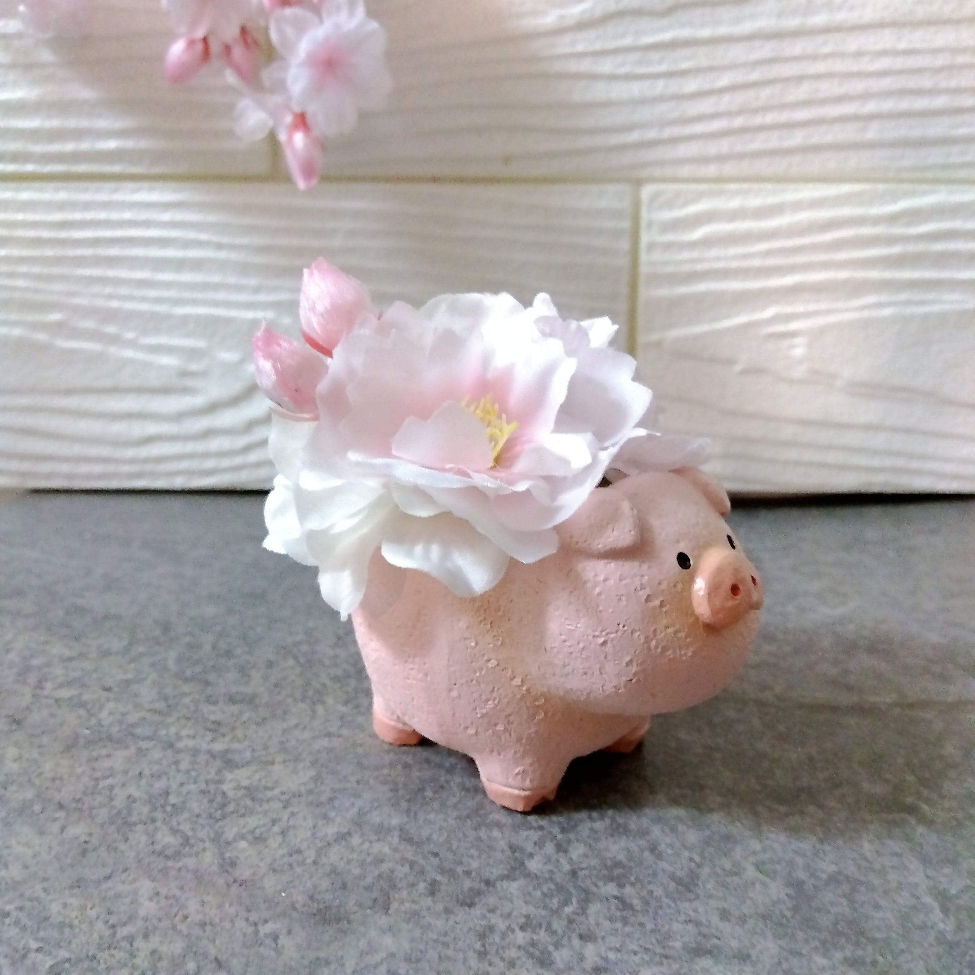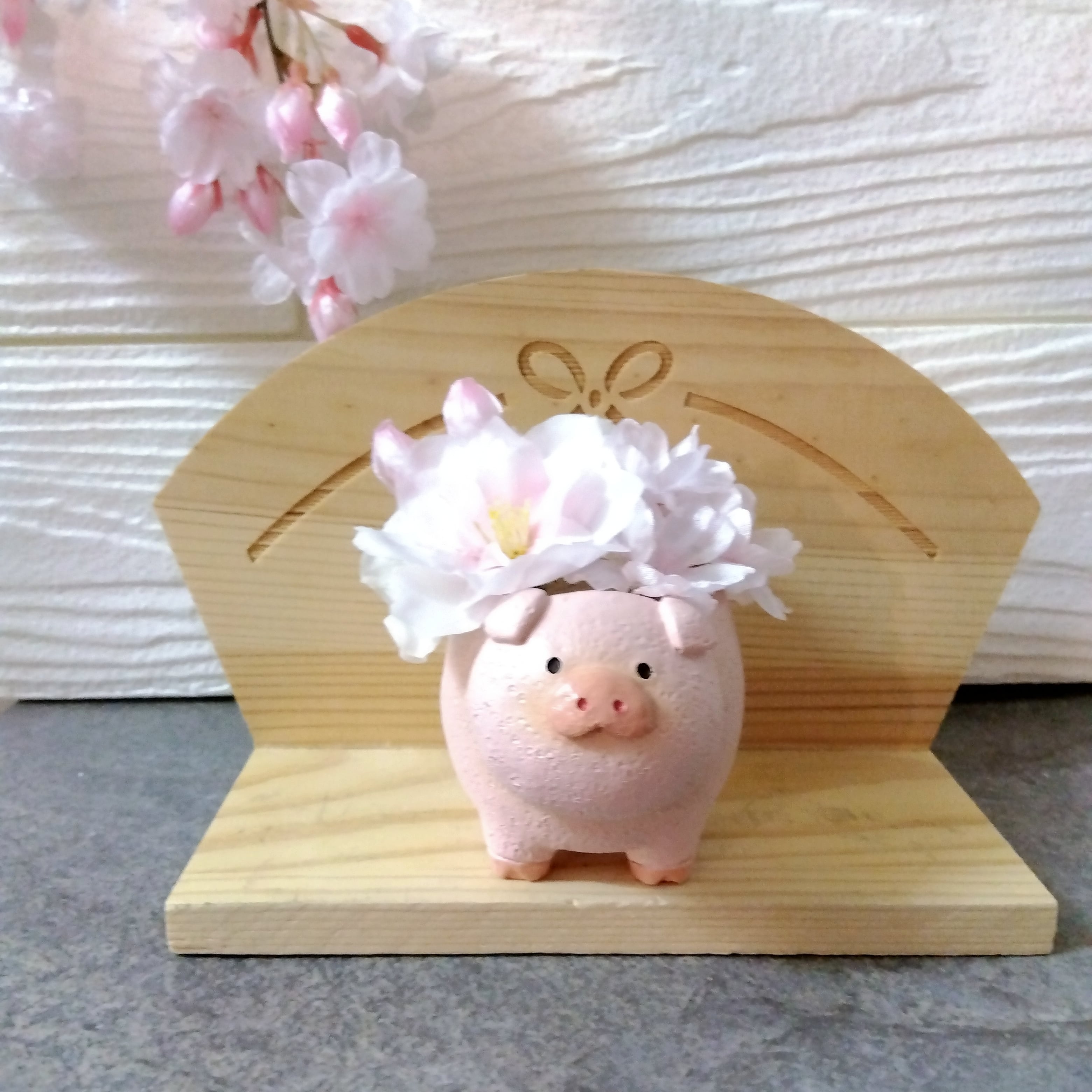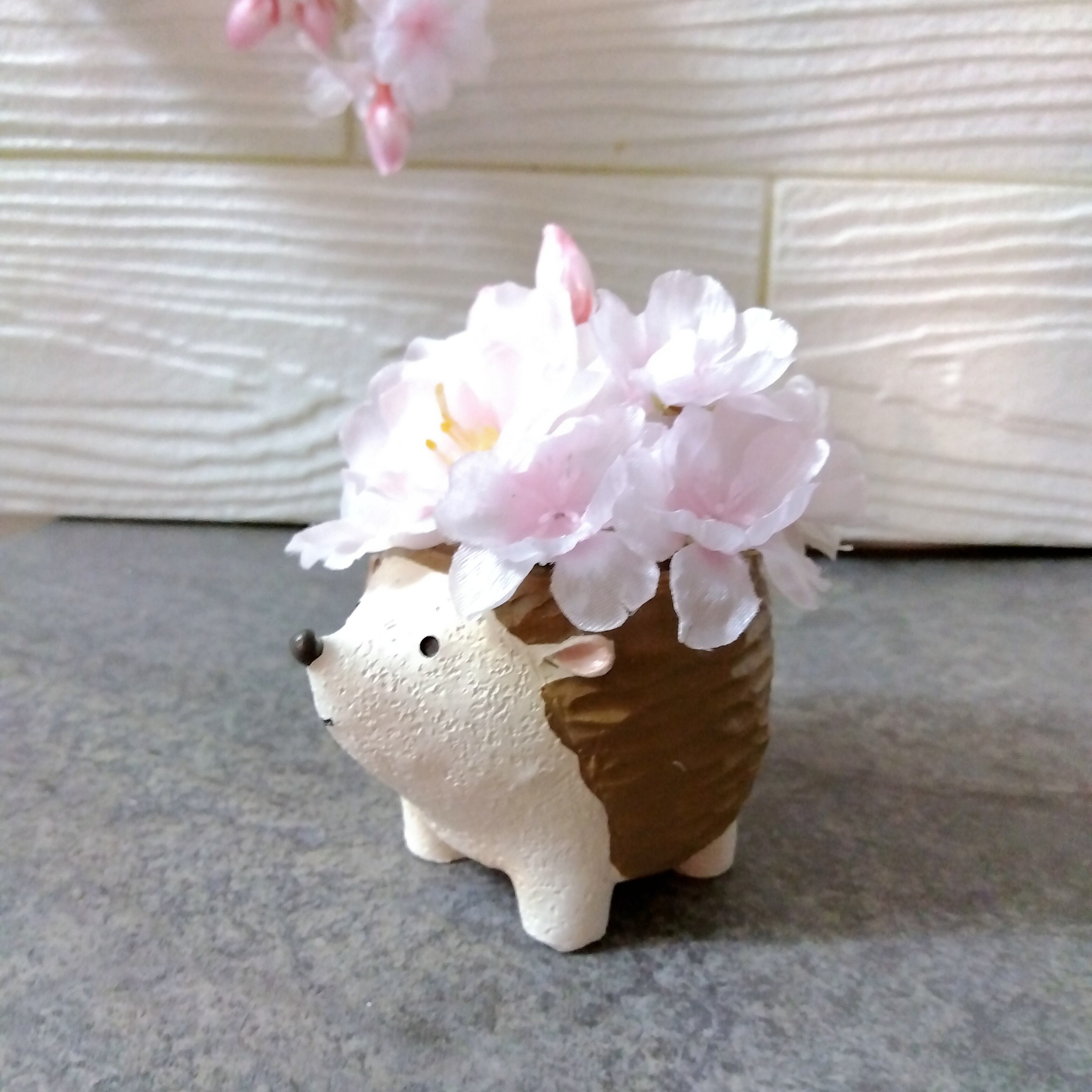 可愛らしいアニマルの背中に大小のサクラ、アジサイをアレンジしたお花がギュッと詰まった商品です。