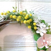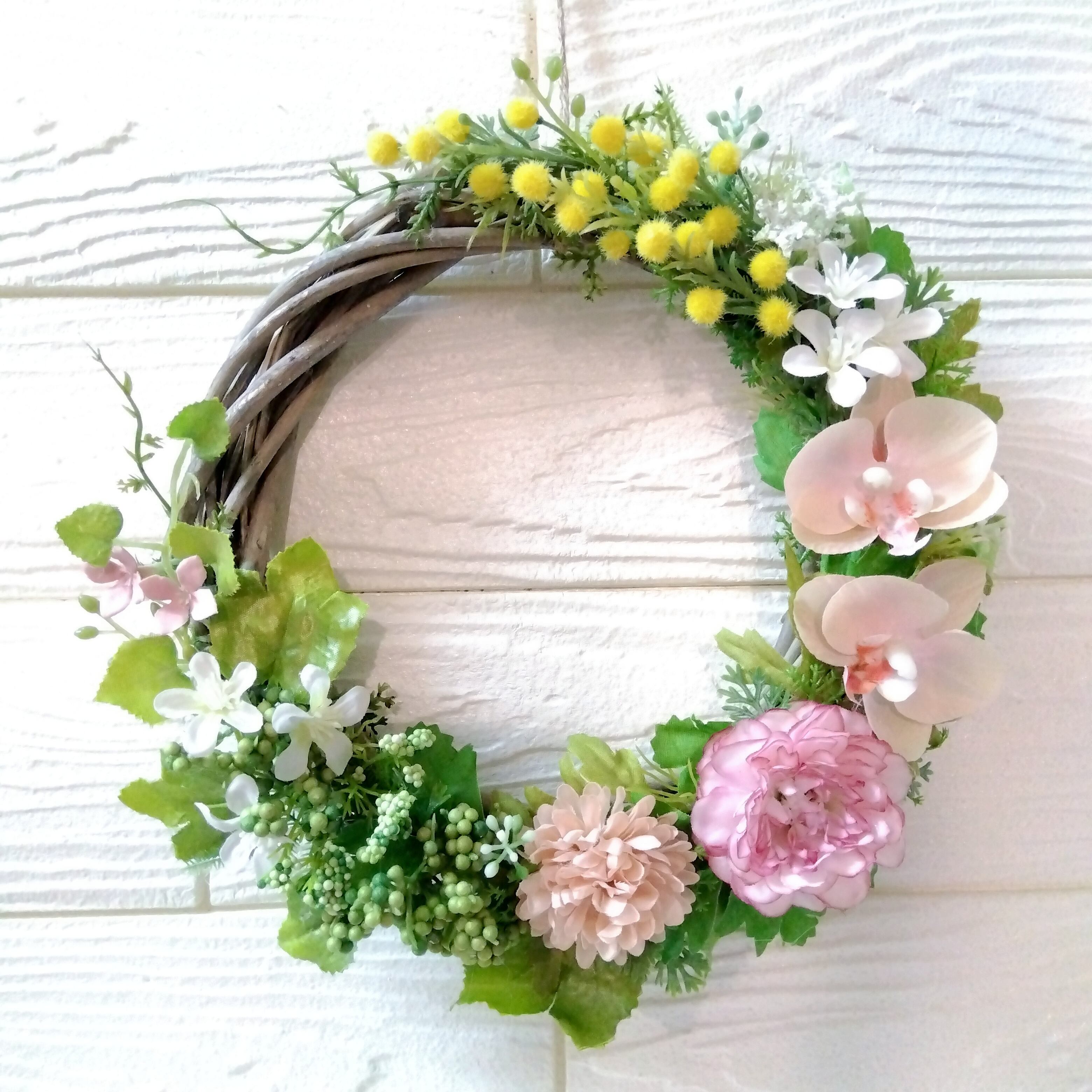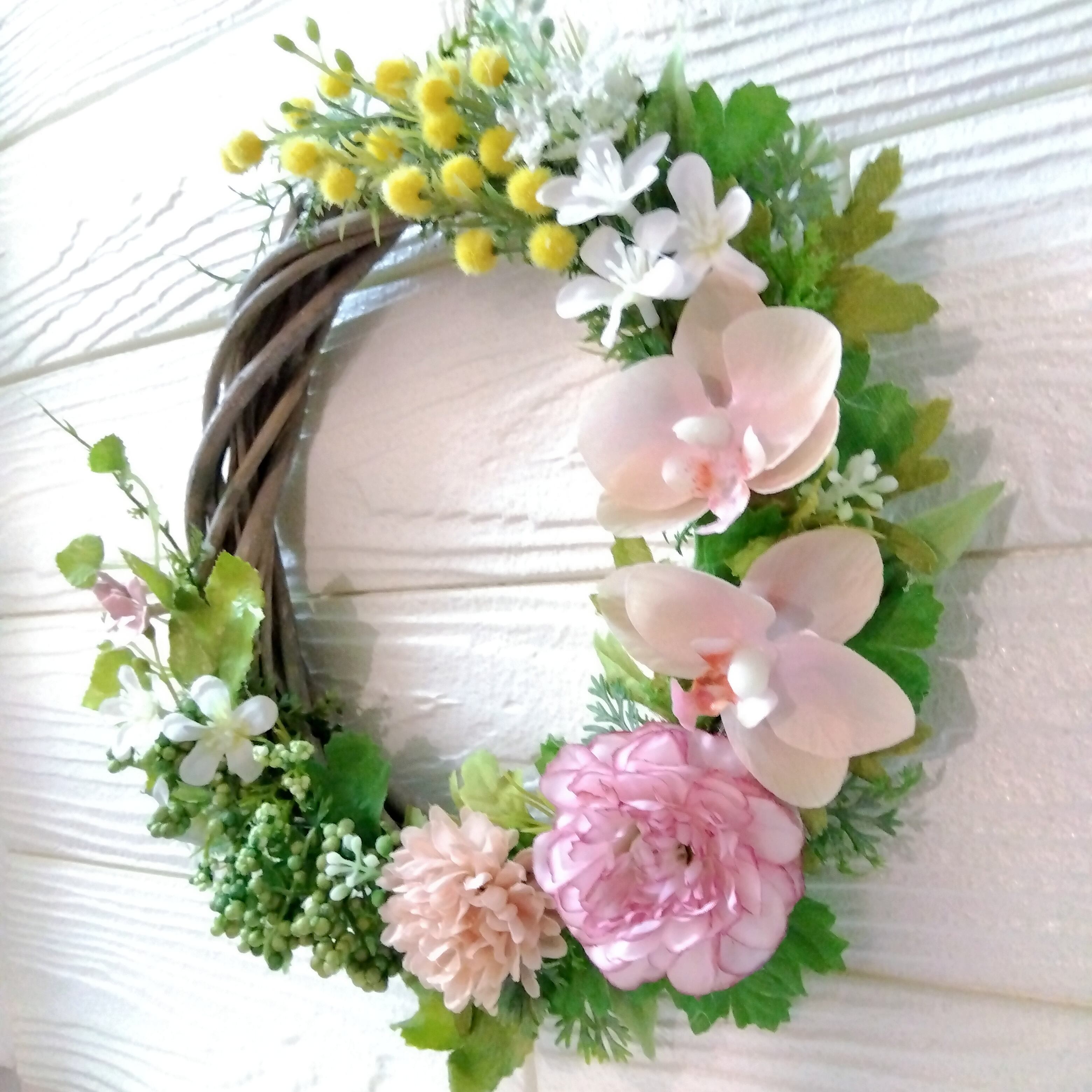 ミモザと胡蝶蘭、ラナンキュラスやベリー、小花といろいろな葉っぱを使った春らしい明るい爽やかな可愛らしいリースです(*^^*)