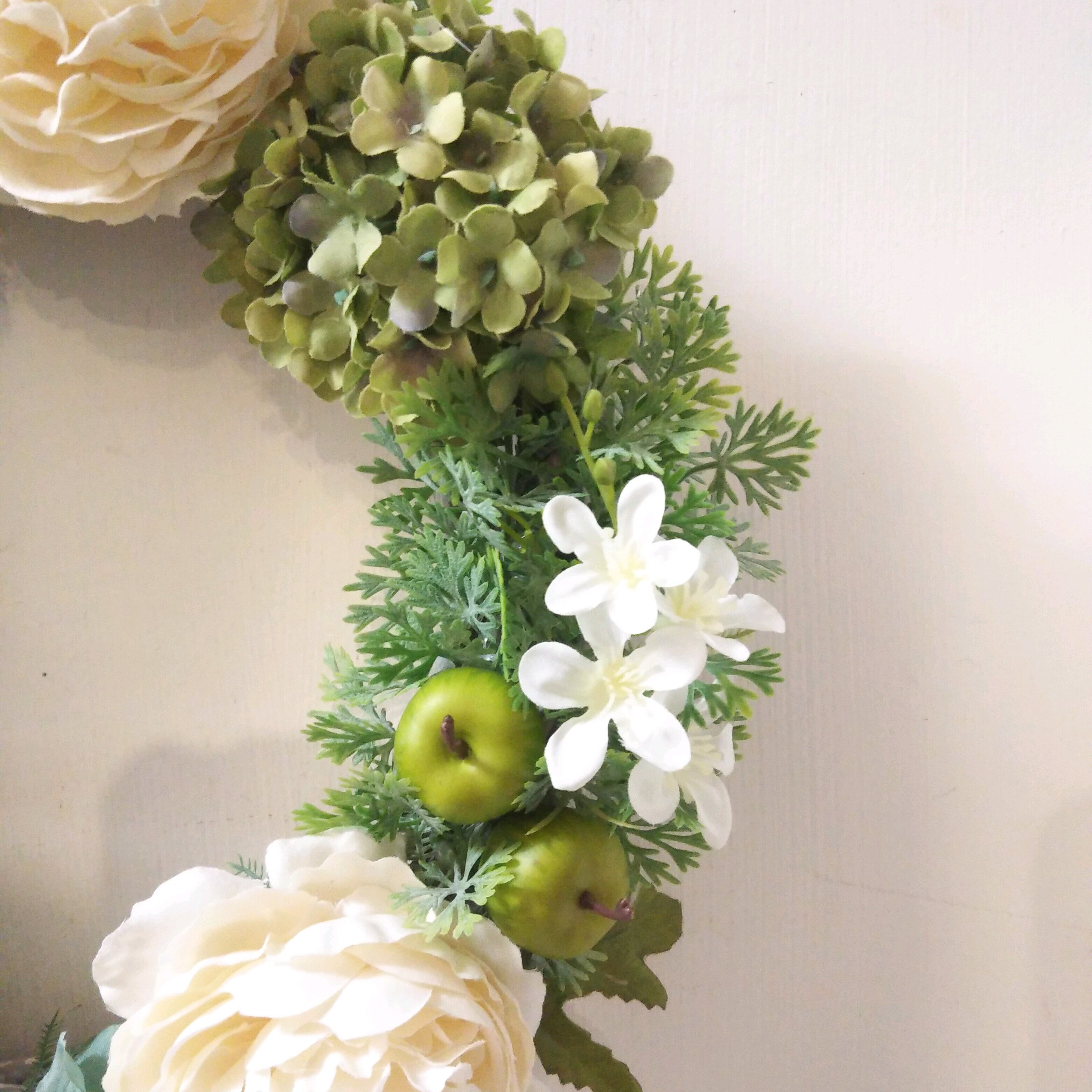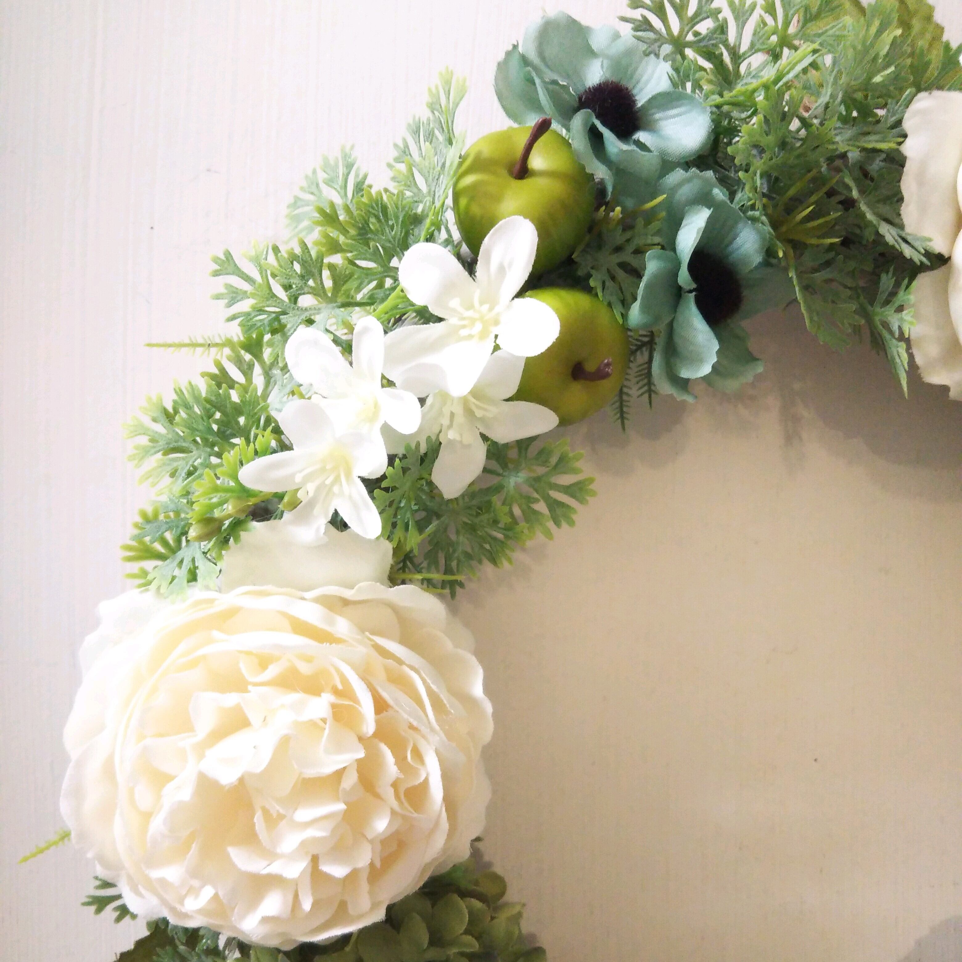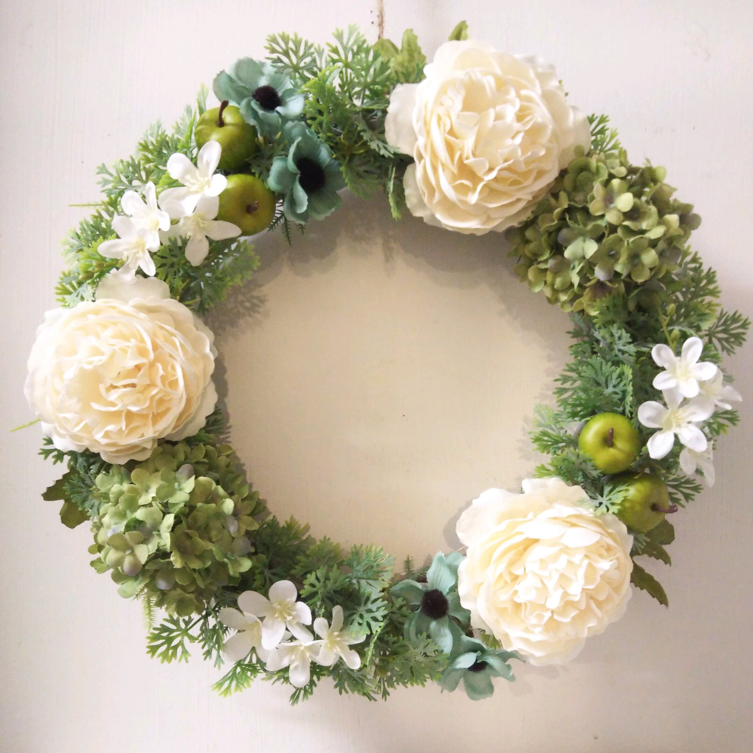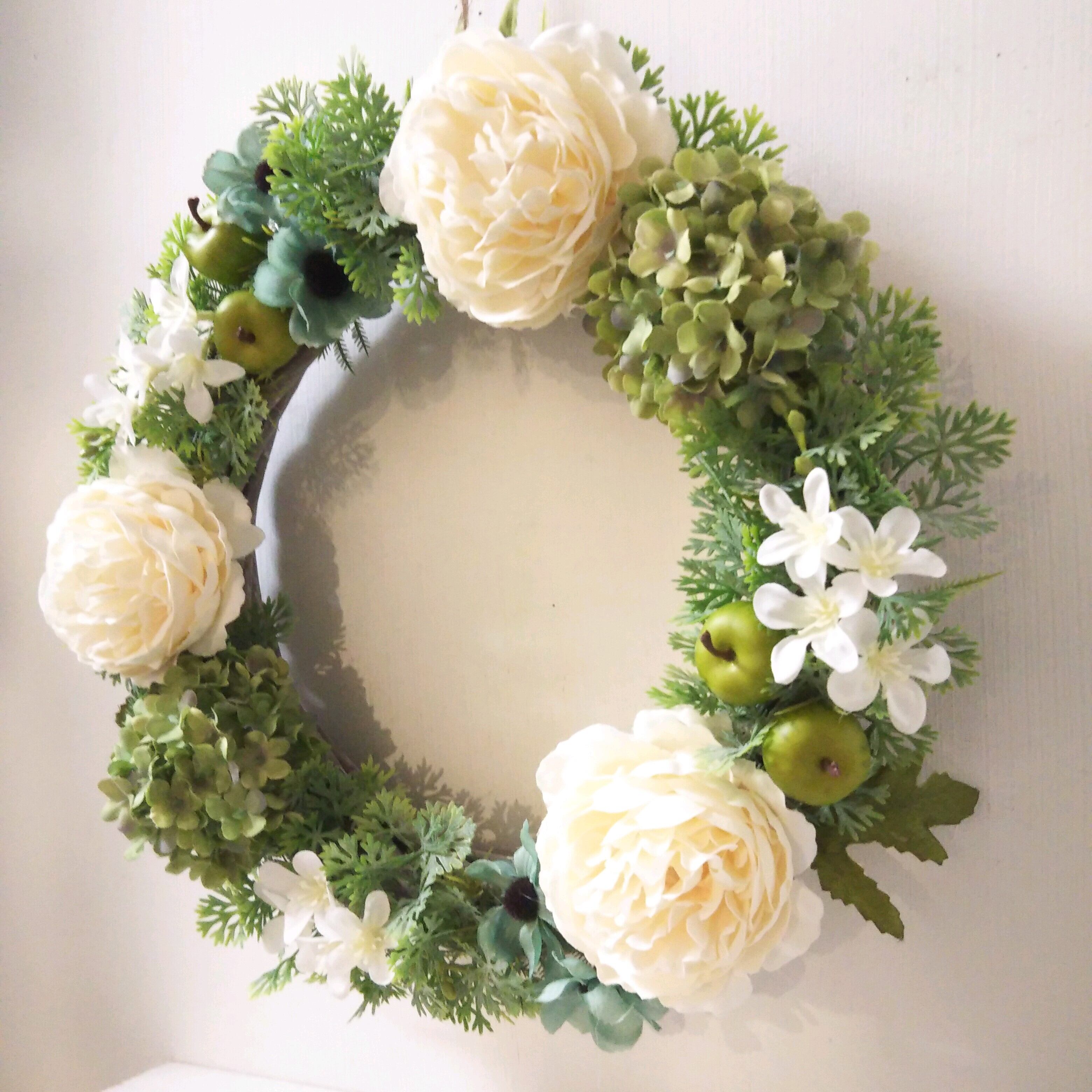 白とグリーンを基調にアップルやスノーボール、ピオニーや小花がギュッと詰まった爽やかな仕上がりのリースです(*^^*)