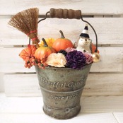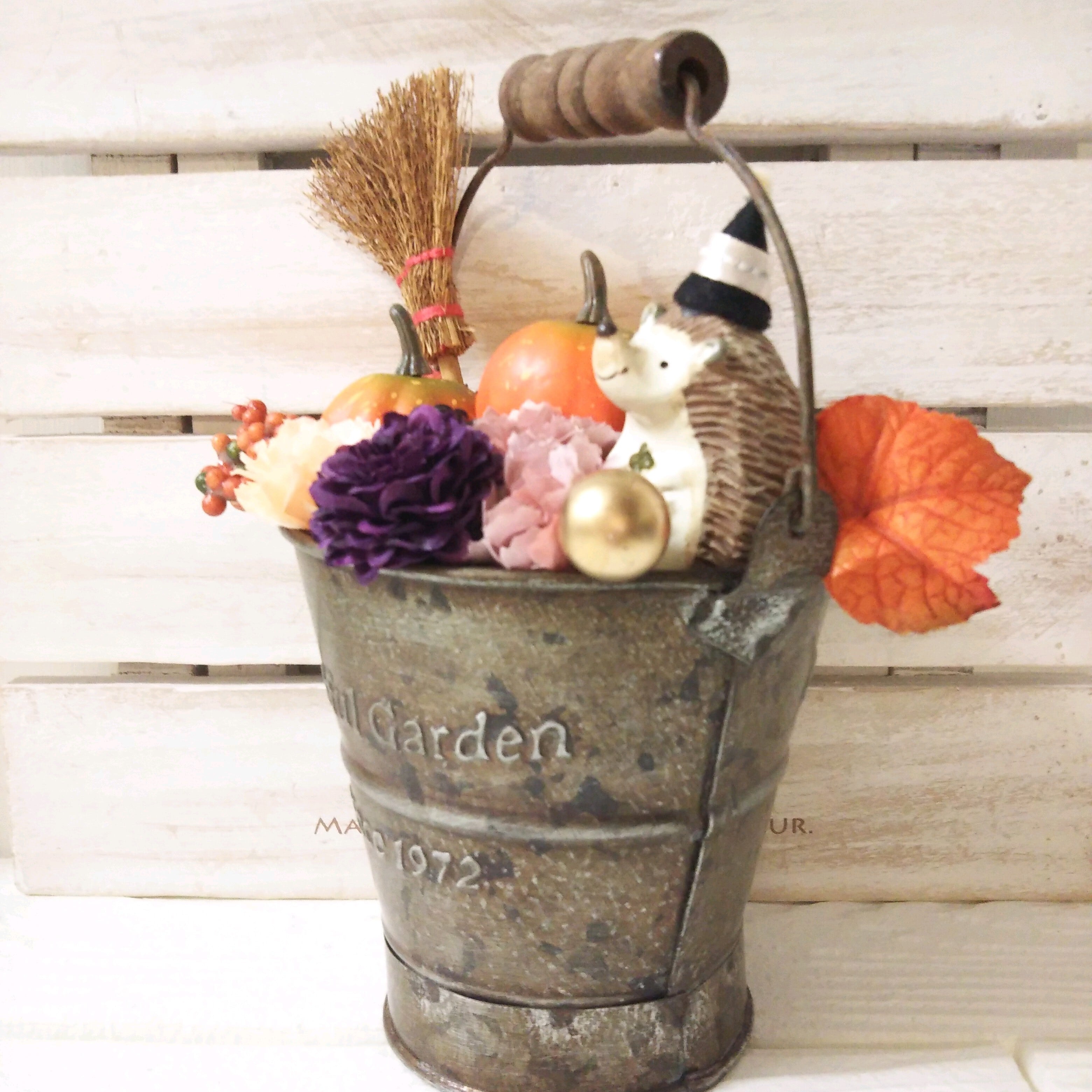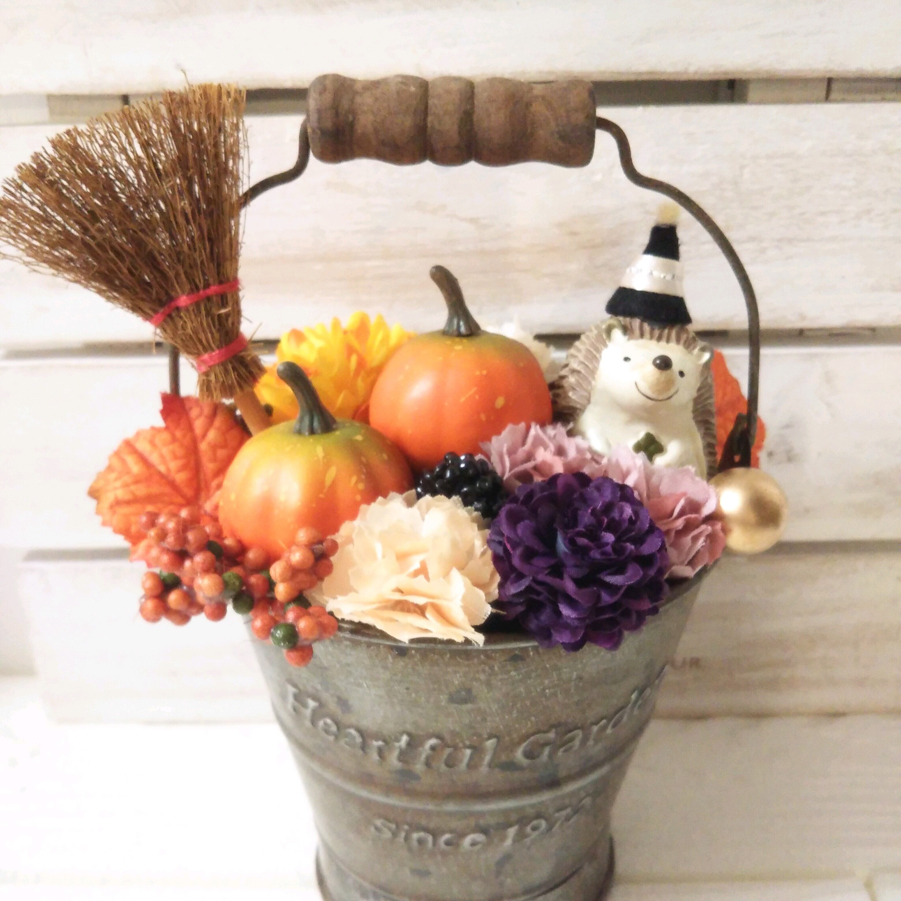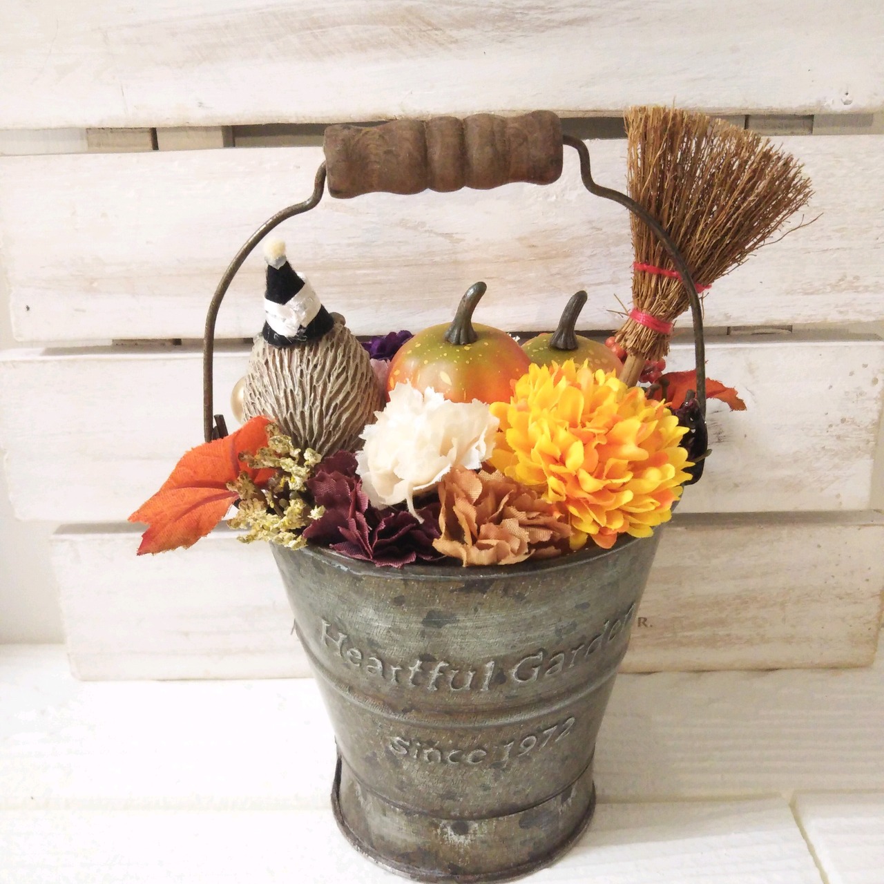 ブリキカンに、カボチャやお花がギュッと詰ったハロウィンインテリアです(*^^*)