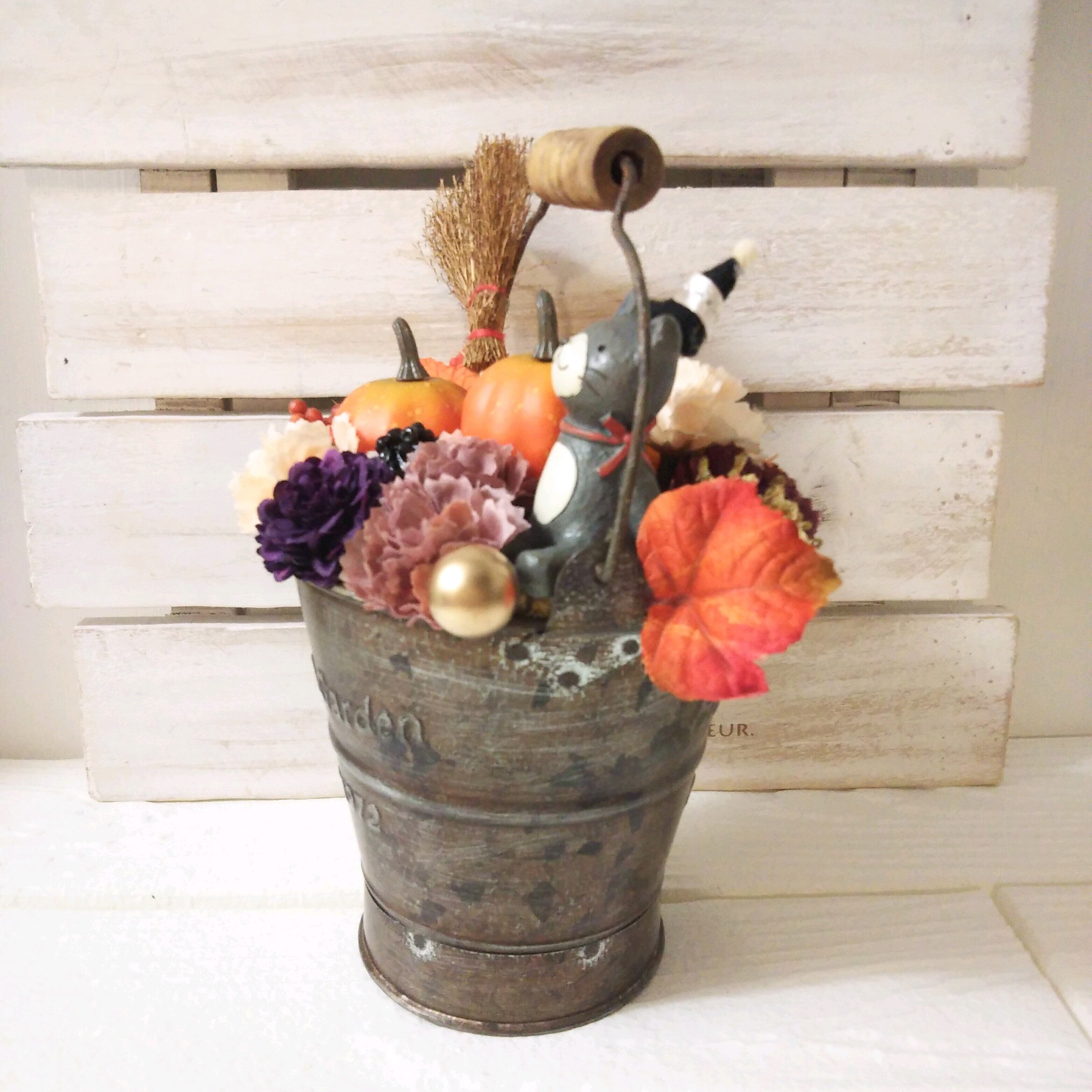 ブリキカンに、カボチャやお花がギュッと詰ったハロウィンインテリアです(*^^*)