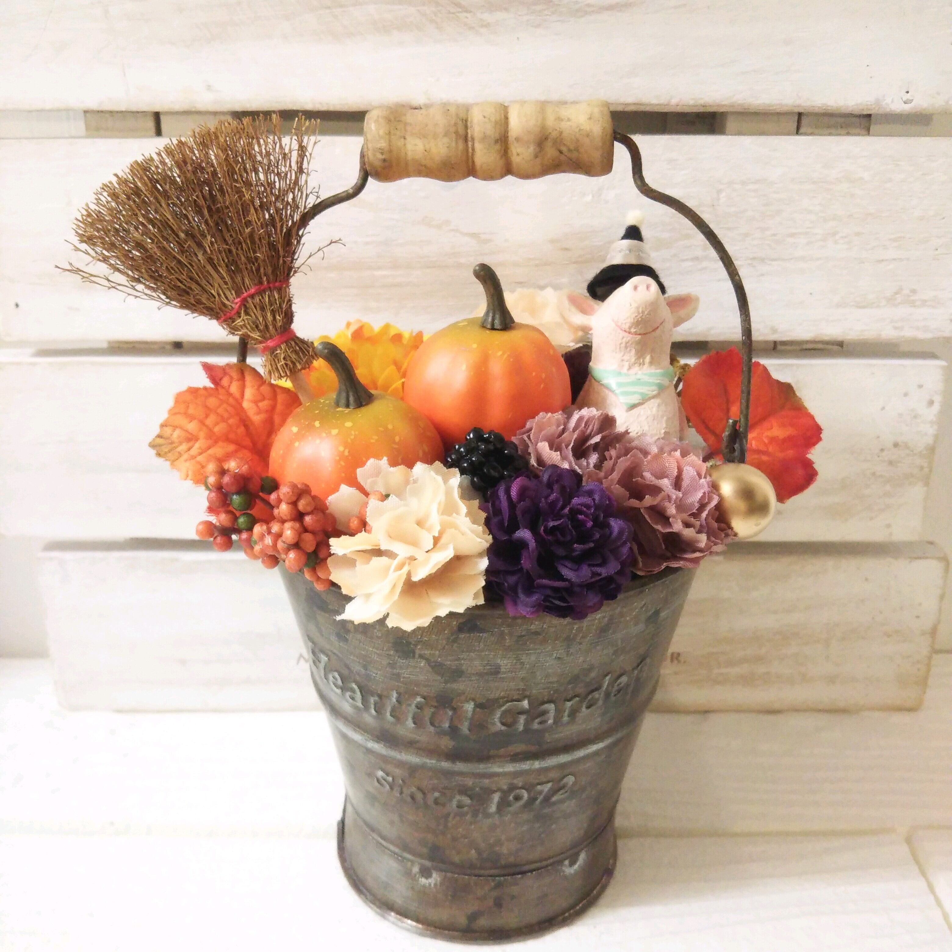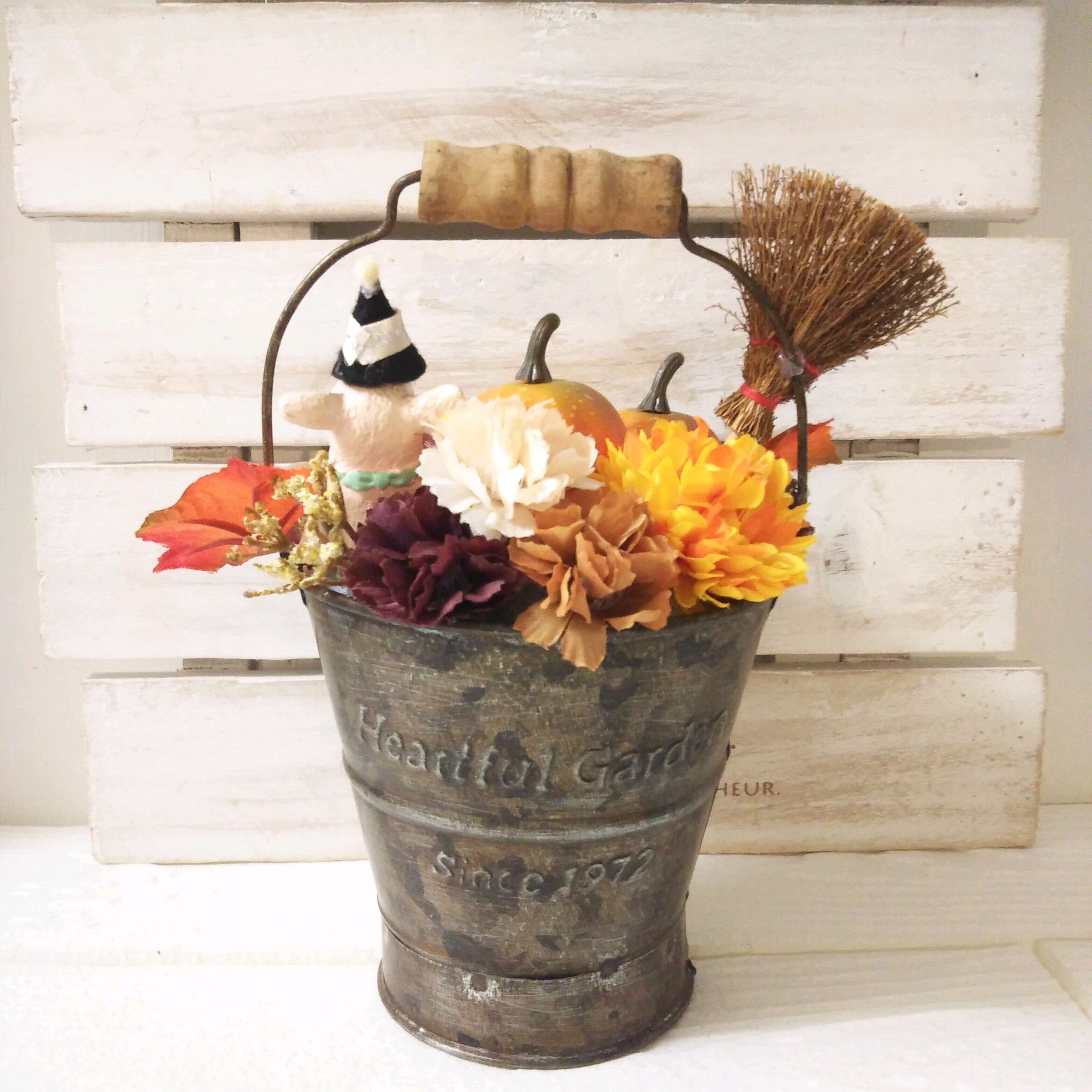 ブリキカンに、カボチャやお花がギュッと詰ったハロウィンインテリアです(*^^*)