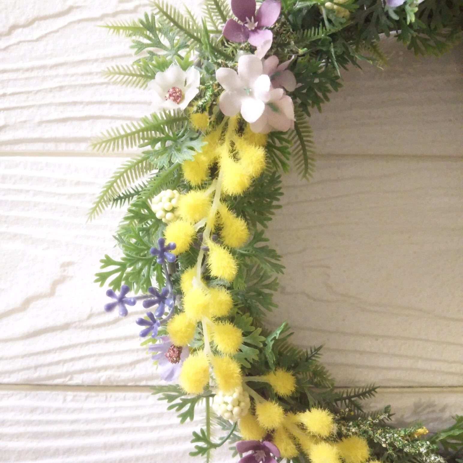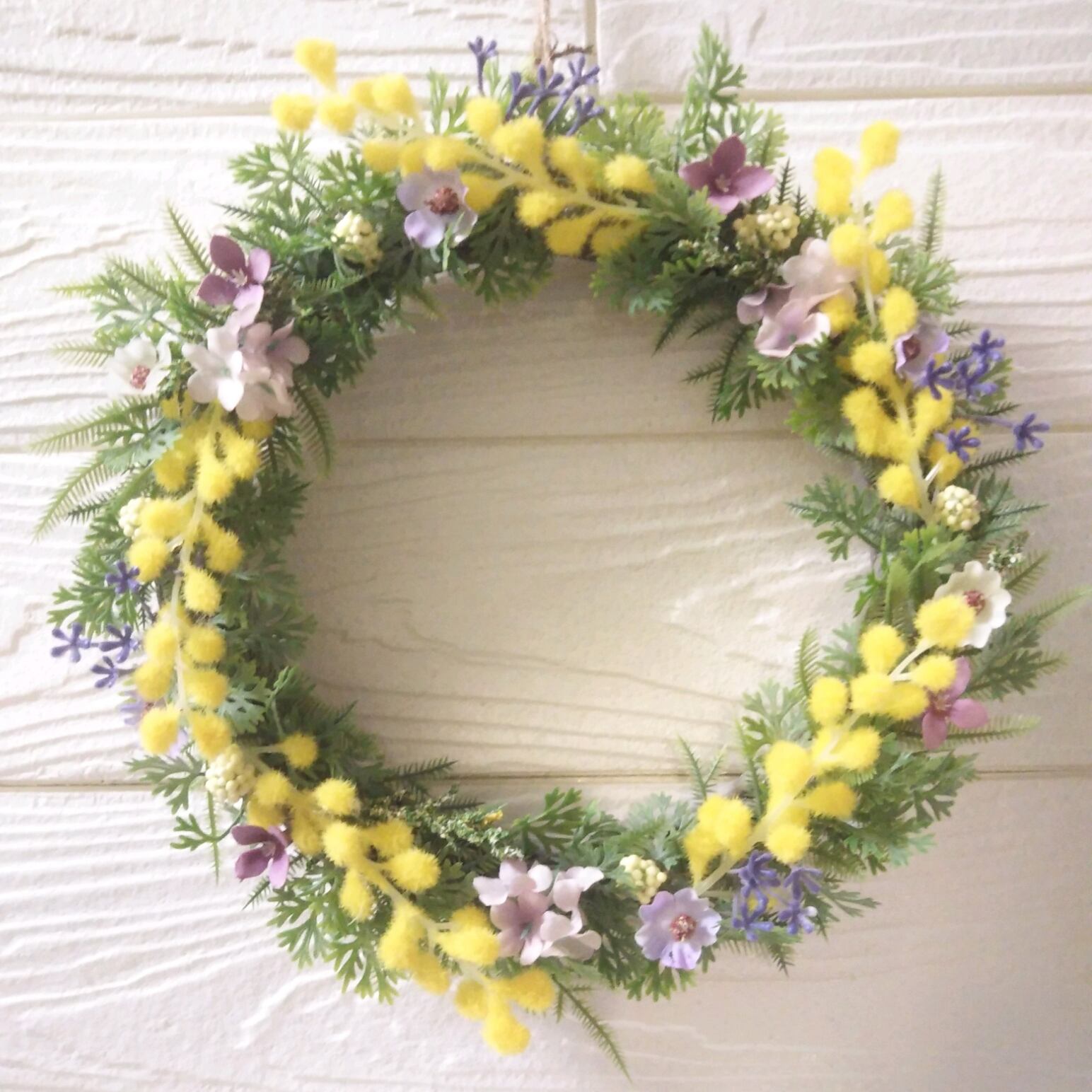 ミモザといろいろな葉っぱ、小花を使った春らしい明るい爽やかなリースです(*^^*)