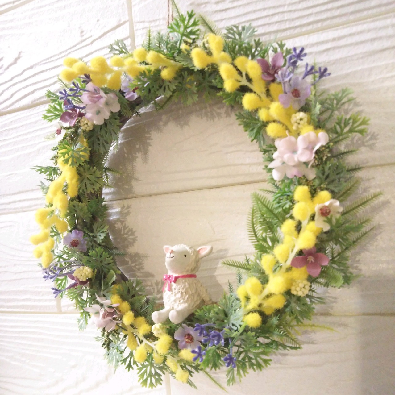 スプリングリース ミモザ と 小花 の草原リース ヒツジ