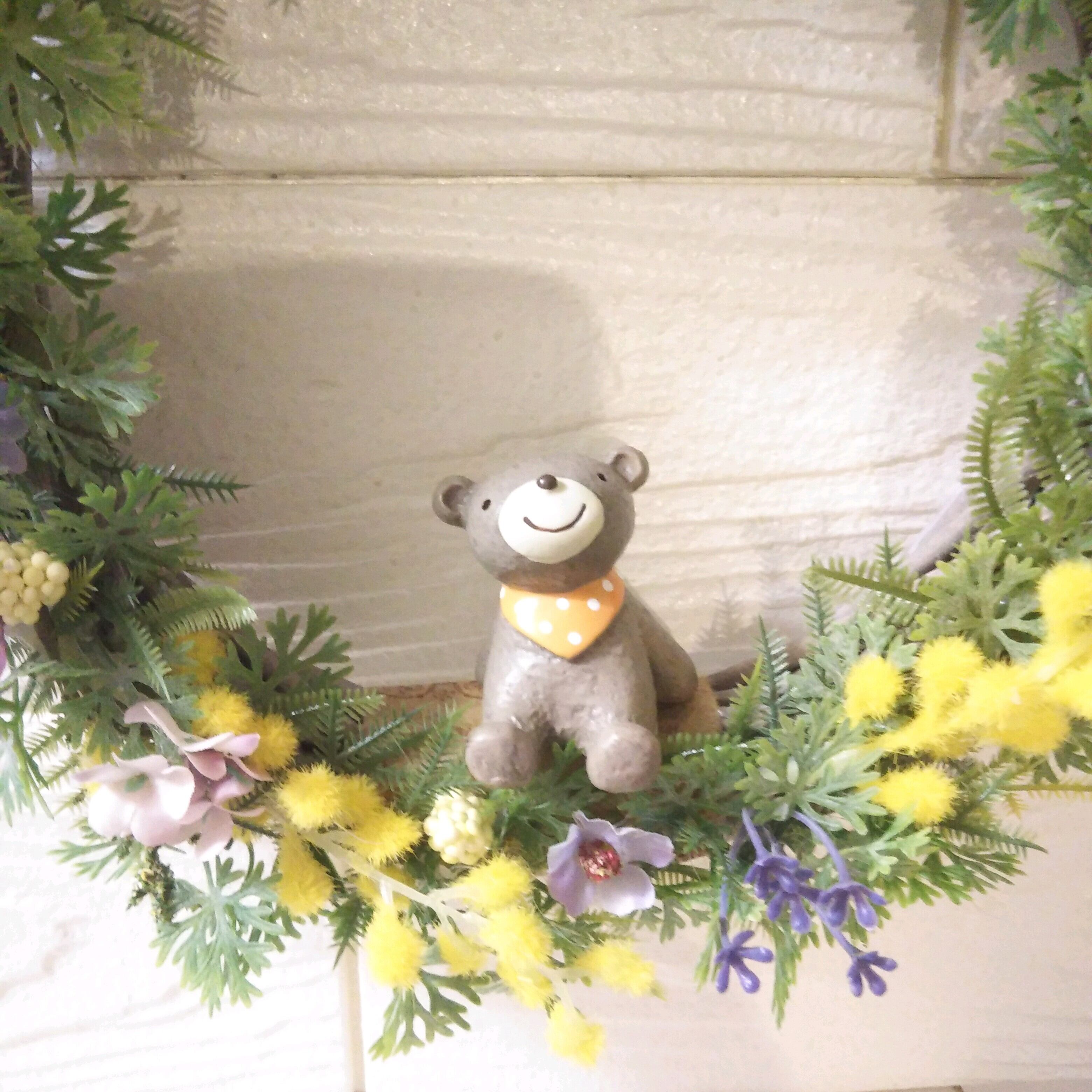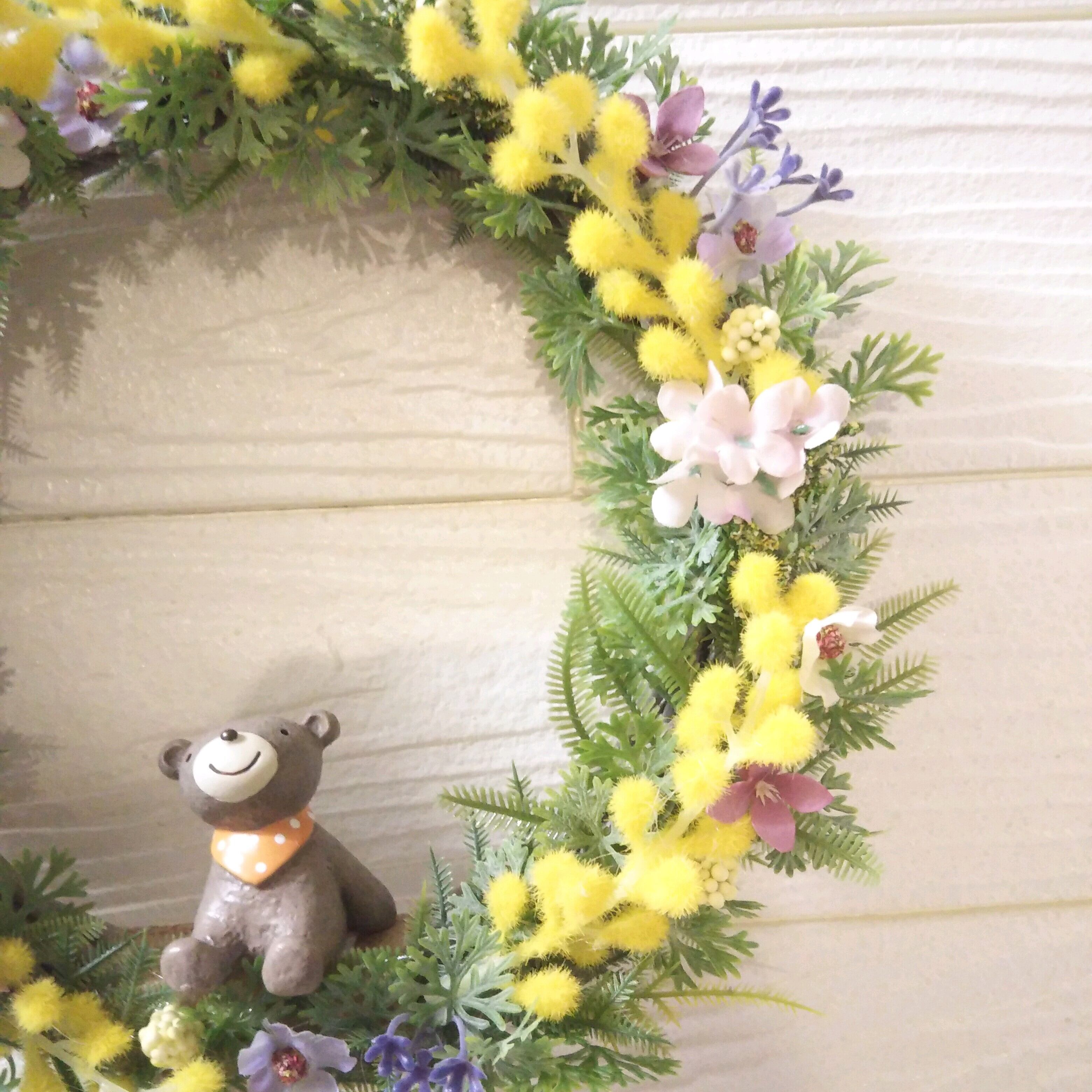スプリングリース ミモザ と 小花 の草原リース クマ
