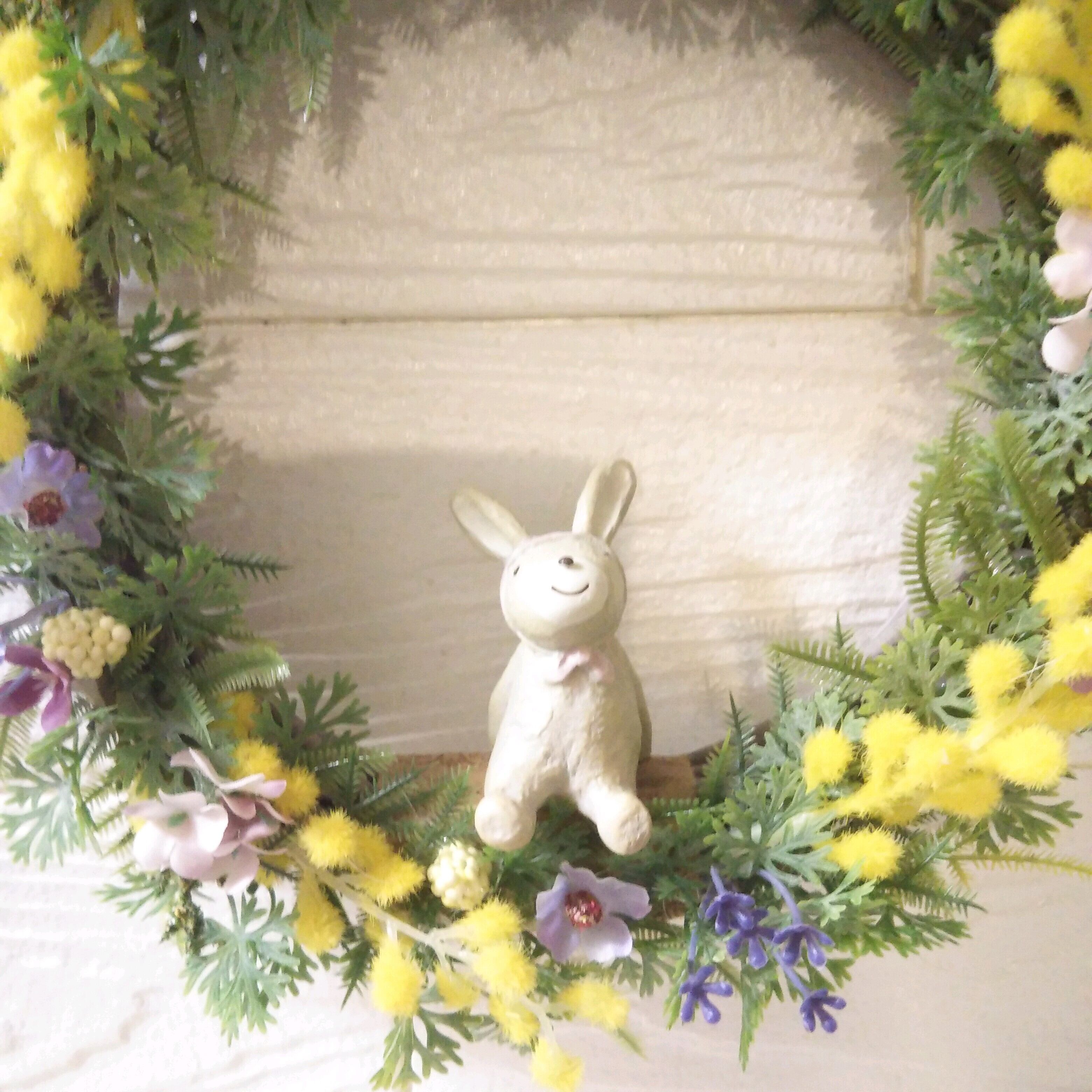 スプリングリース ミモザ と 小花 の草原リース ウサギ