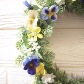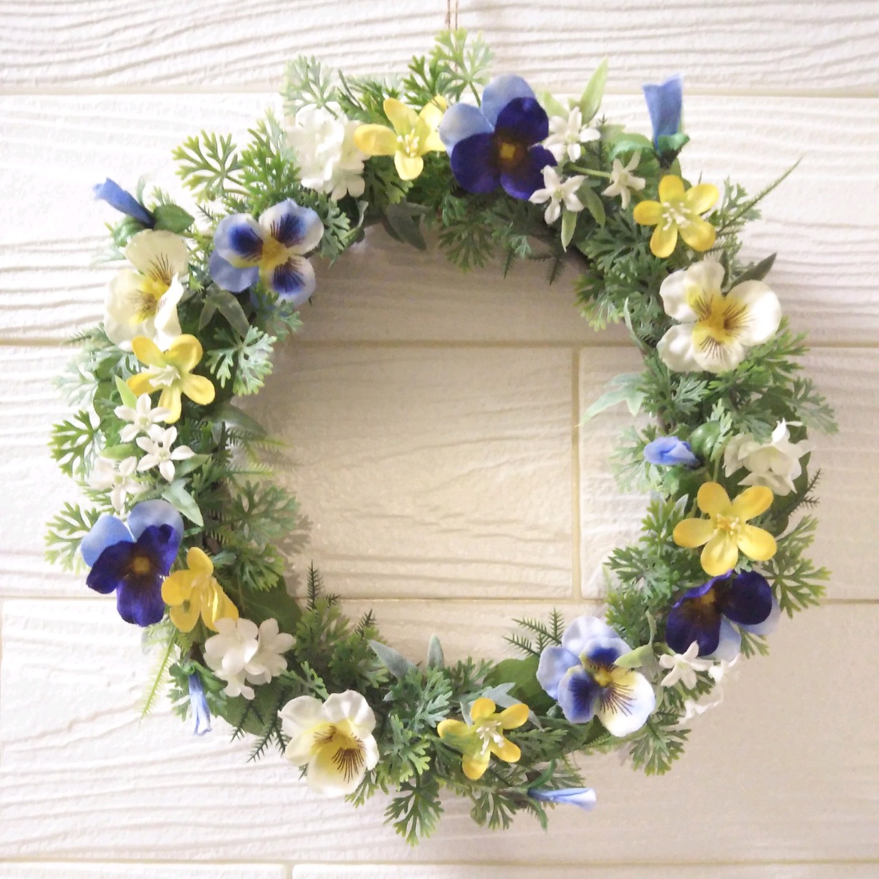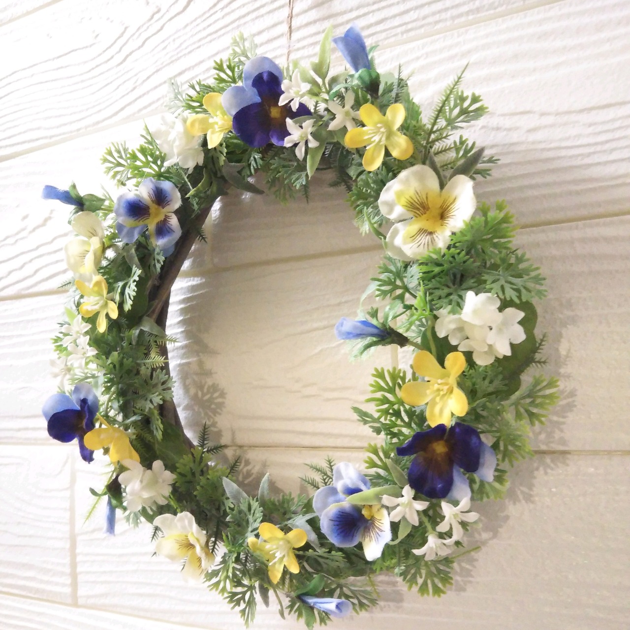 パンジーといろいろな葉っぱ、小花を使った春らしい明るい爽やかなリースです(*^^*)