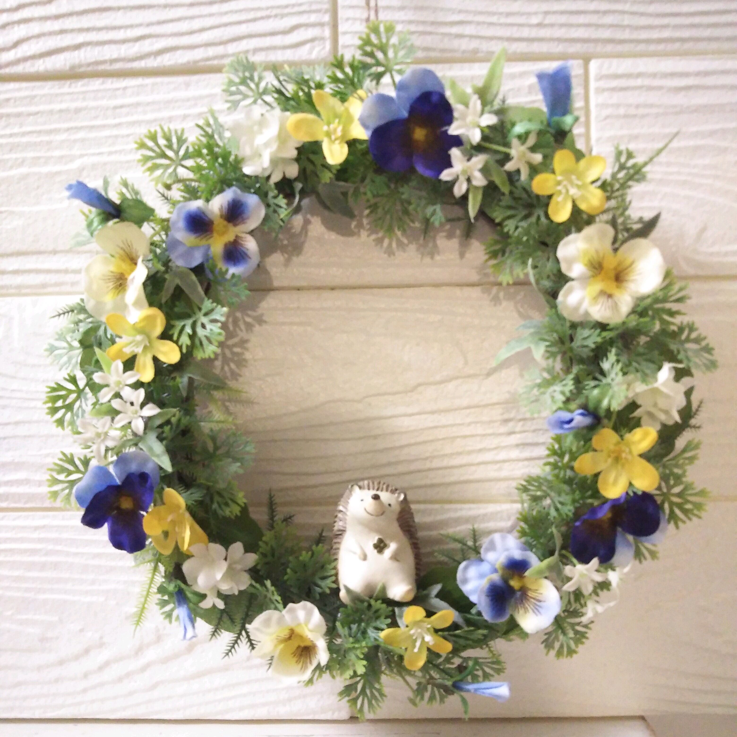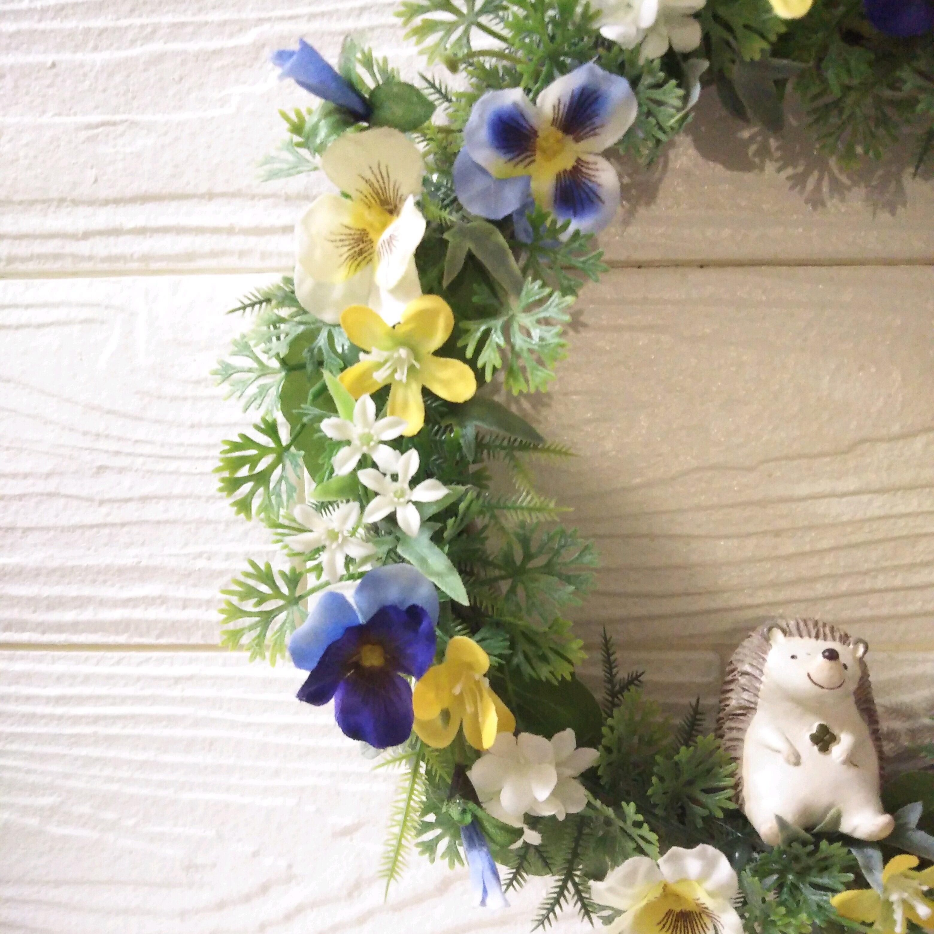 スプリングリース パンジー と 小花 の グリーンリース ハリネズミ