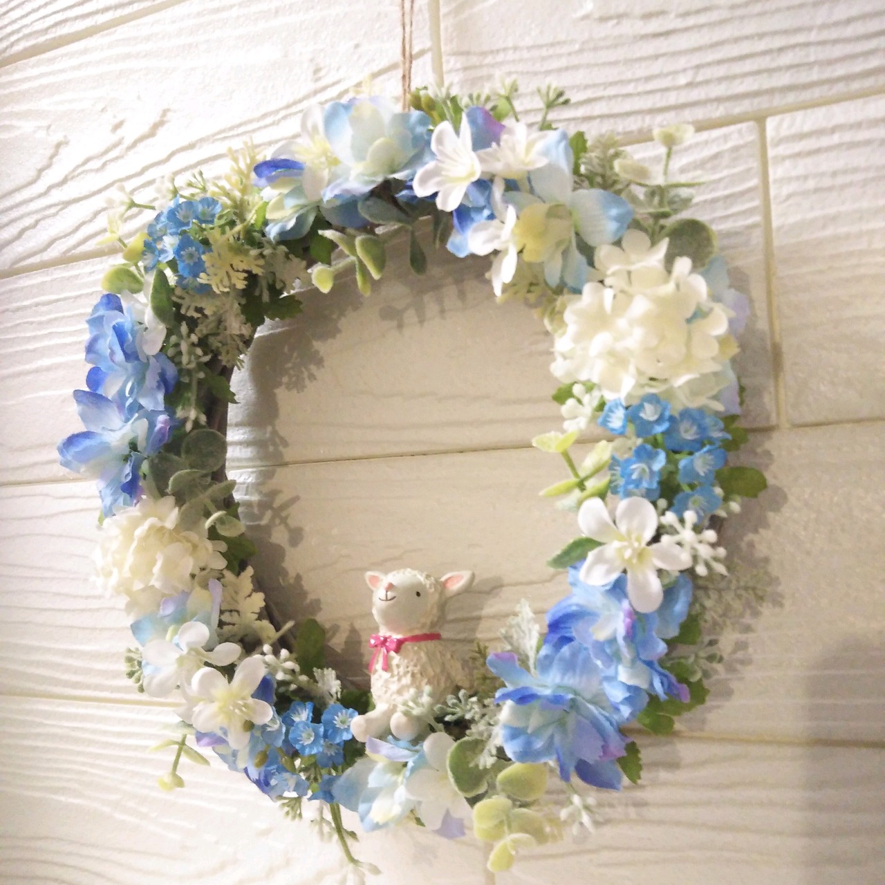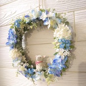 綺麗なブルーのデルフィニウムとスノーボール、ユーカリなどいろいろな葉っぱ、小花を使った明るい爽やかなリースです(*^^*)