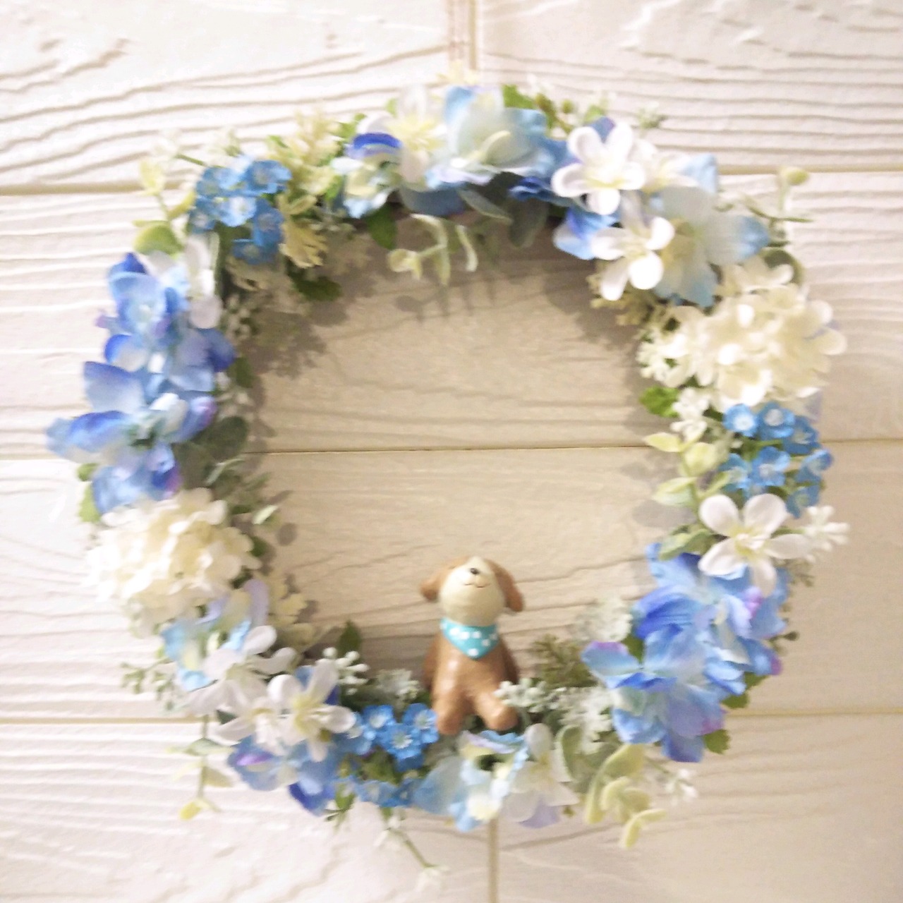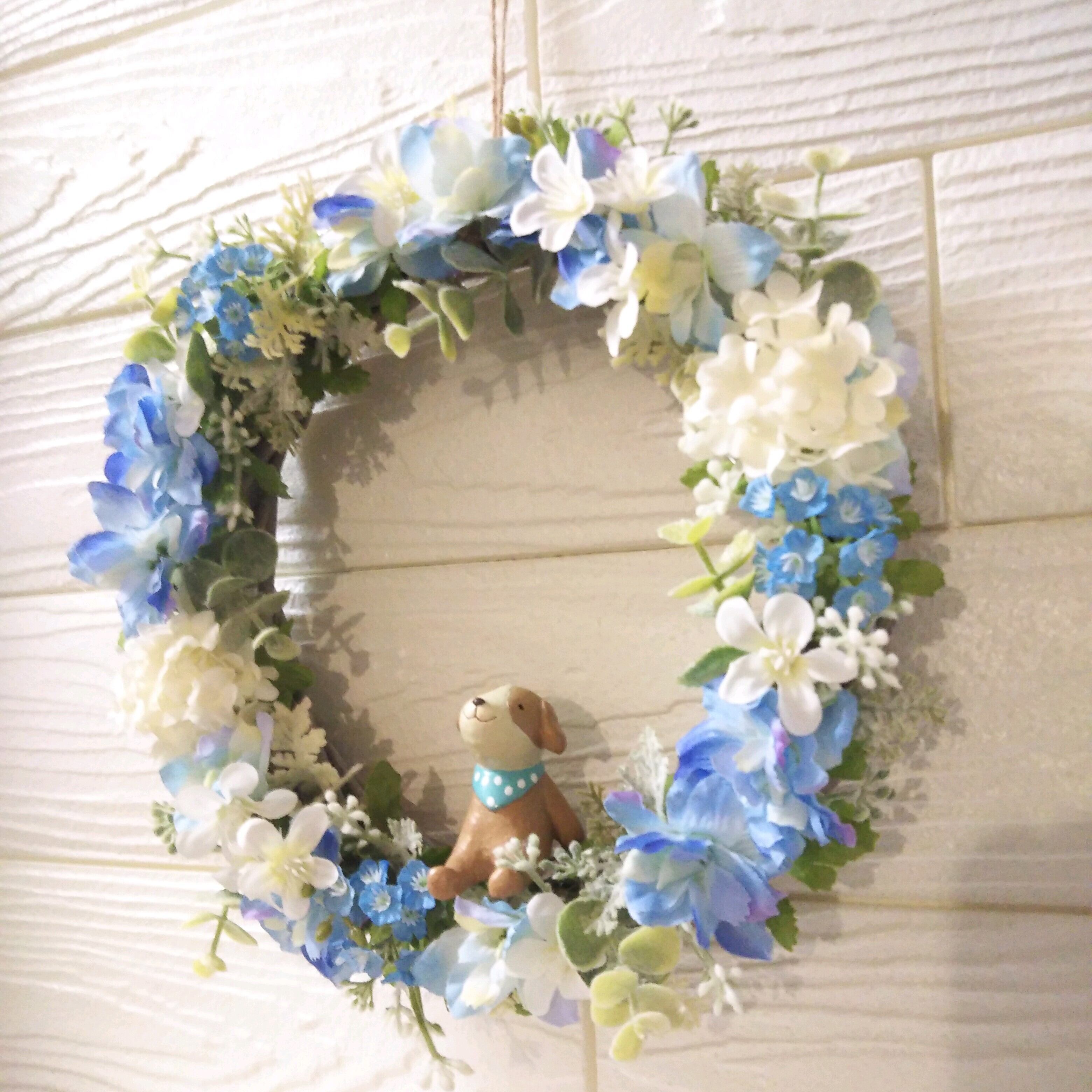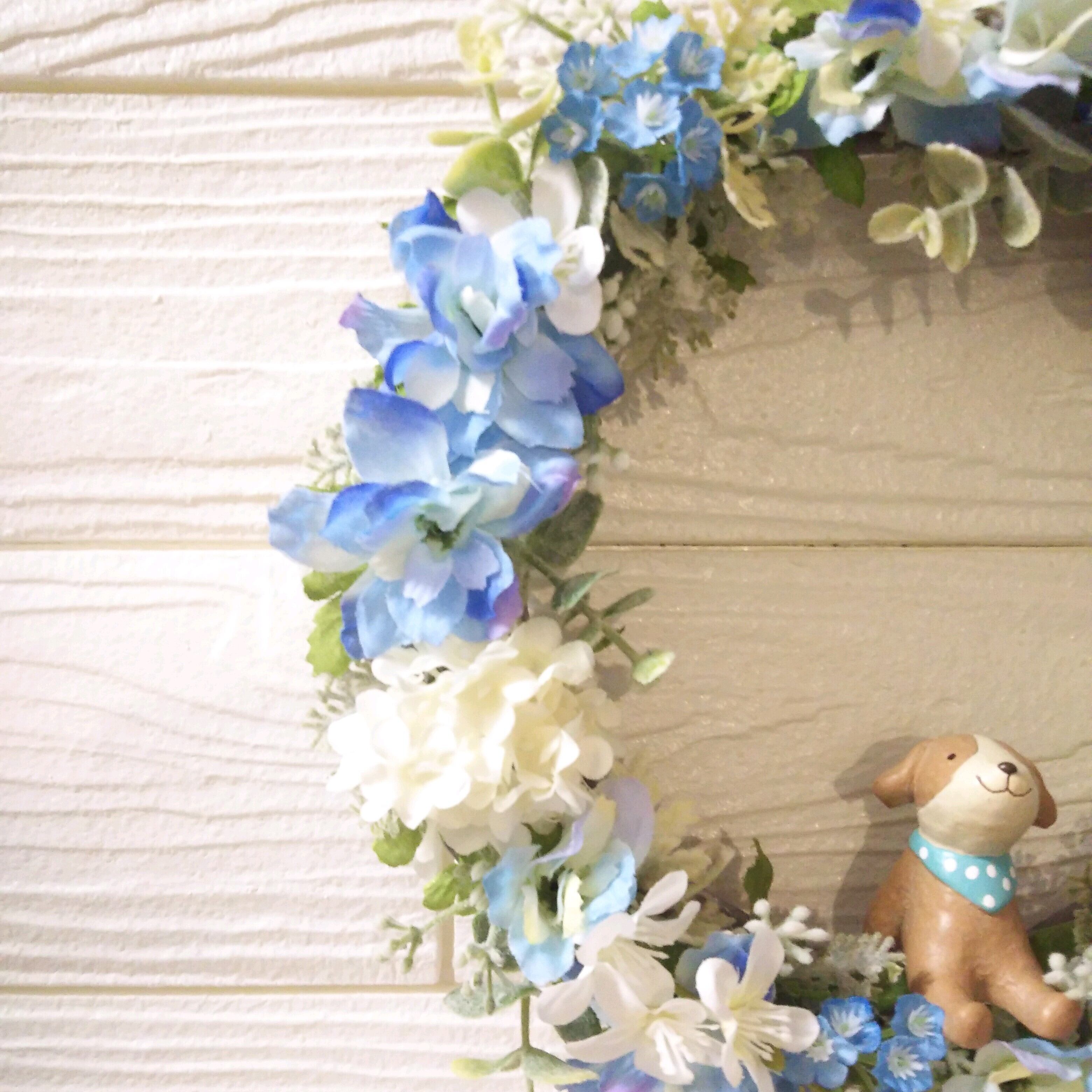 綺麗なブルーのデルフィニウムとスノーボール、ユーカリなどいろいろな葉っぱ、小花を使った明るい爽やかなリースです(*^^*)