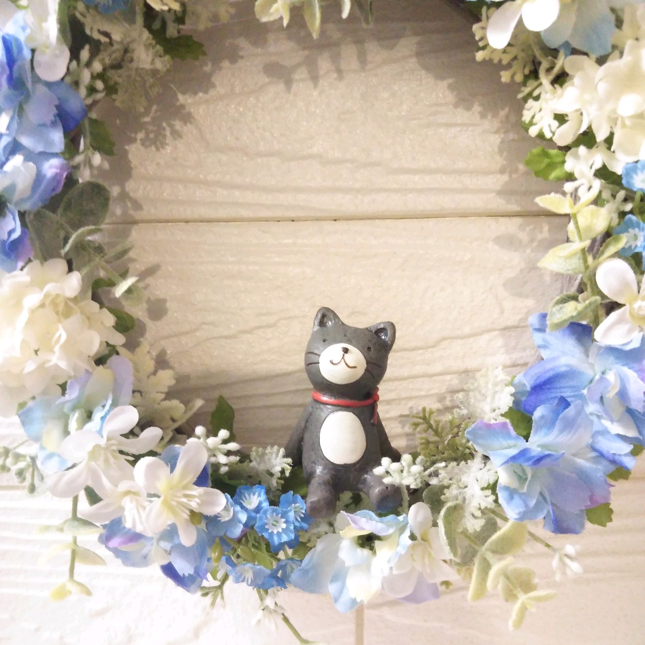 綺麗なブルーのデルフィニウムとスノーボール、ユーカリなどいろいろな葉っぱ、小花を使った明るい爽やかなリースです(*^^*)