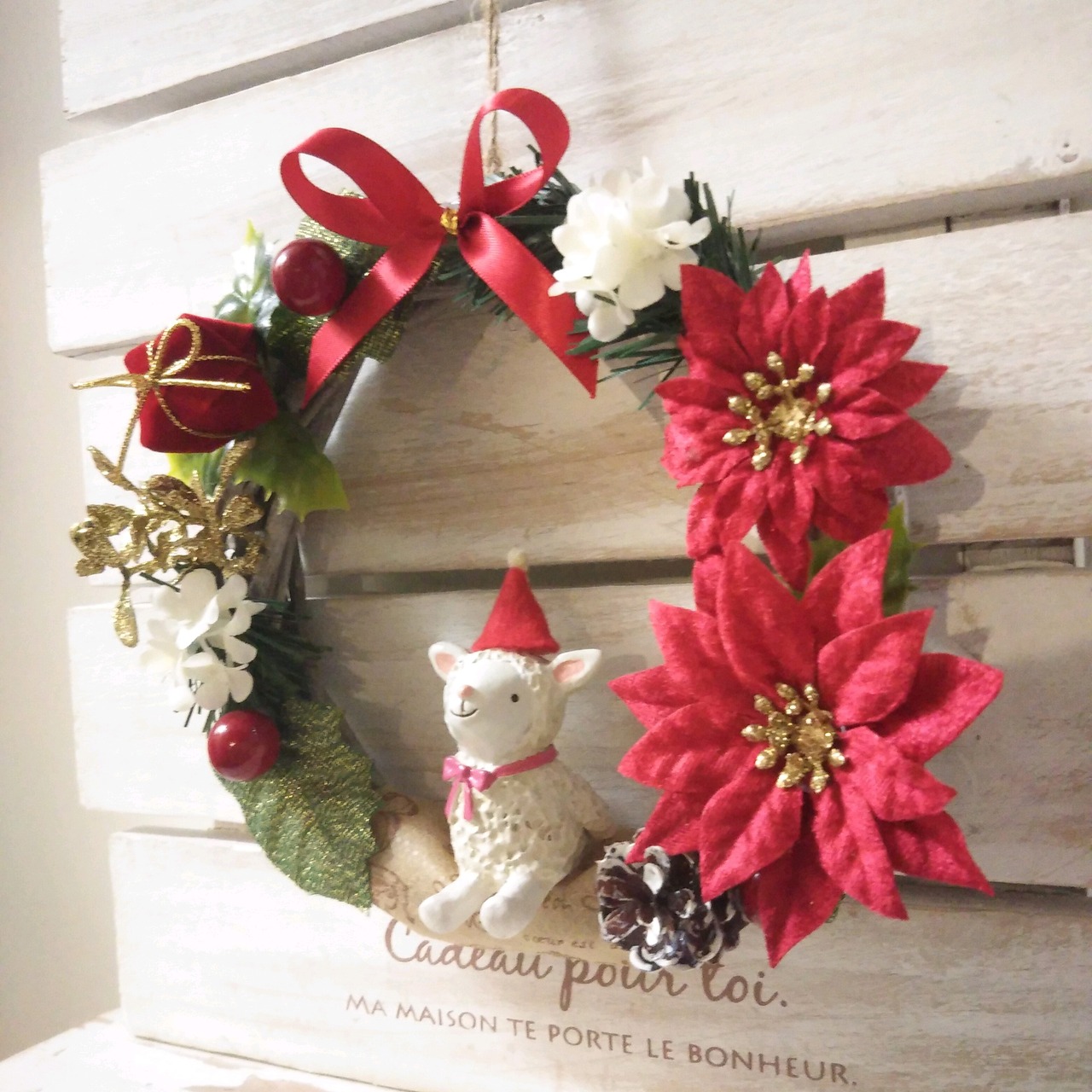 かわいいマスコット付きの造花(アーティフィシャルフラワー)でできた小さめのクリスマスリースです!