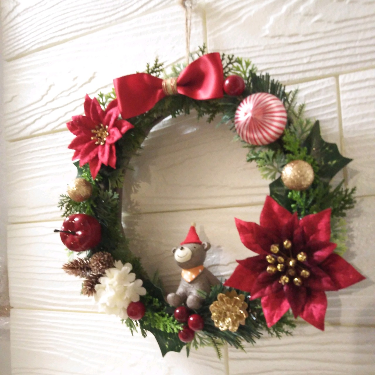 かわいいサンマスコット付きの造花(アーティフィシャルフラワー)のクリスマスリースです!