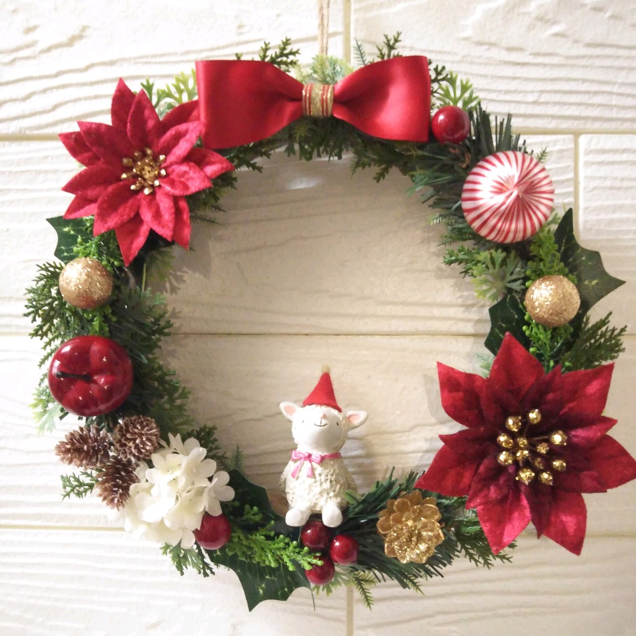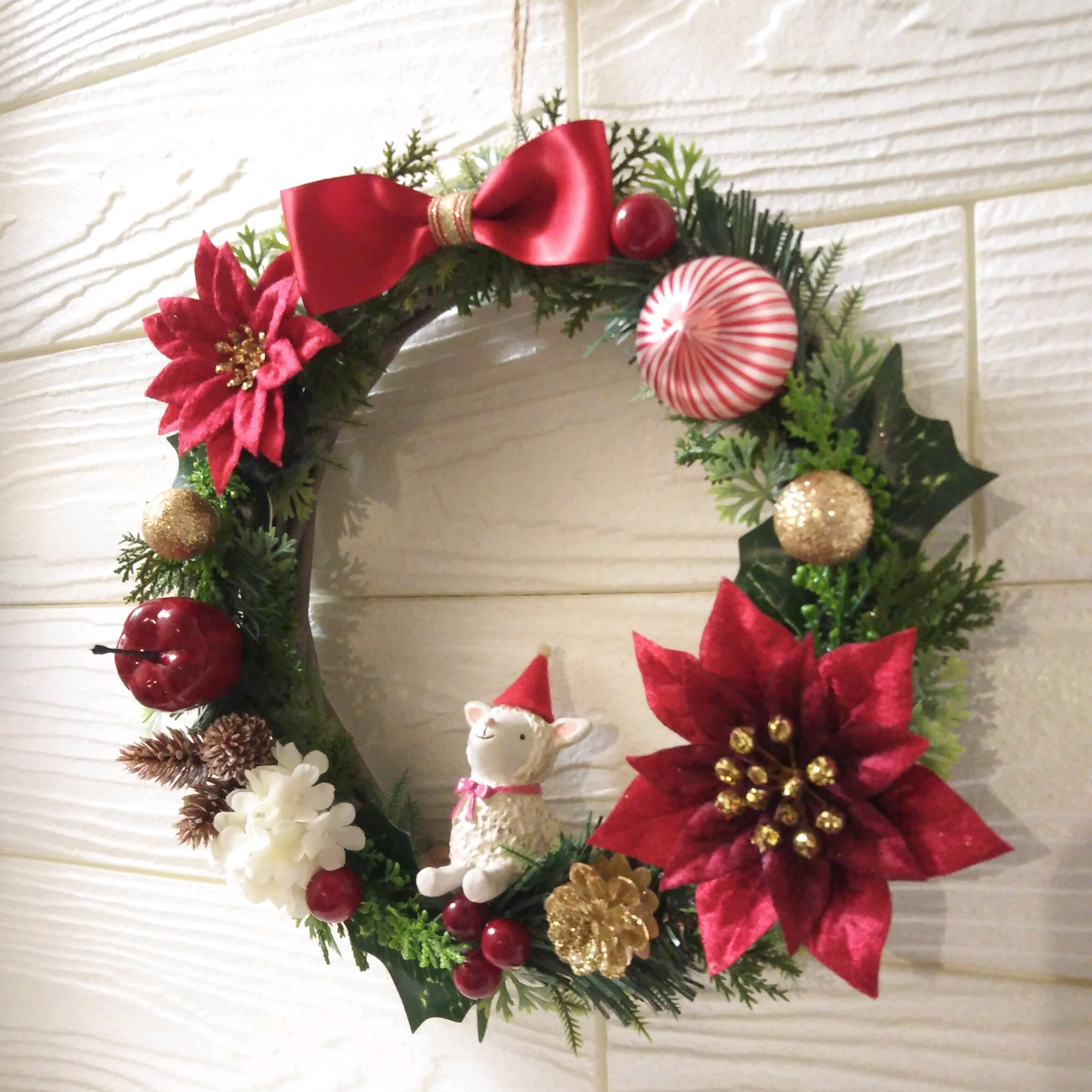 xmas クリスマスリース リンゴとポインセチア ヒツジ
