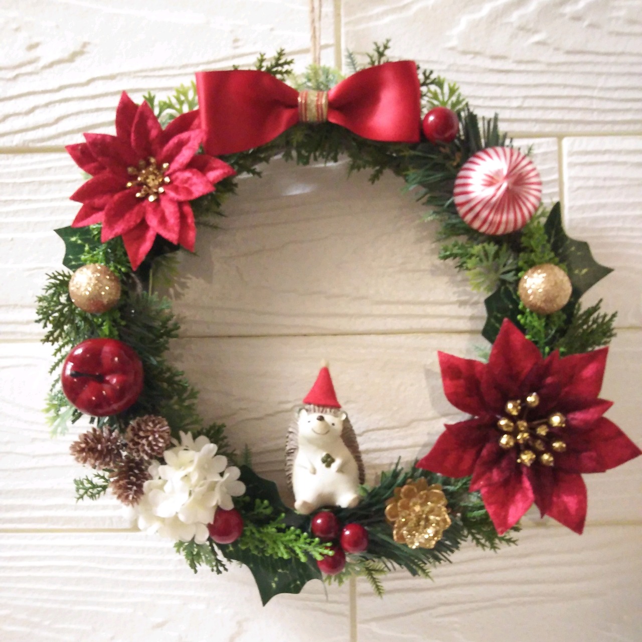 xmas クリスマスリース リンゴとポインセチア ハリネズミ
