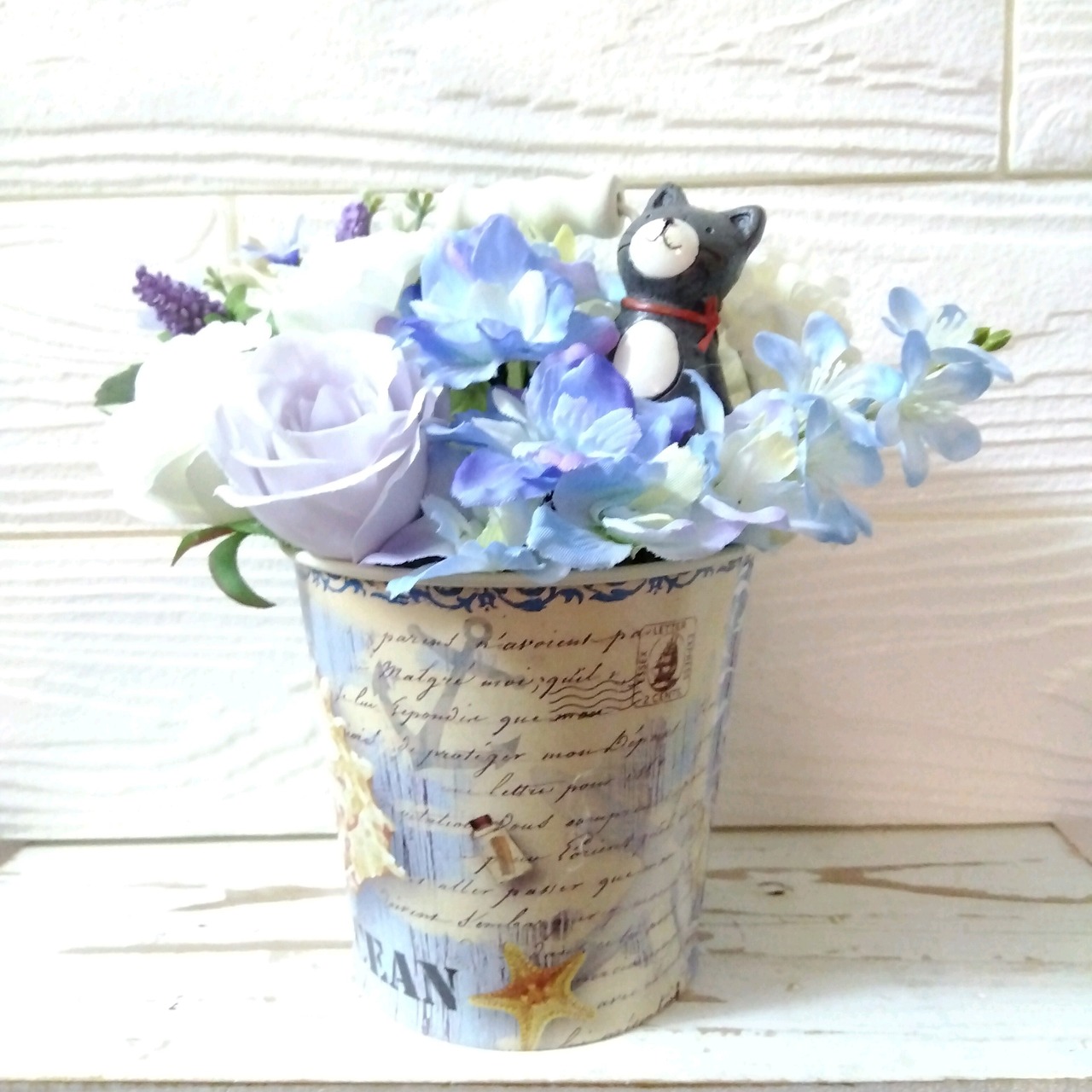 フラワーアレンジ バラ と デルフィニウム の ブルーホワイト アレンジ ネコ