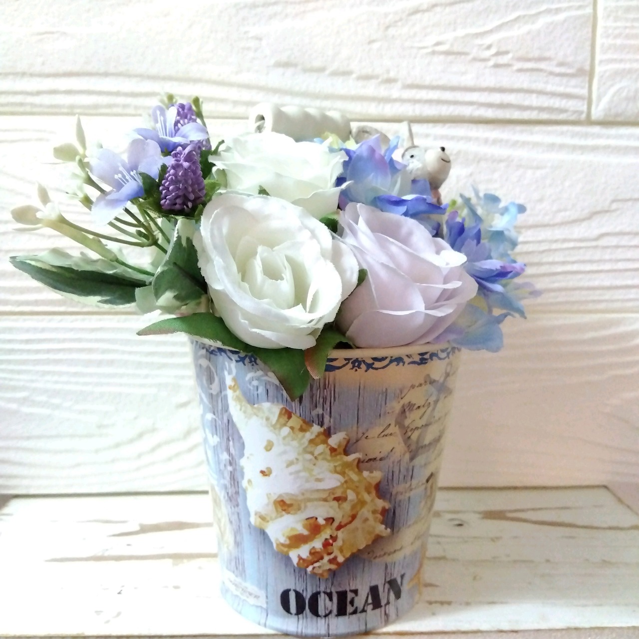 青戸白を基調として貝殻柄のブリキカンに、バラとデルフィニウム、スノーボール、小花がギュッと詰まった爽やかな商品です(*^^*)