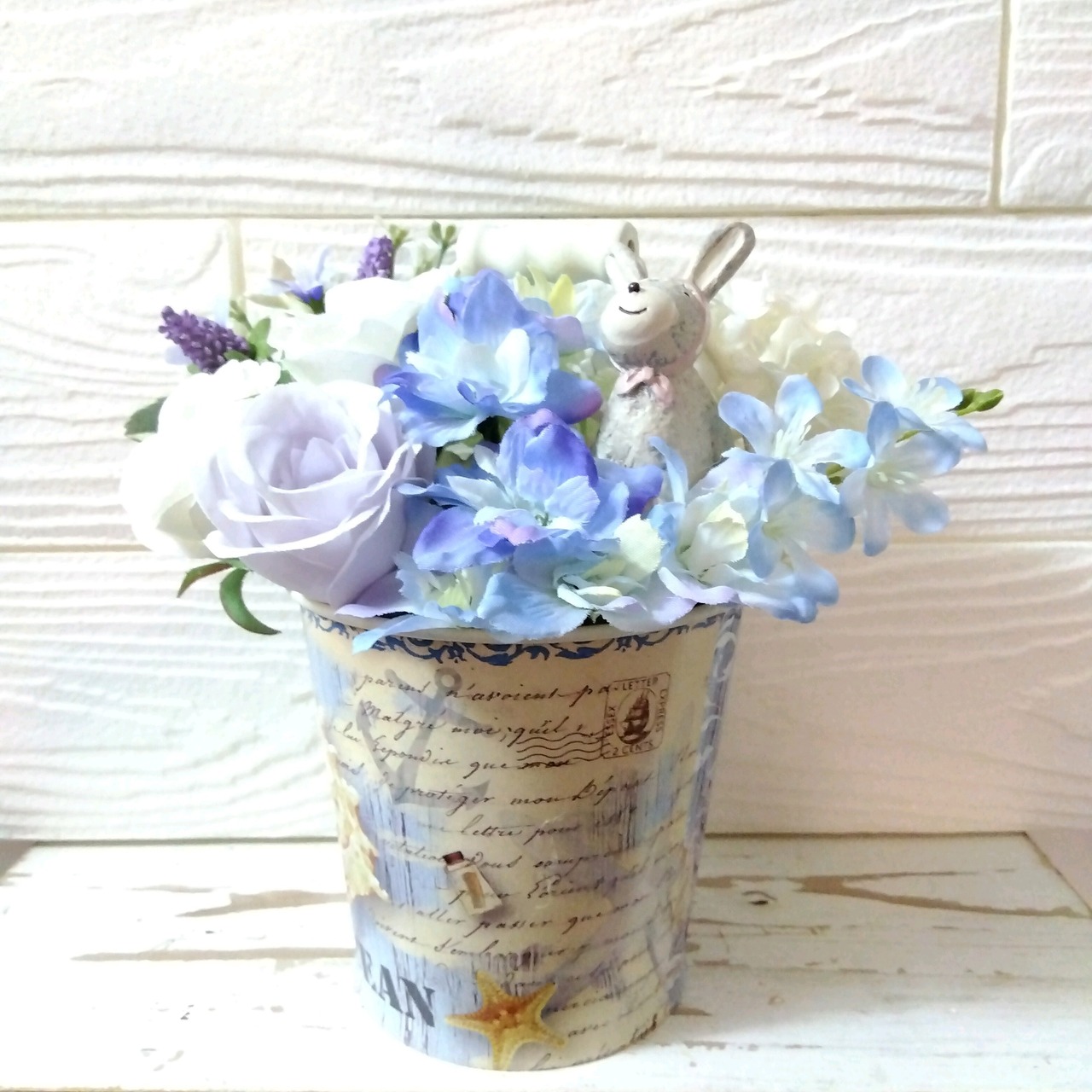 フラワーアレンジ バラ と デルフィニウム の ブルーホワイト アレンジ ウサギ