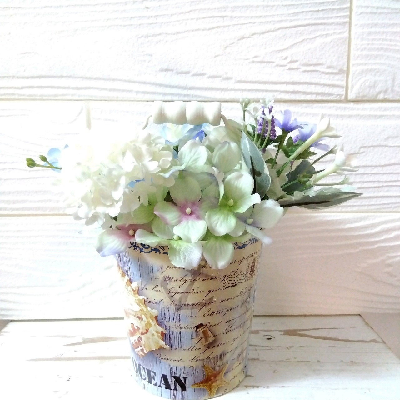 青戸白を基調として貝殻柄のブリキカンに、バラとデルフィニウム、スノーボール、小花がギュッと詰まった爽やかな商品です(*^^*)