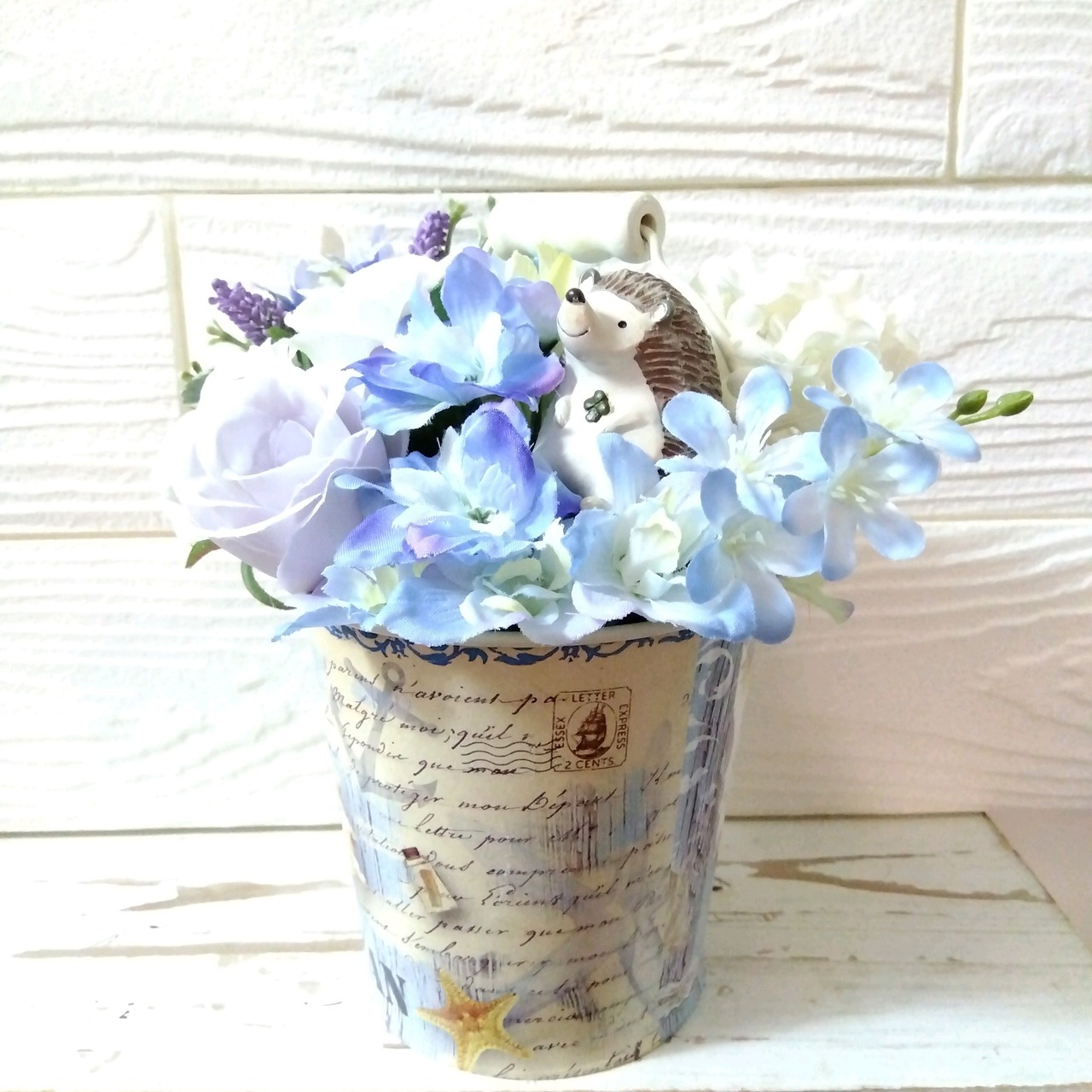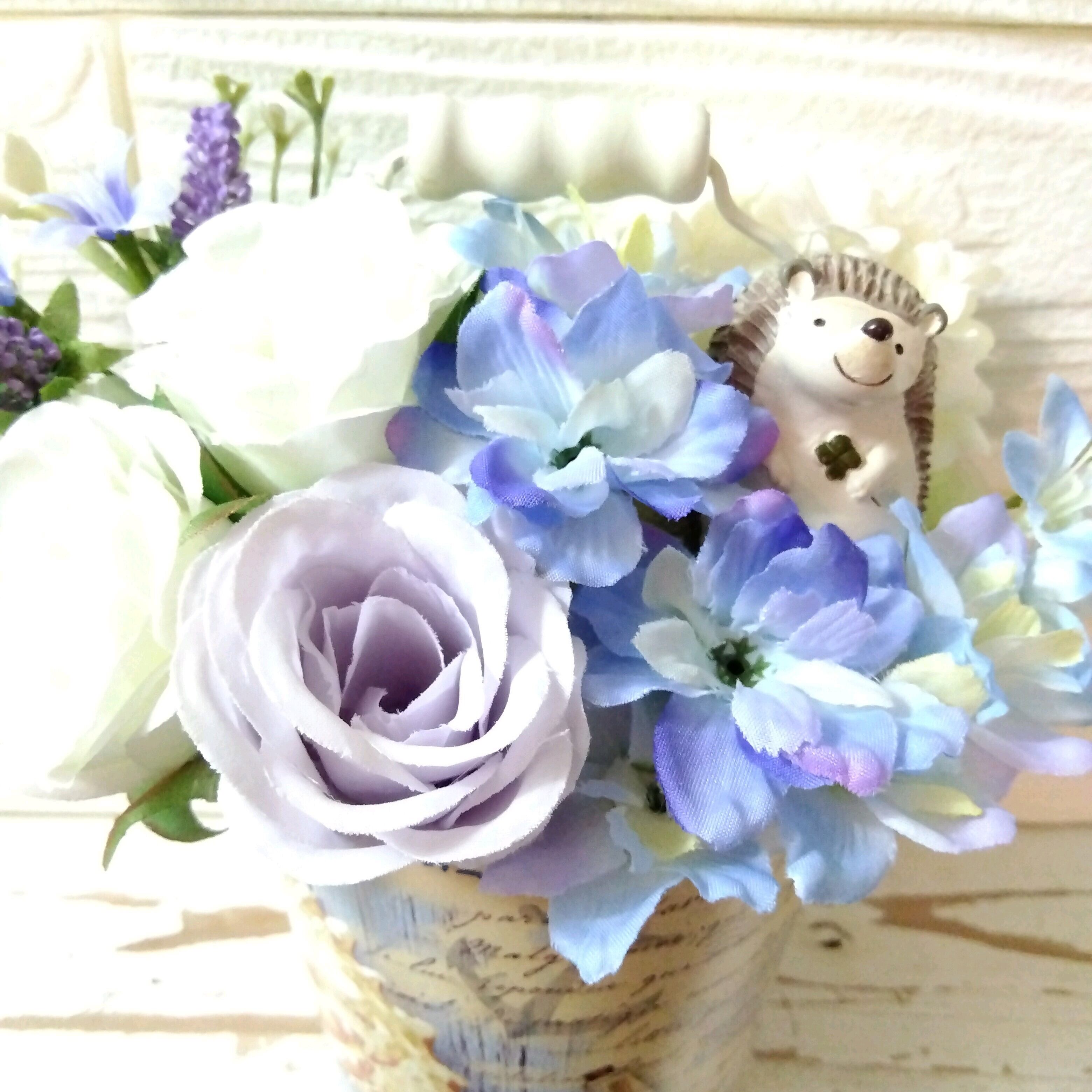 フラワーアレンジ バラ と デルフィニウム の ブルーホワイト アレンジ ハリネズミ