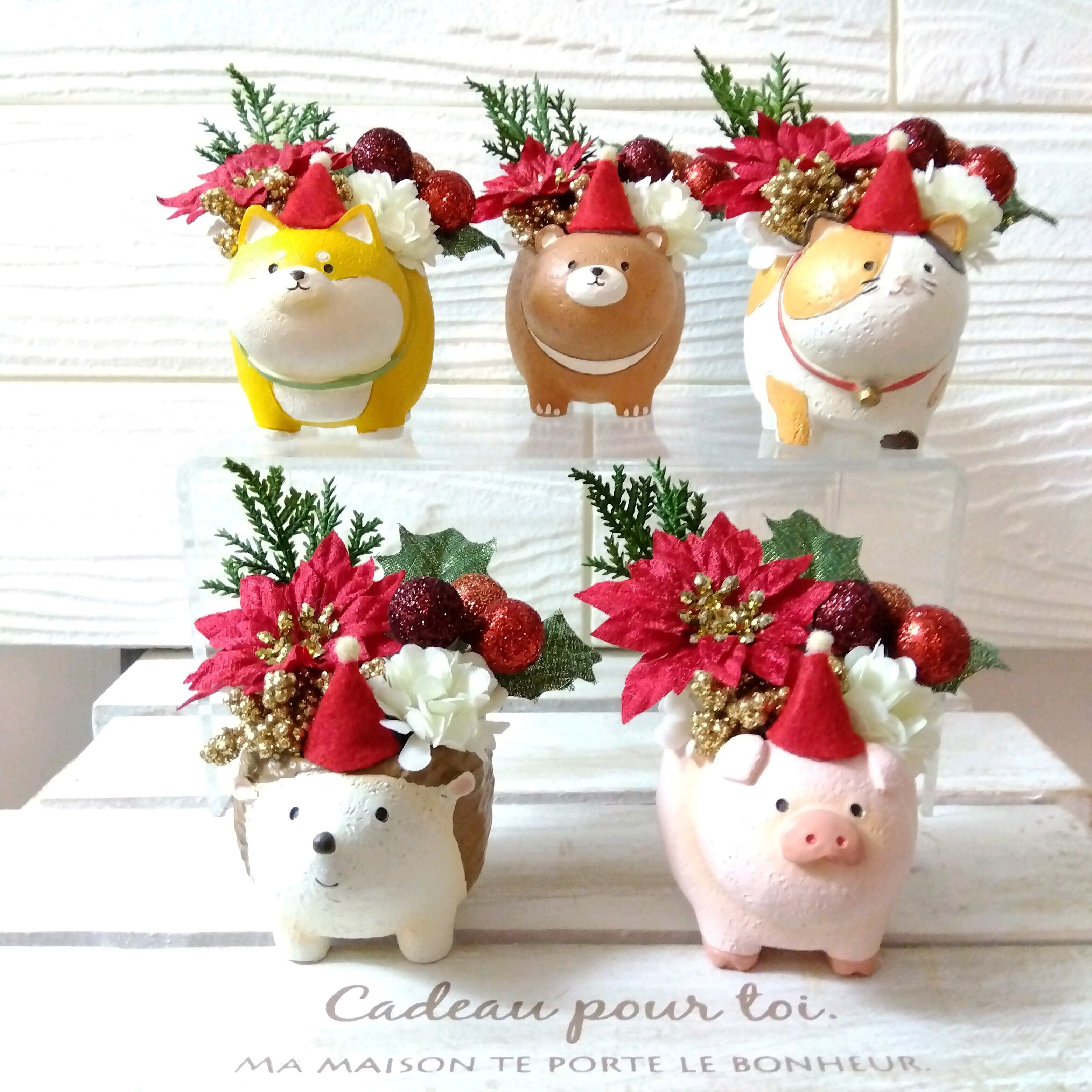 アニマル の背中にポインセチアやヒイラギや小さなお花がギュッと詰まった商品です。