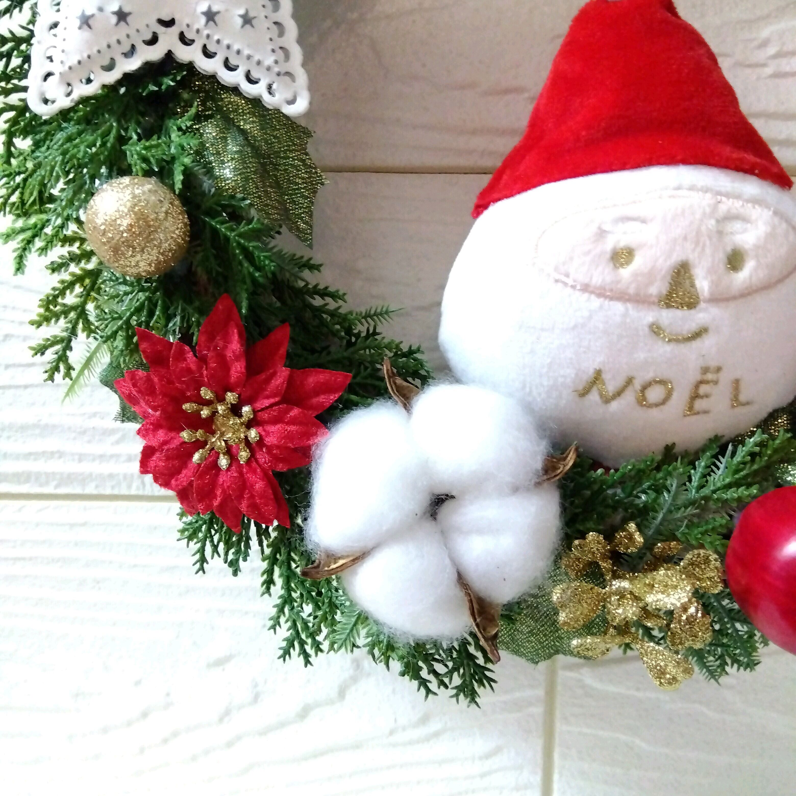 ポインセチア、コットン、リンゴにと葉っぱをギュッと詰ったかわいらしいリースです(*^^*)