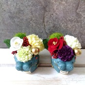 可愛らしい干支の辰の器に、椿、グリーンボール、小花などを使用し可愛らしく華やかな仕上げりです♪
