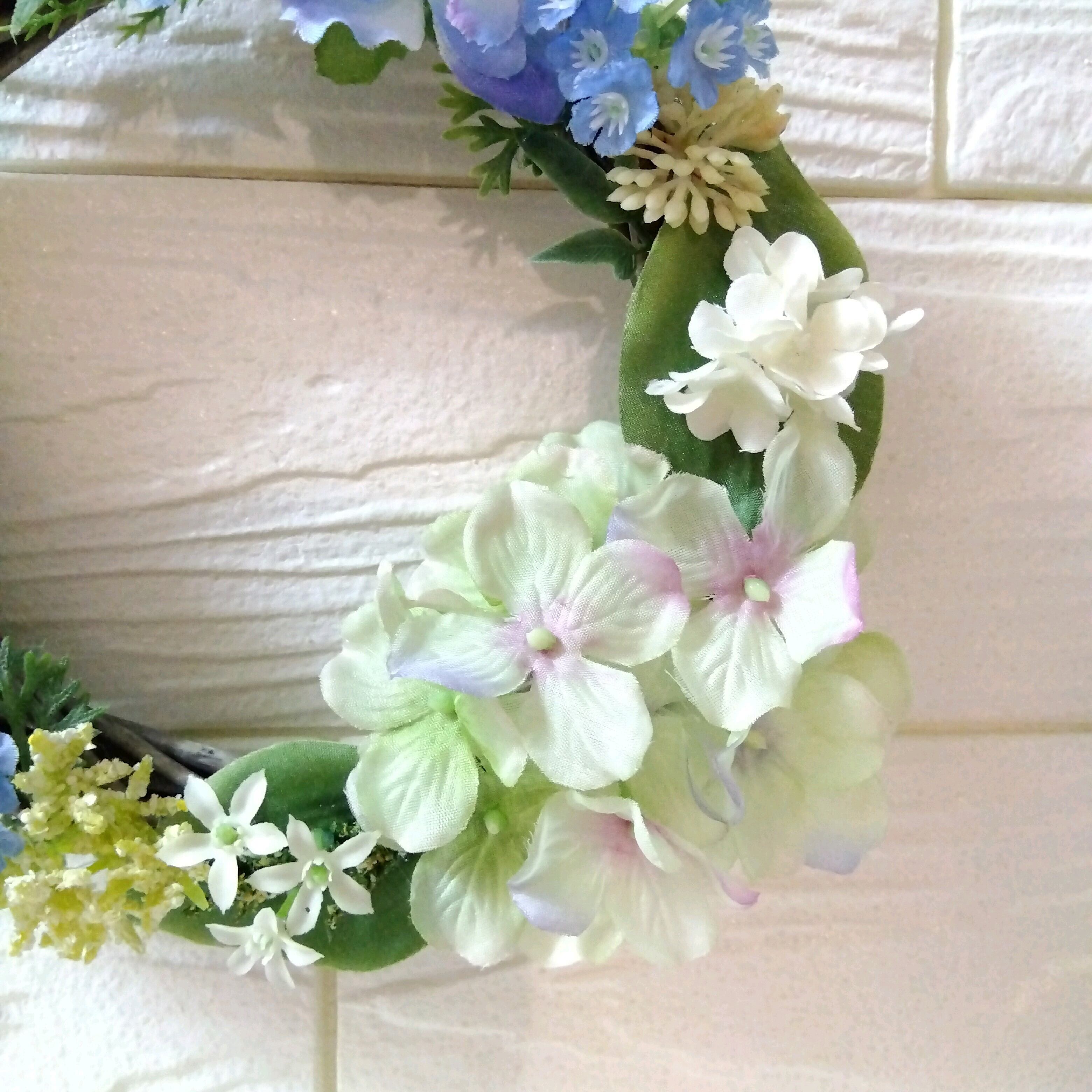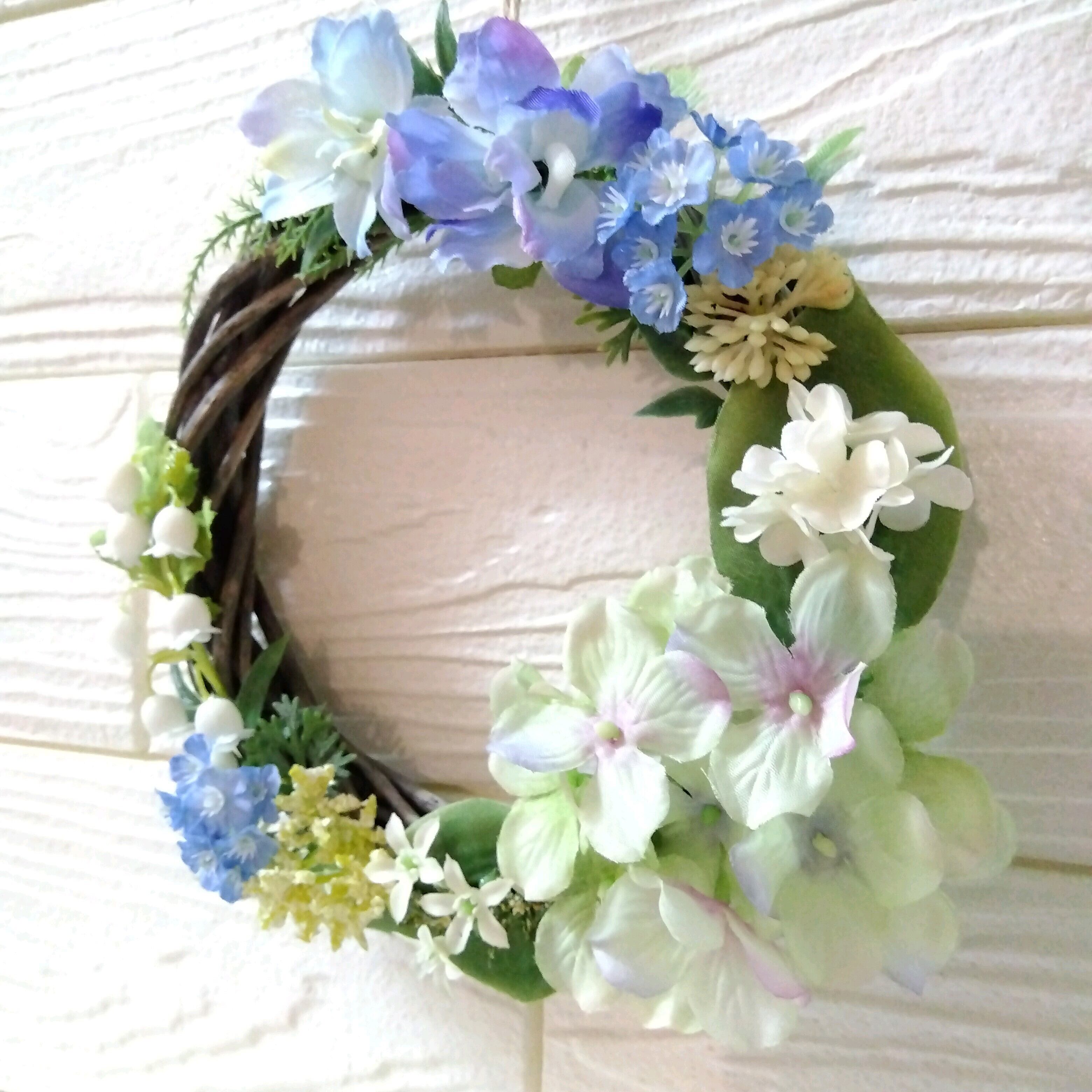 母の日 父の日 プレゼント ギフト 送別品 贈呈品 結婚式 フラワーアレンジ 退職 敬老の日 インテリア アーティフィシャルフラワー 誕生日 新築祝い 開店祝い 癒し グリーン リース デルフィニウム スズラン 結婚祝い ブルー 紫陽花 アジサイ あじさい