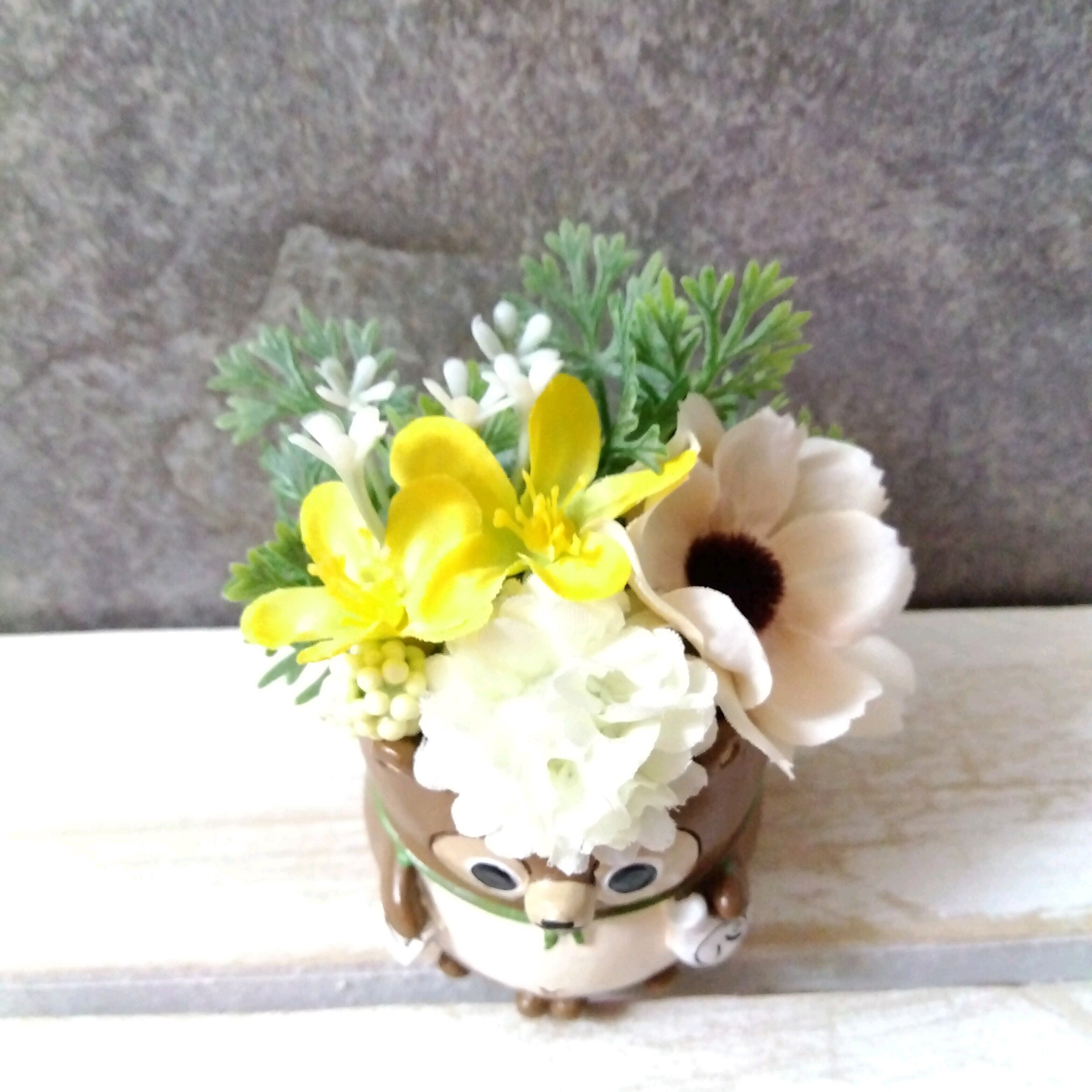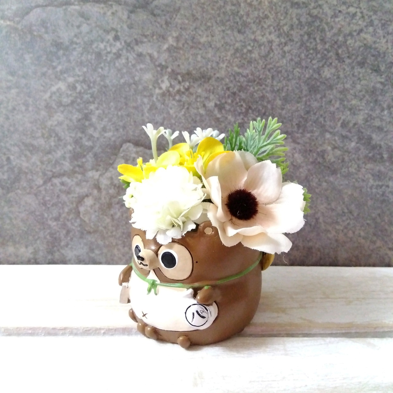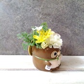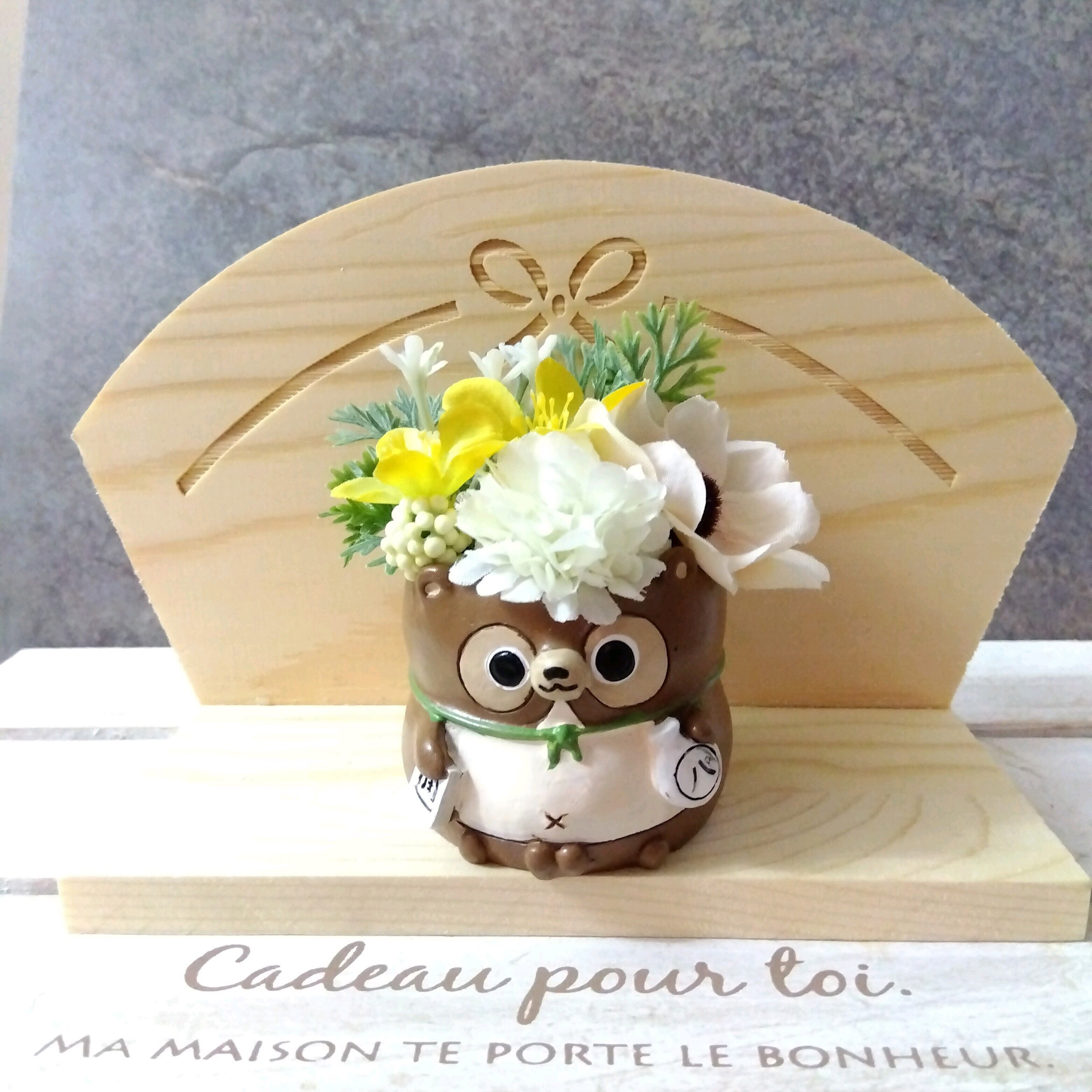 タヌキ の器にアネモネ、小花、グリーンなど小さなお花がギュッと詰まった可愛らしい商品です。