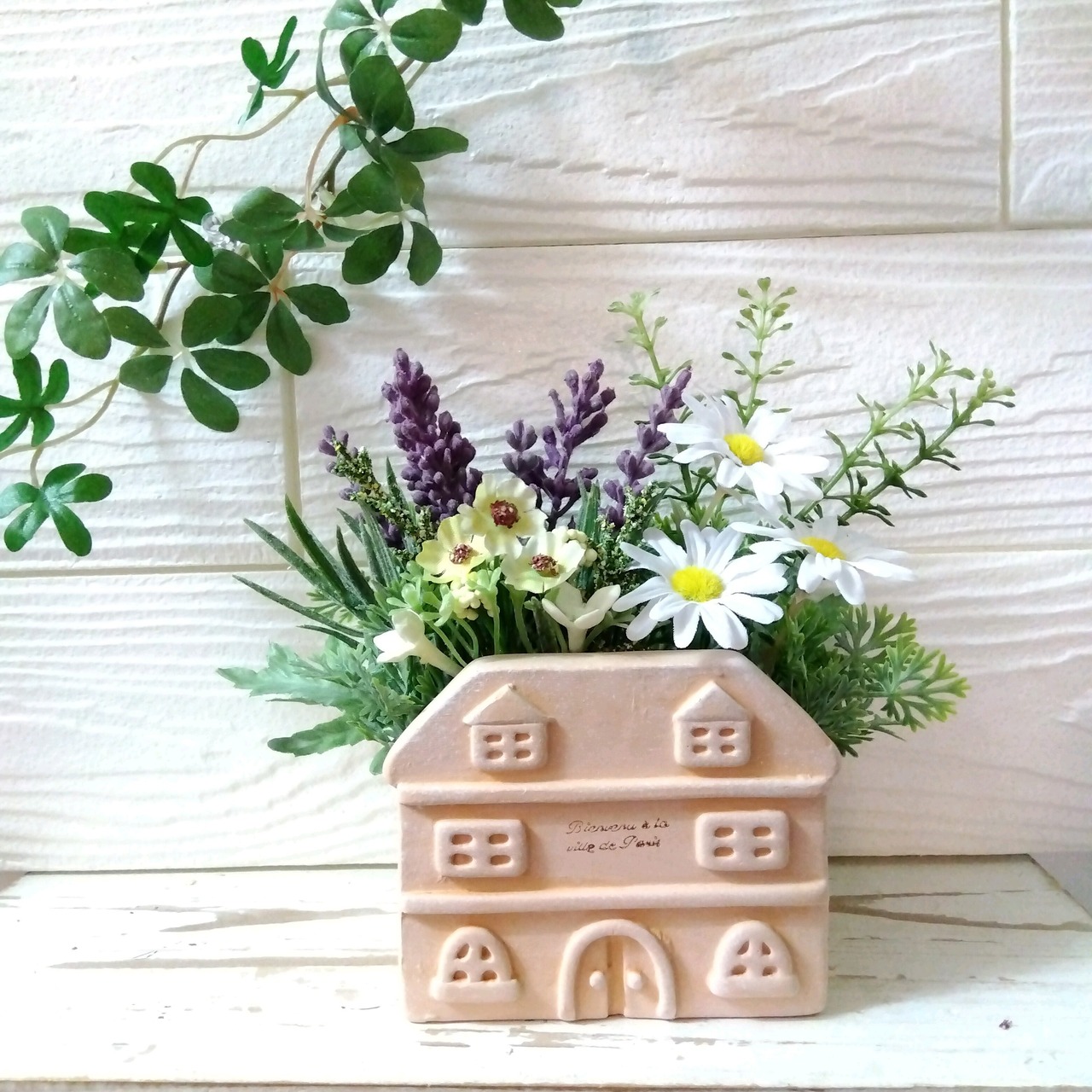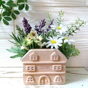 レンガ調の可愛らしいハウスの陶器の器にラベンダー、ナズナ、デイジー、小花、グリーン、など小さなお花がギュッと詰まった爽やかな可愛らしい商品です。