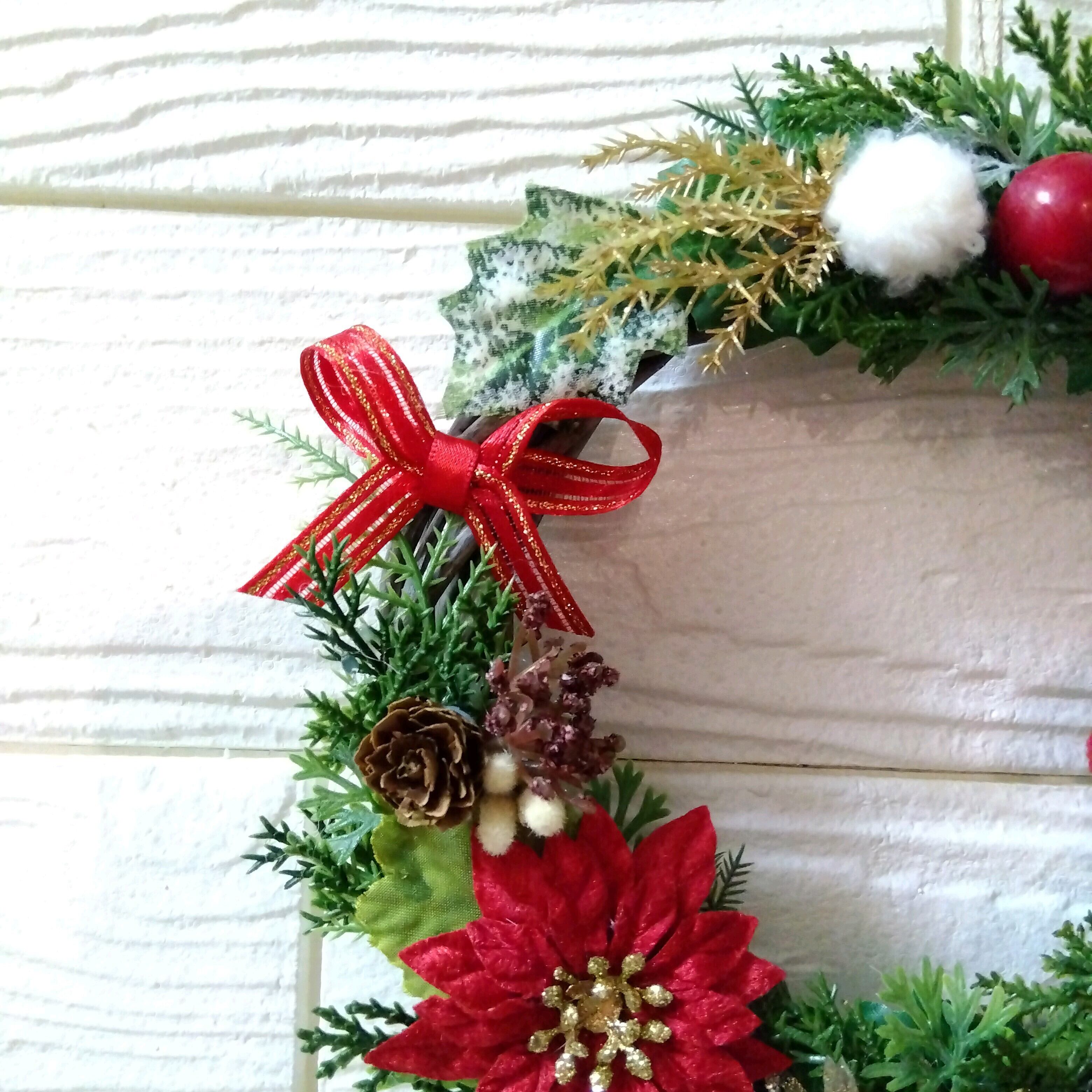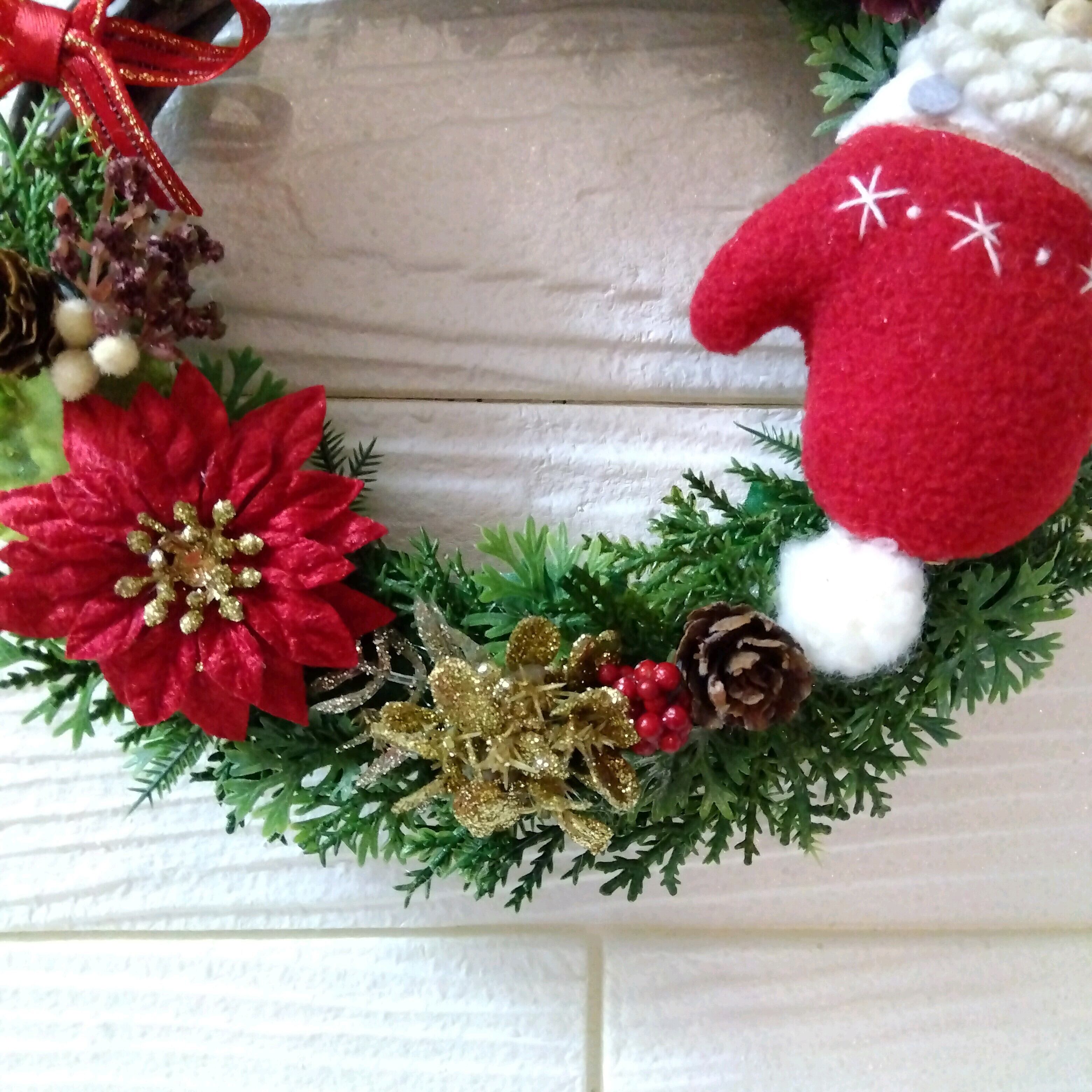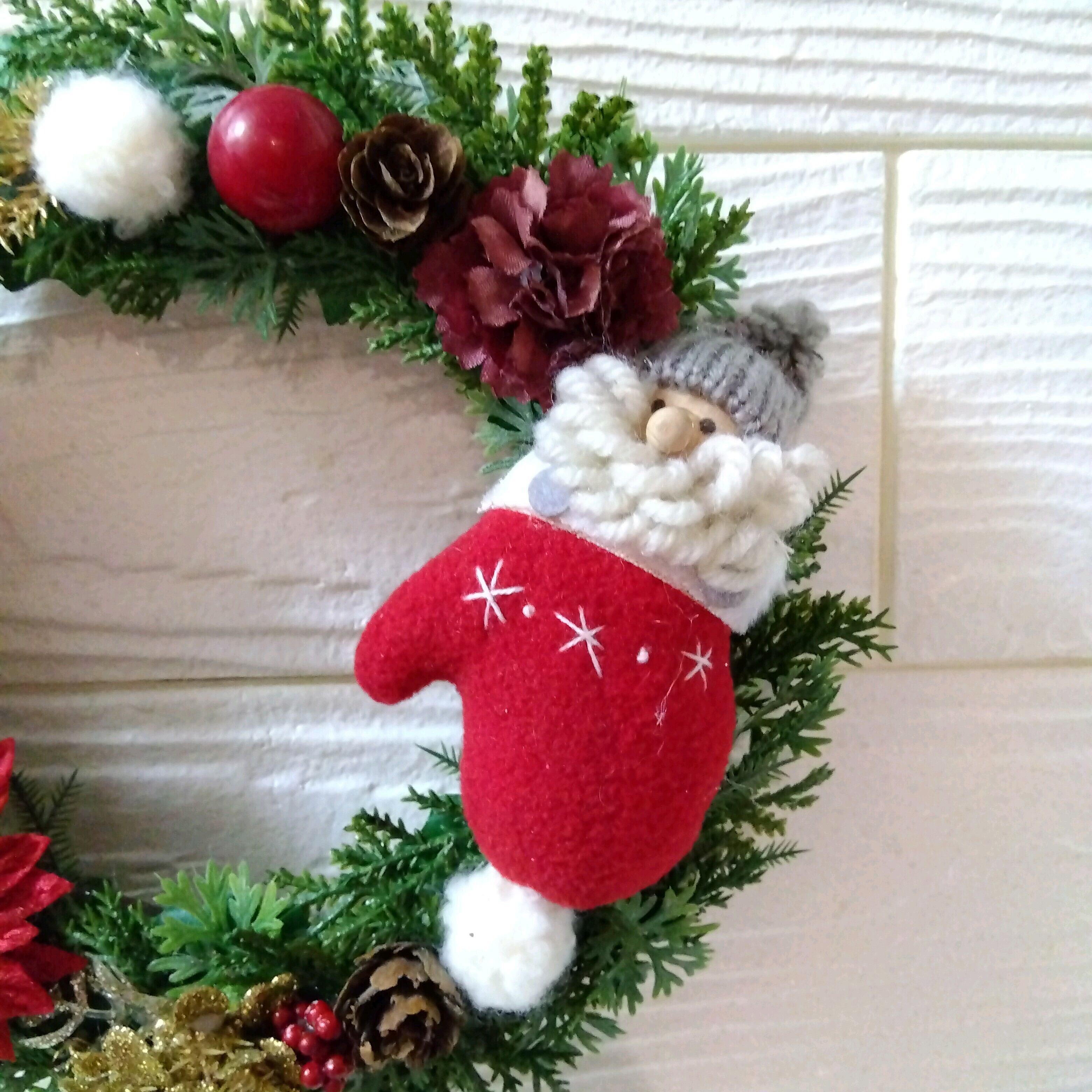 かわいいサンタさん付きの造花(アーティフィシャルフラワー)でできた小さめのクリスマスリースです!