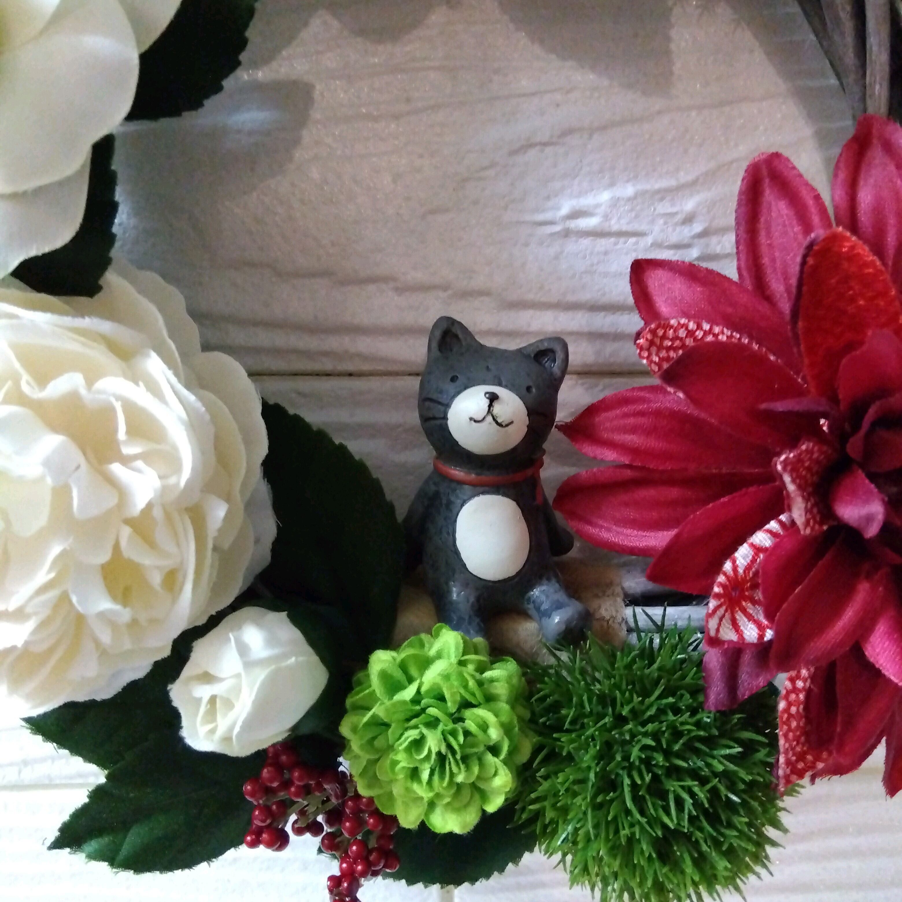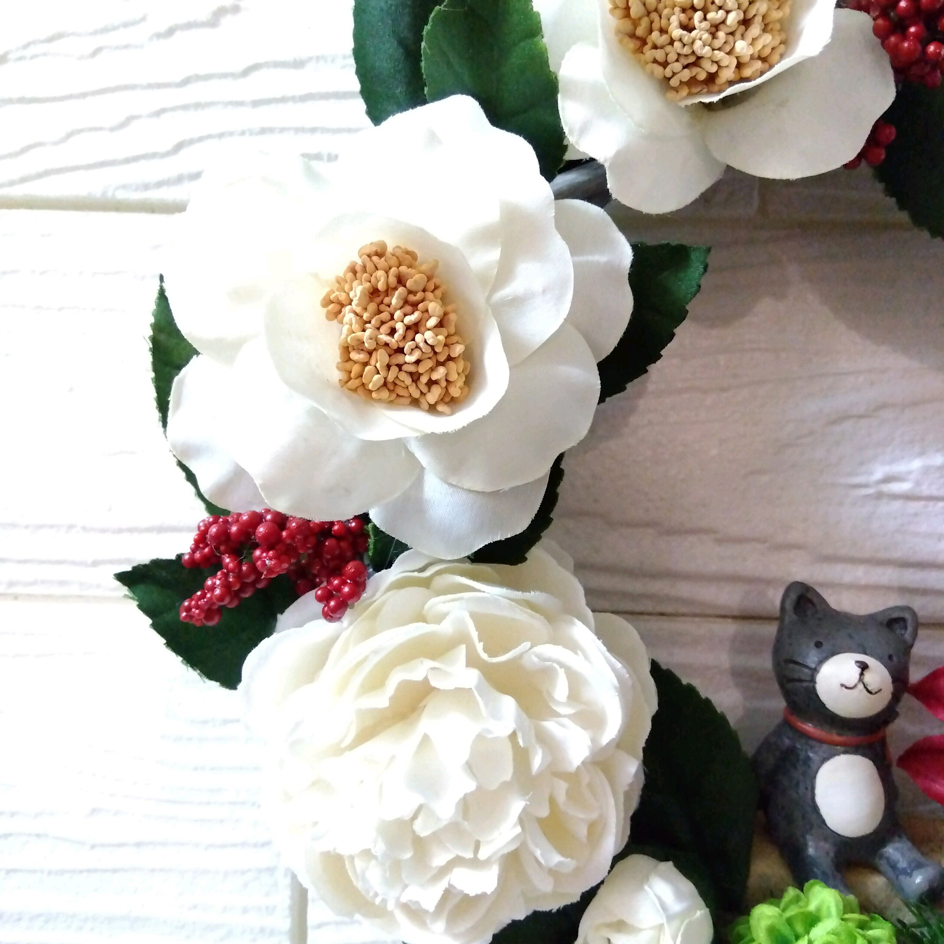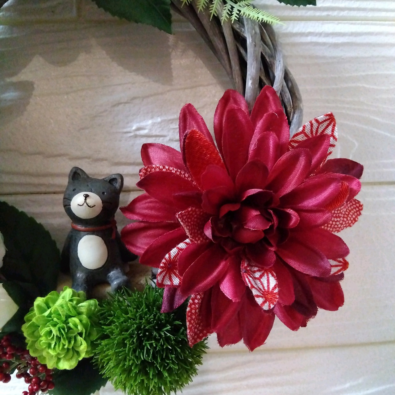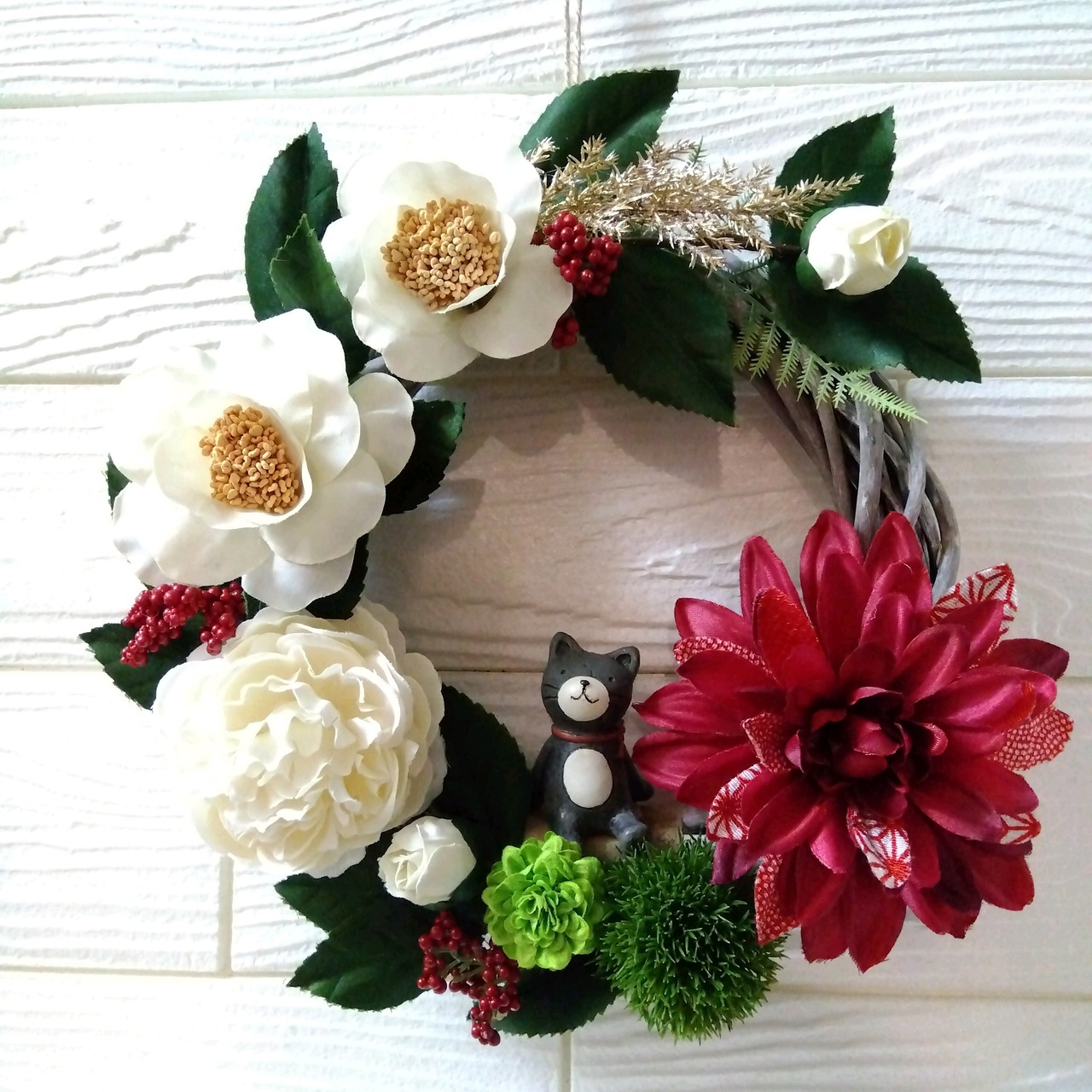 お正月 ダリア と 椿 の 和風リース 紅白 ネコ