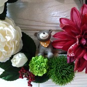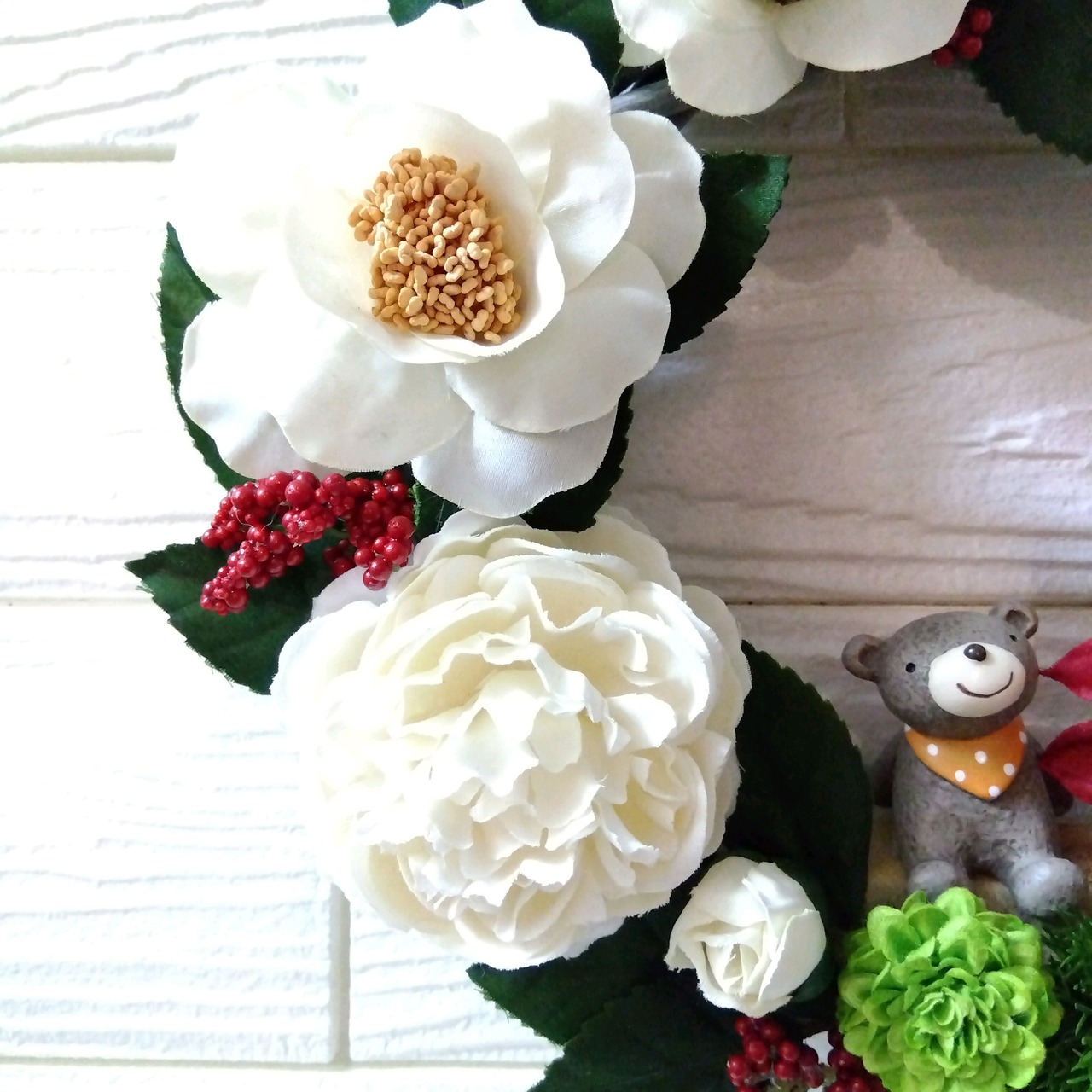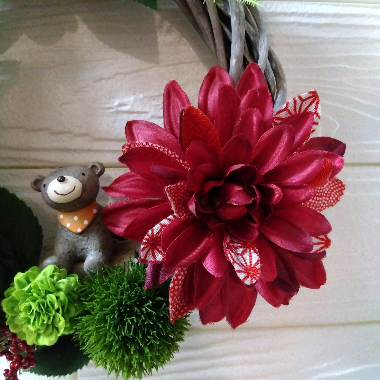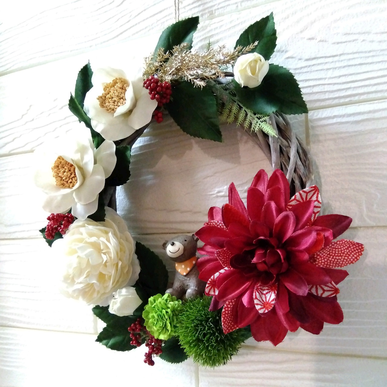 お正月 ダリア と 椿 の 和風リース 紅白 クマ