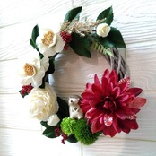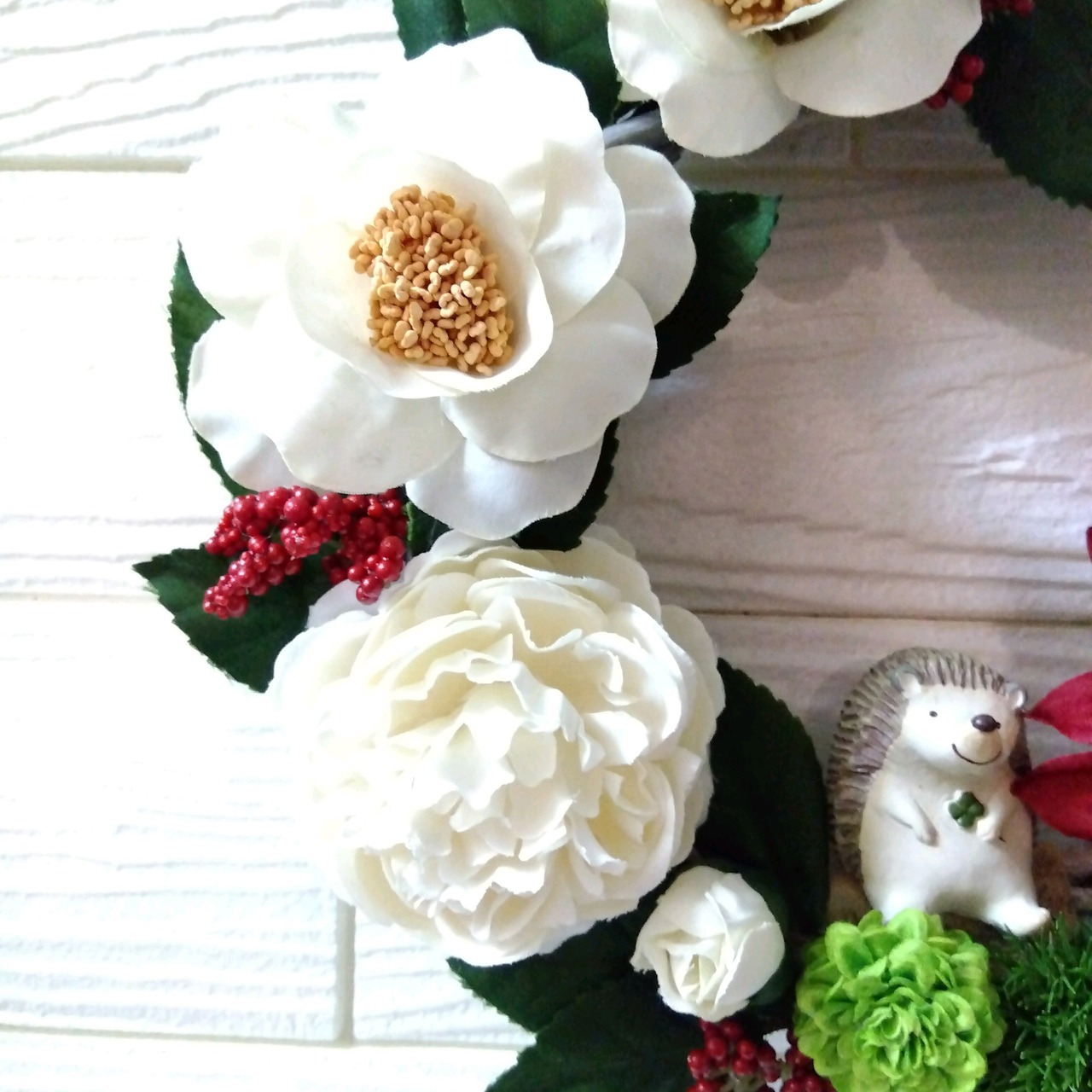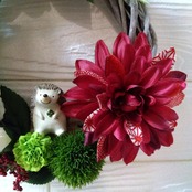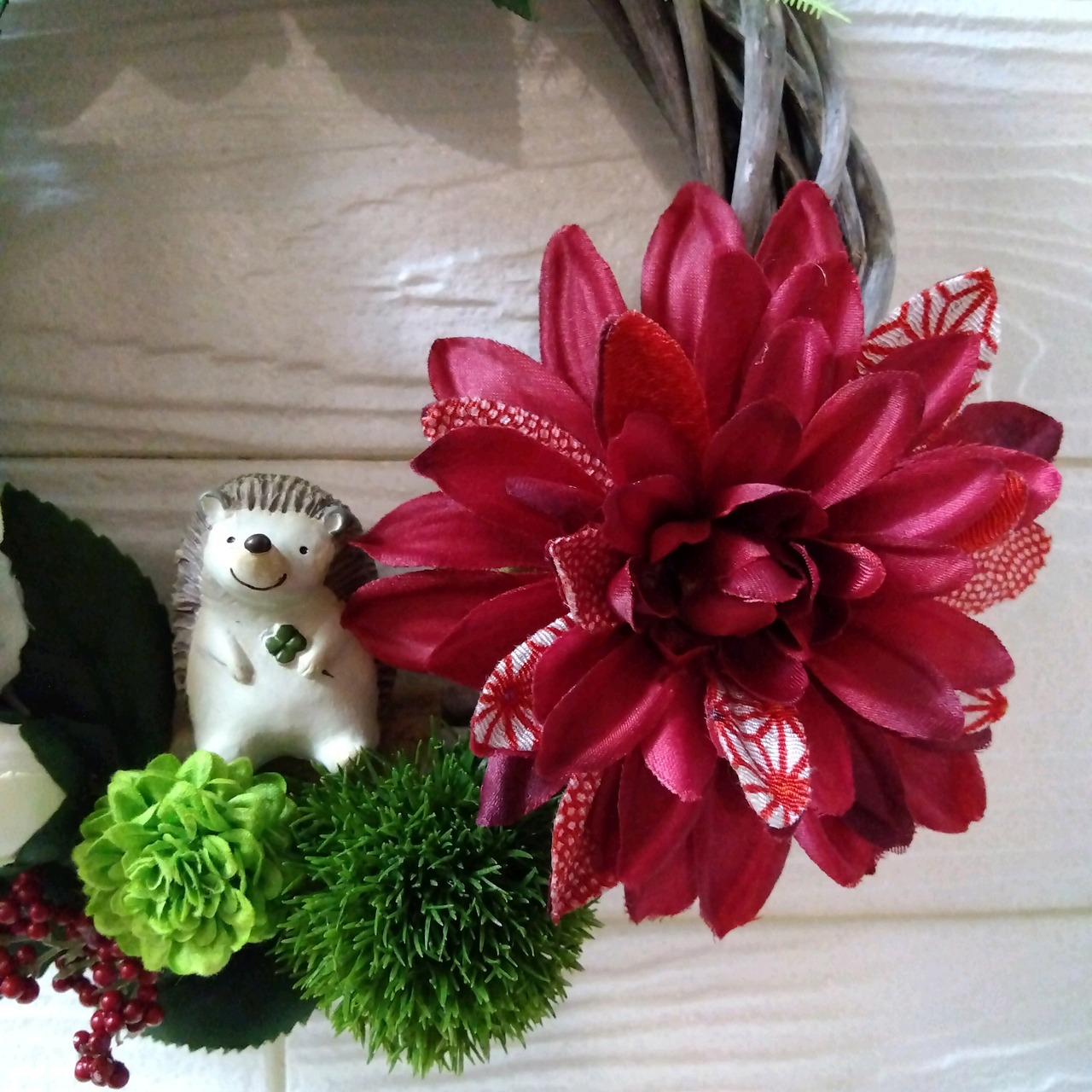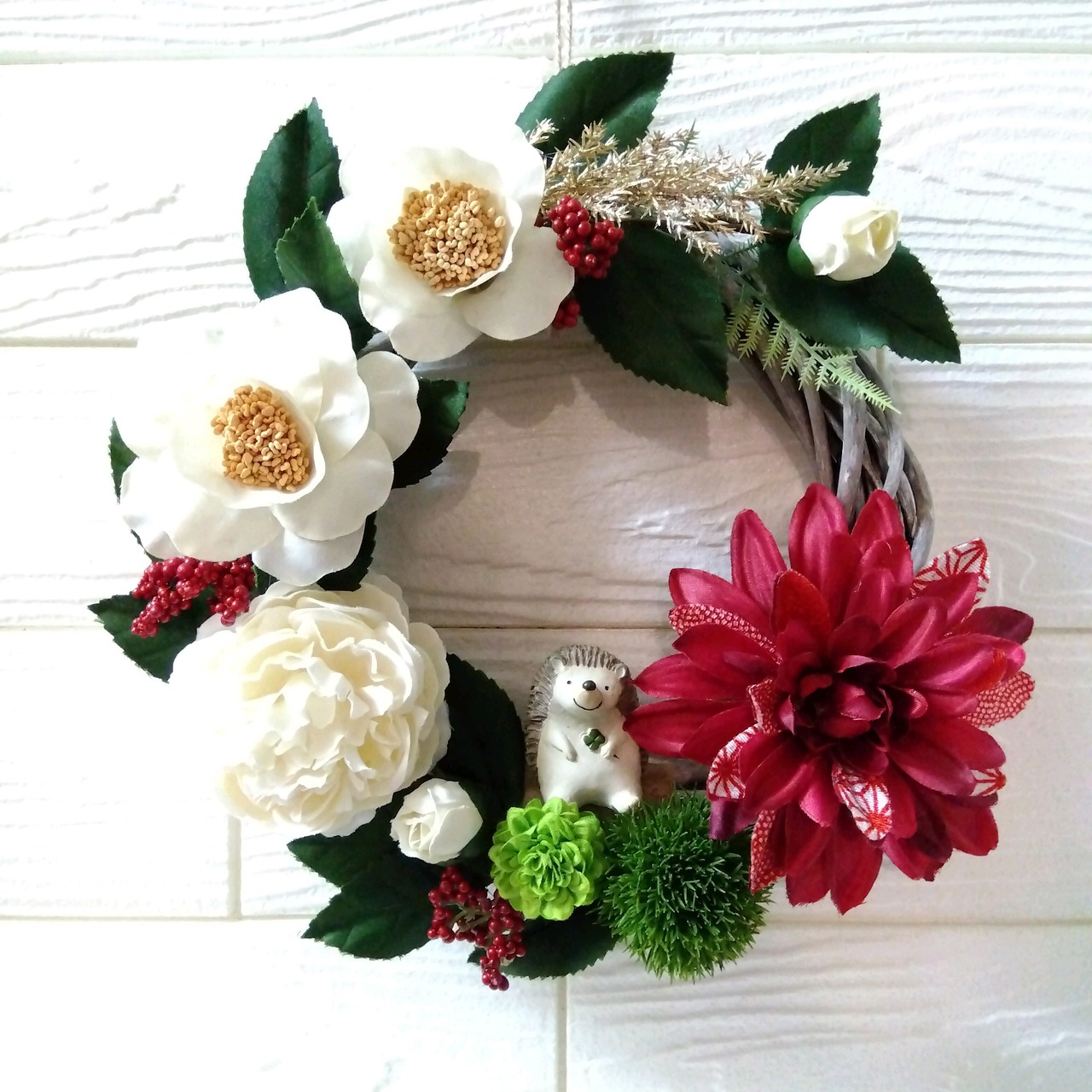 お正月 ダリア と 椿 の 和風リース 紅白 ハリネズミ