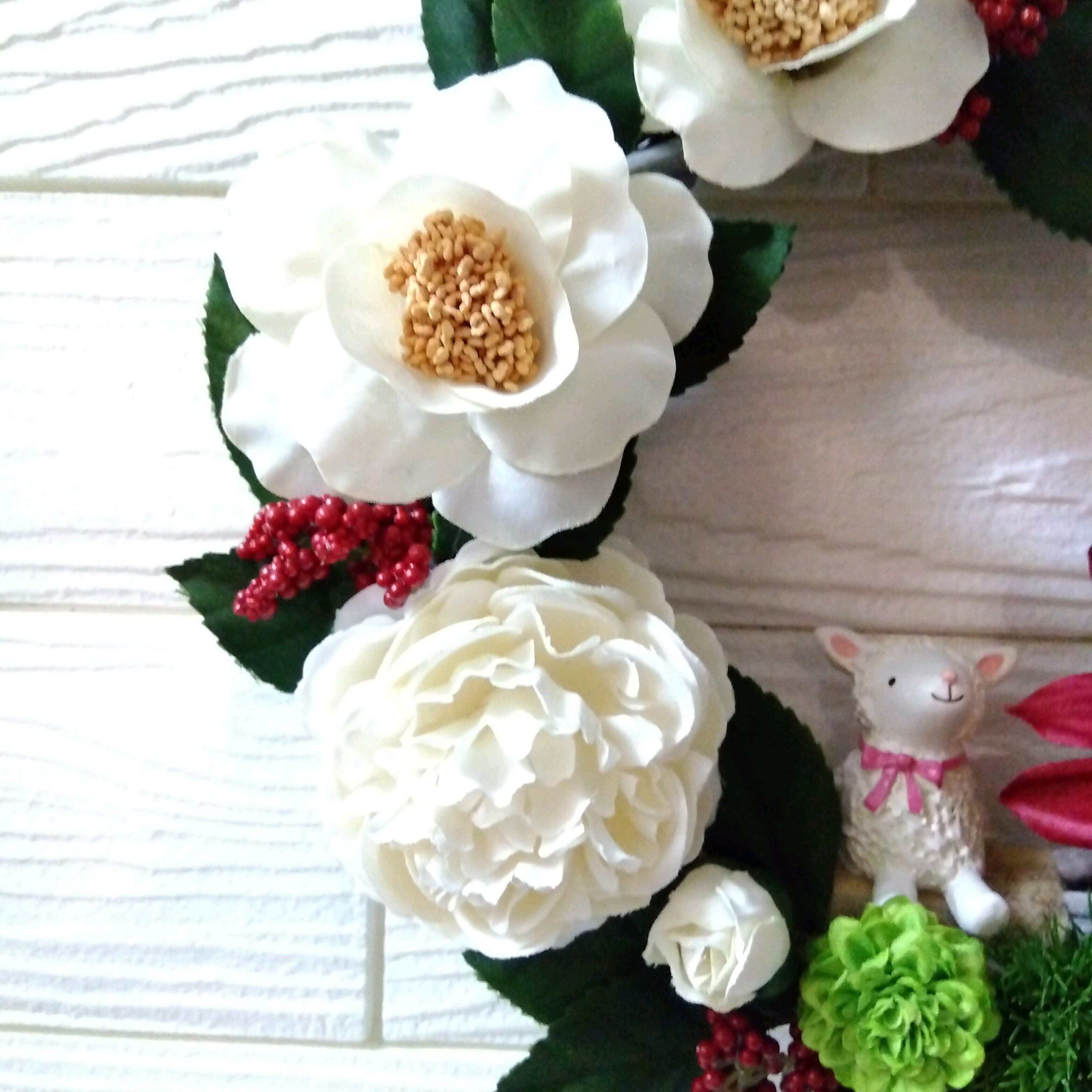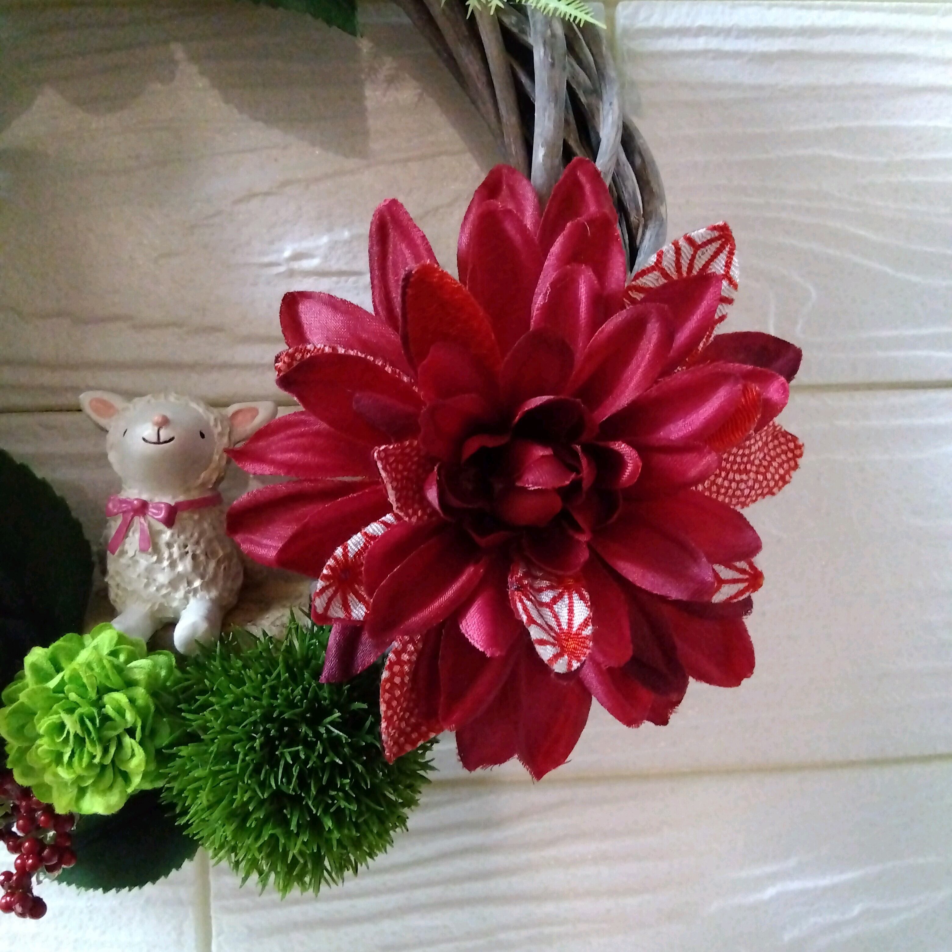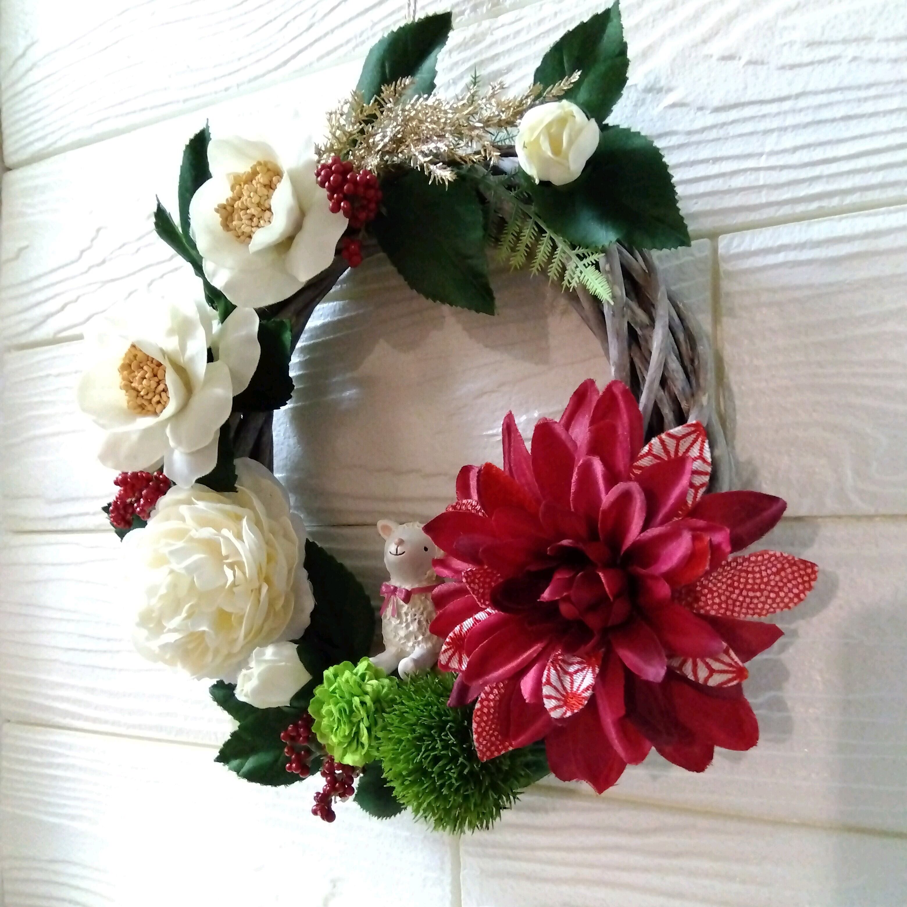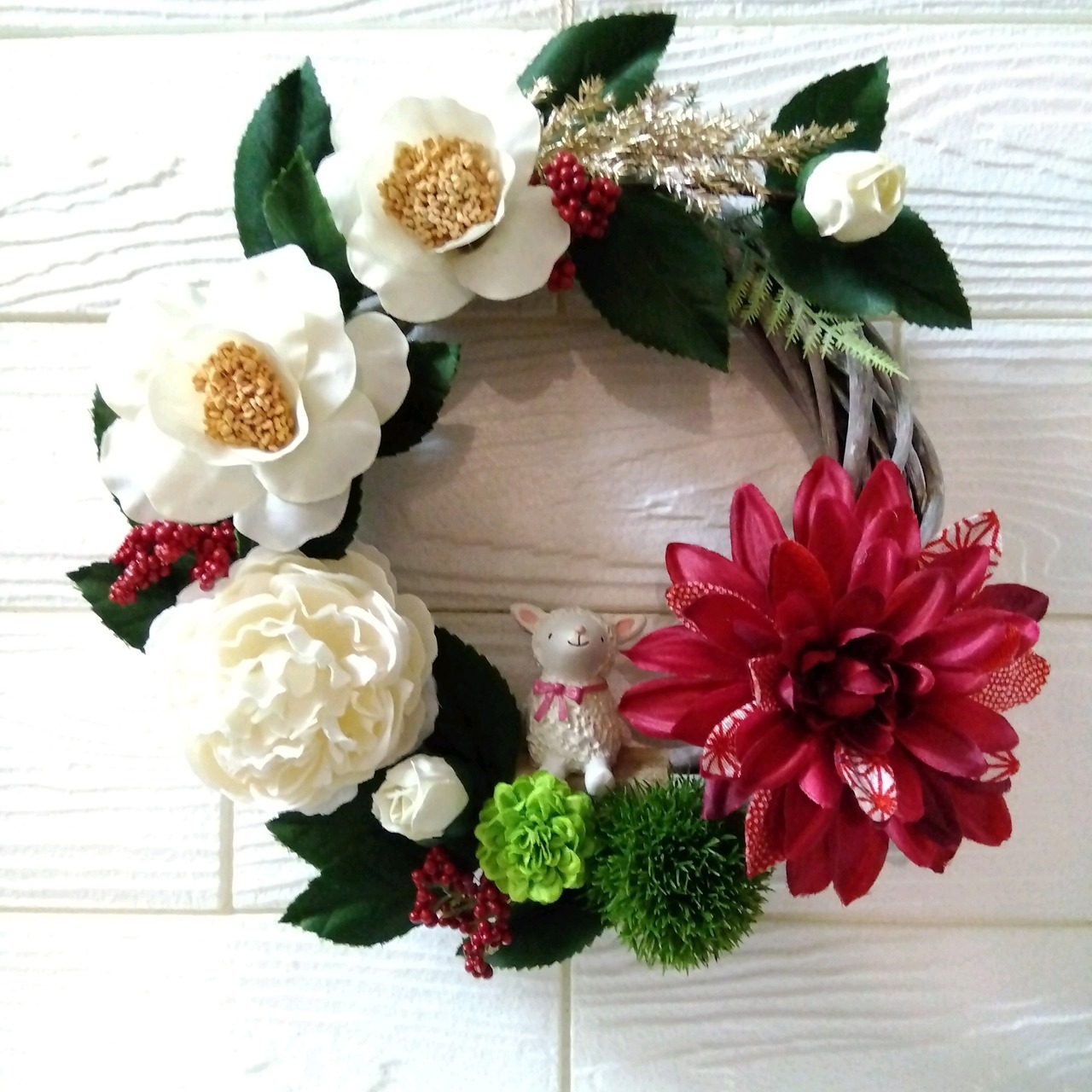 お正月 ダリア と 椿 の 和風リース 紅白 ヒツジ